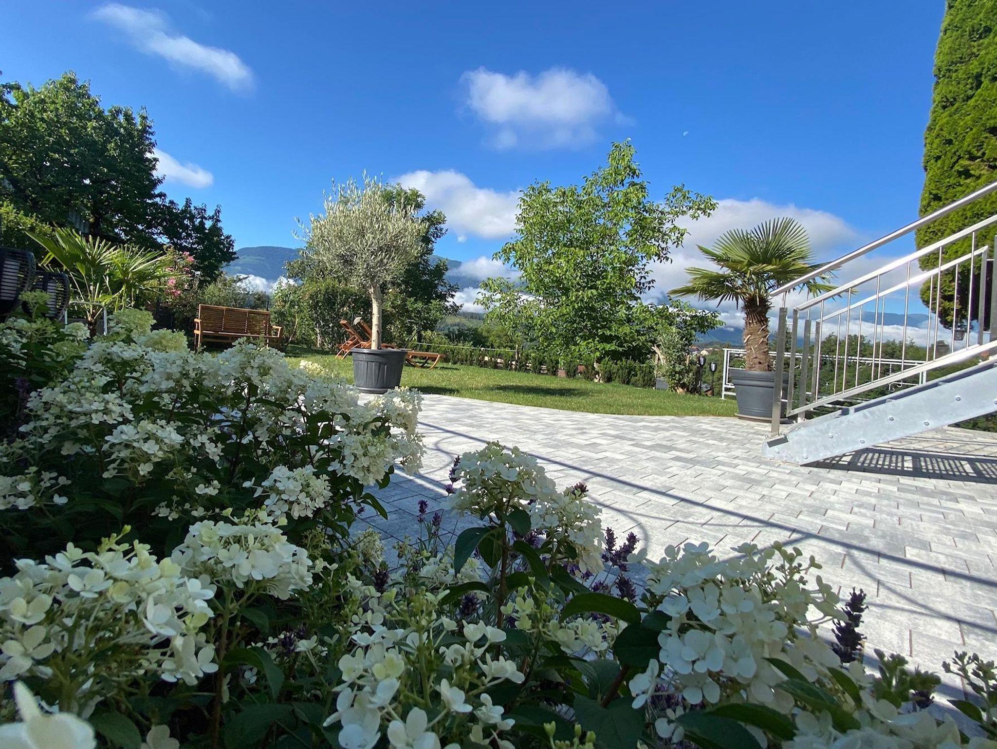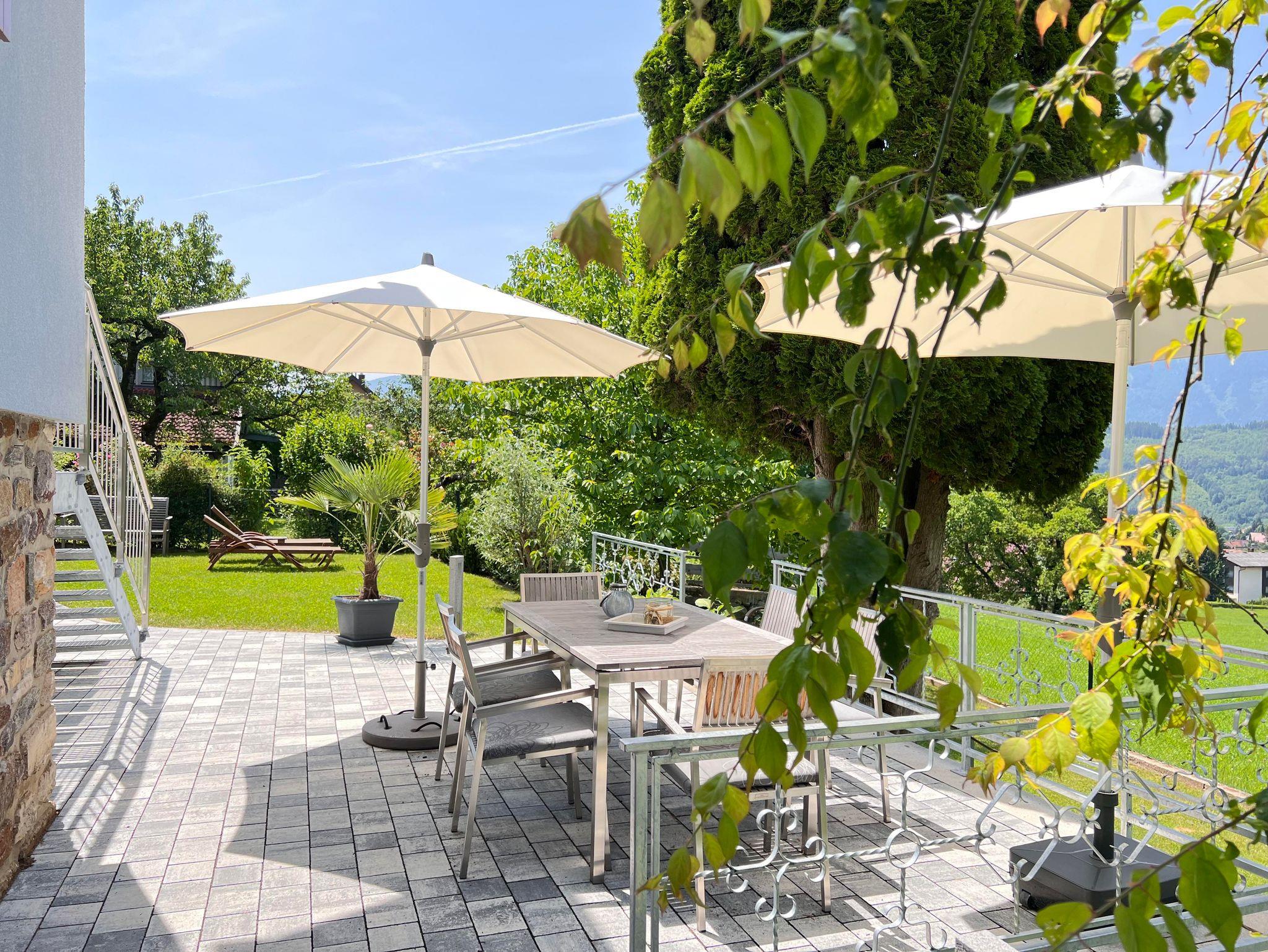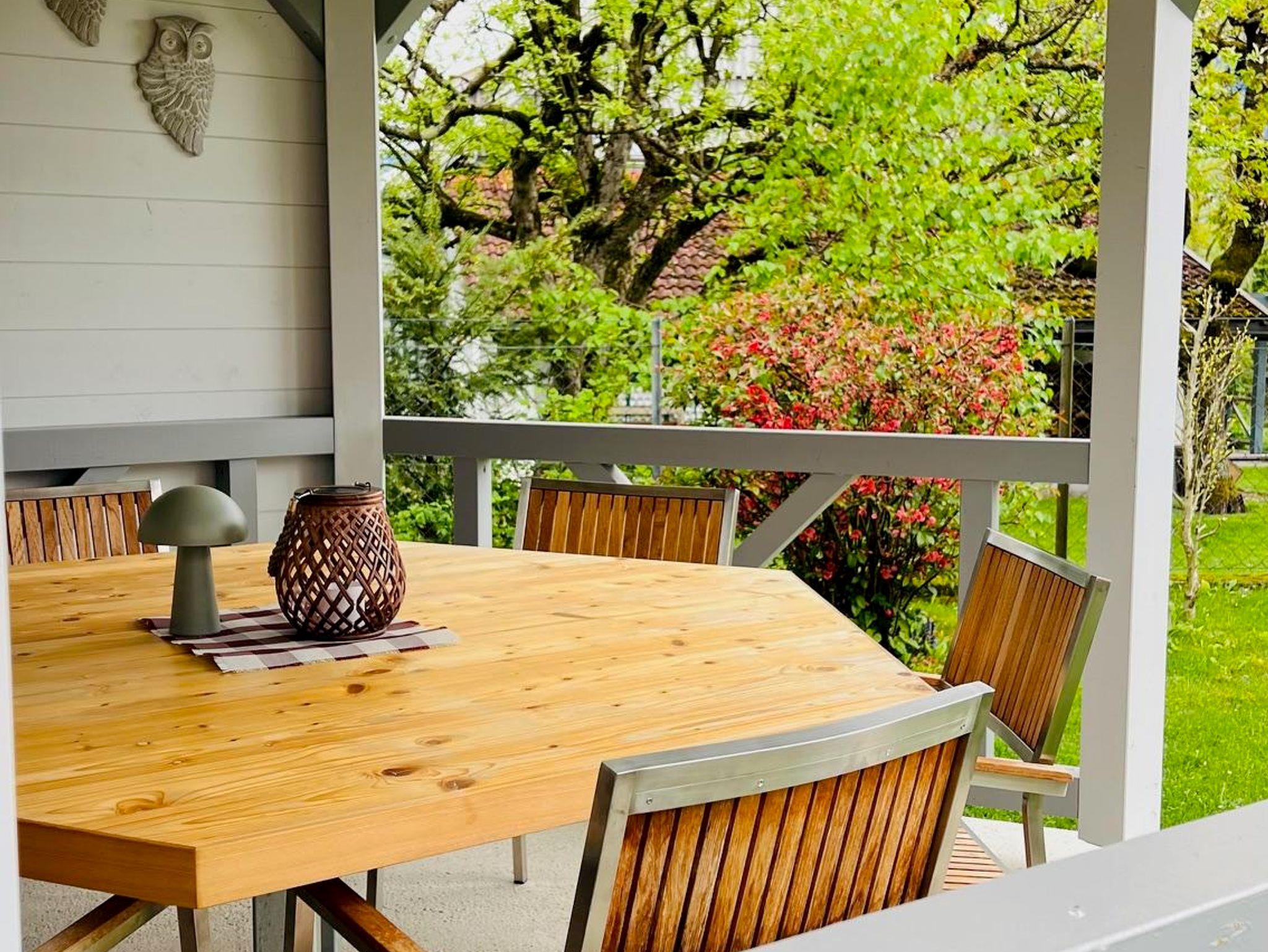 Terrasse möbliert mit Esstisch, Stühlen und Sonnenschirm; Sonnenliegen im Garten, Holzpavillon komplett ausgestattet mit Esstisch und Stühlen, Bäume als natürliche Schattenspender. Grill, Gartenfläche 2/3 eingezäunt; 1 abschließbare Garage und 2 kostenlose Autostellplätze im Freien;