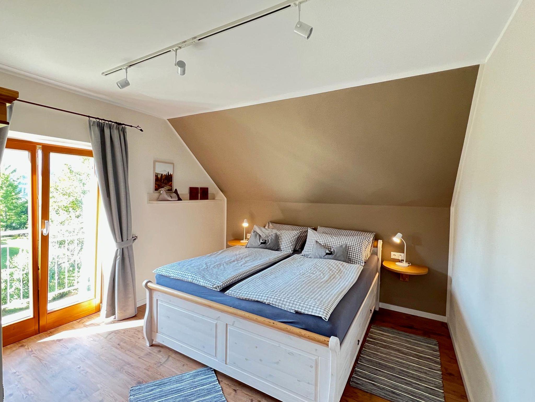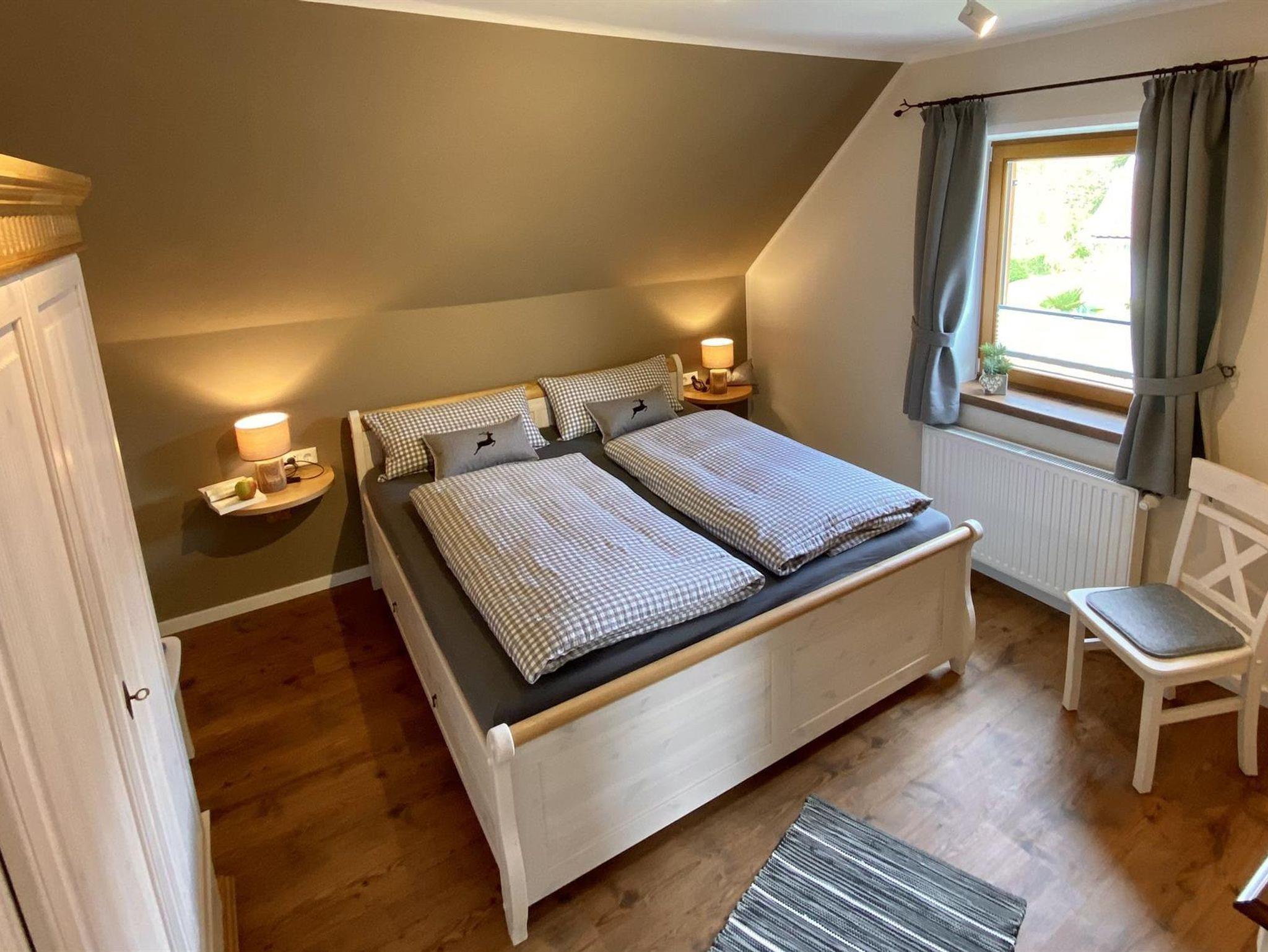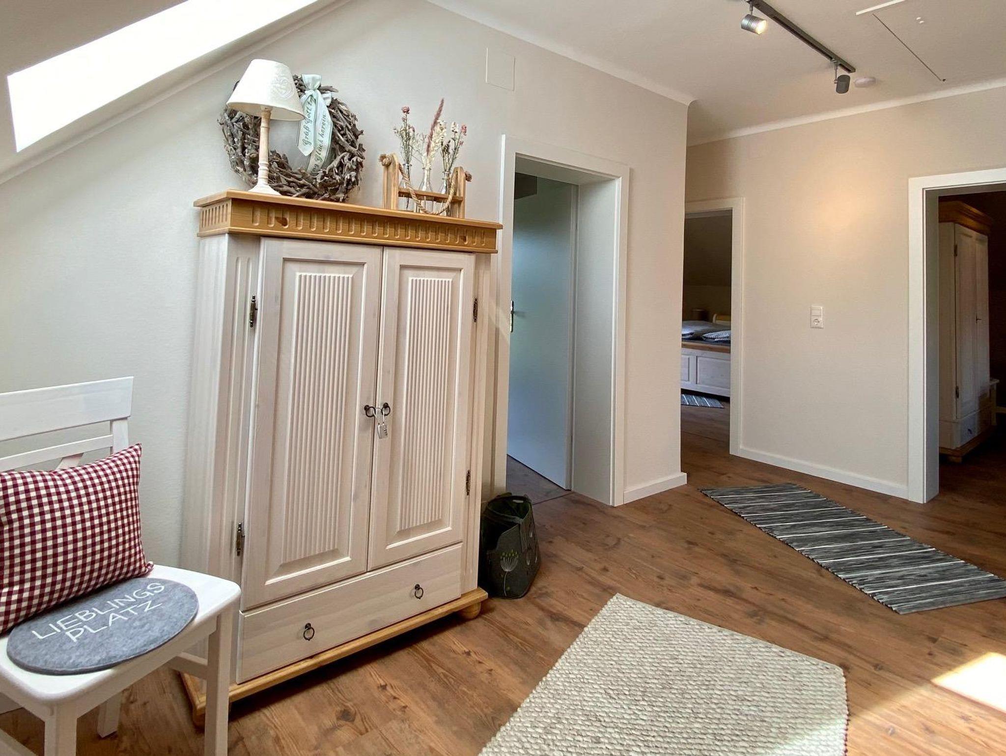 drei Schlafzimmer im Landhausstil mit Holzbodenoptik, Vollholzmöbeln und Doppelbett, liebevollen Details und Mansarde – zwei davon mit Balkon; allesamt mit Fensterläden zum Verdunkeln, zusätzliches Duschbad / WC mit Waschbecken;