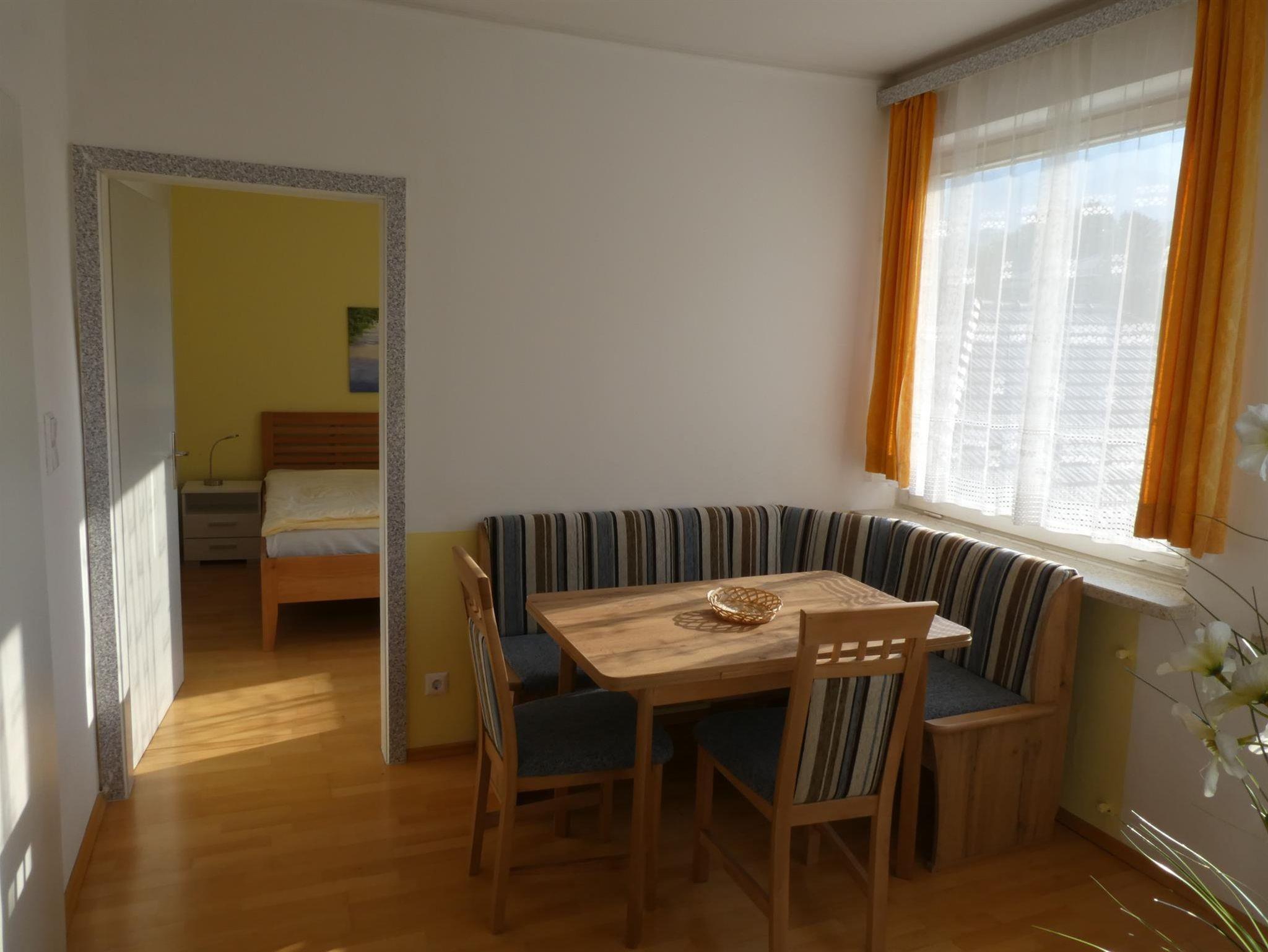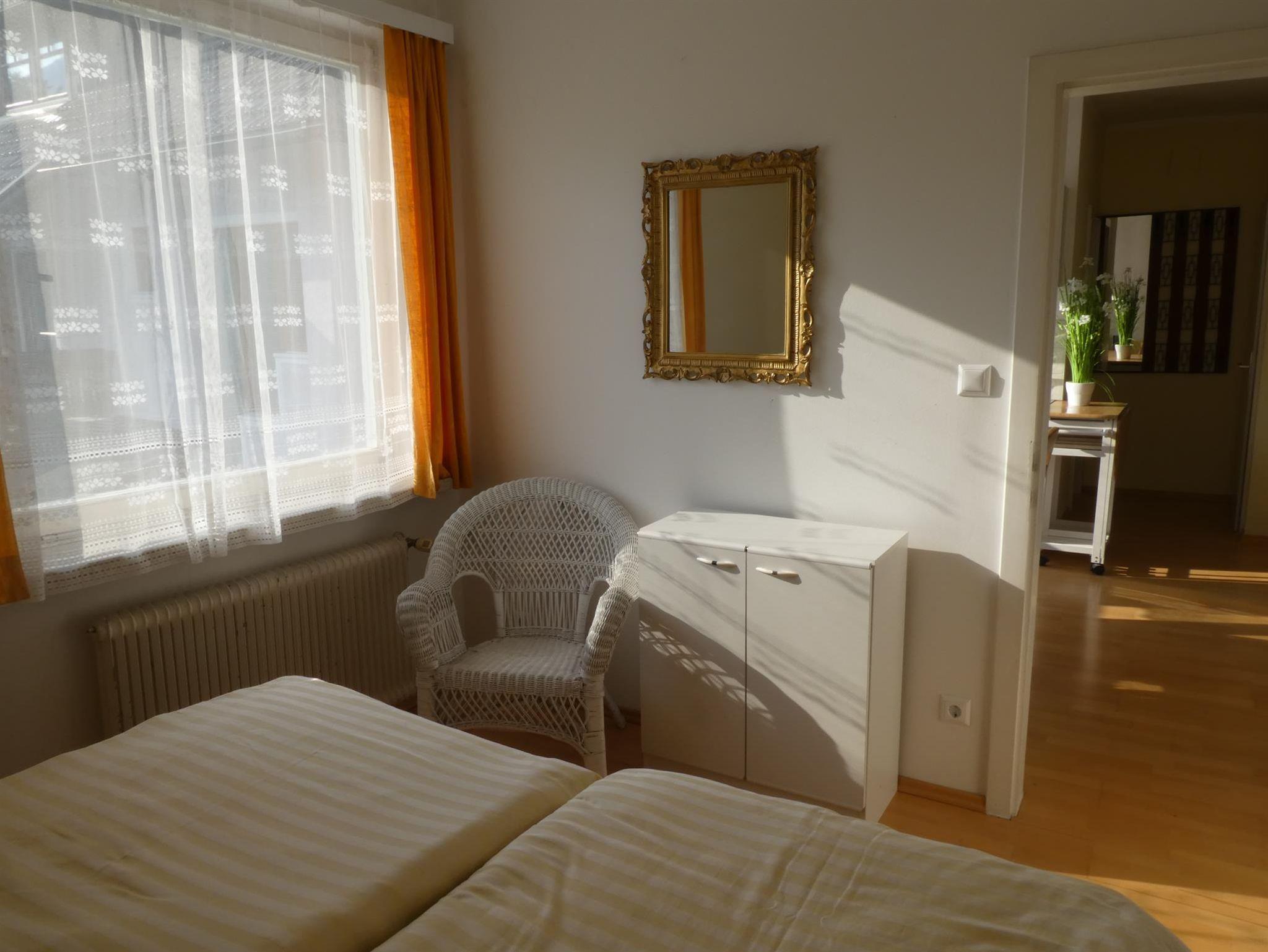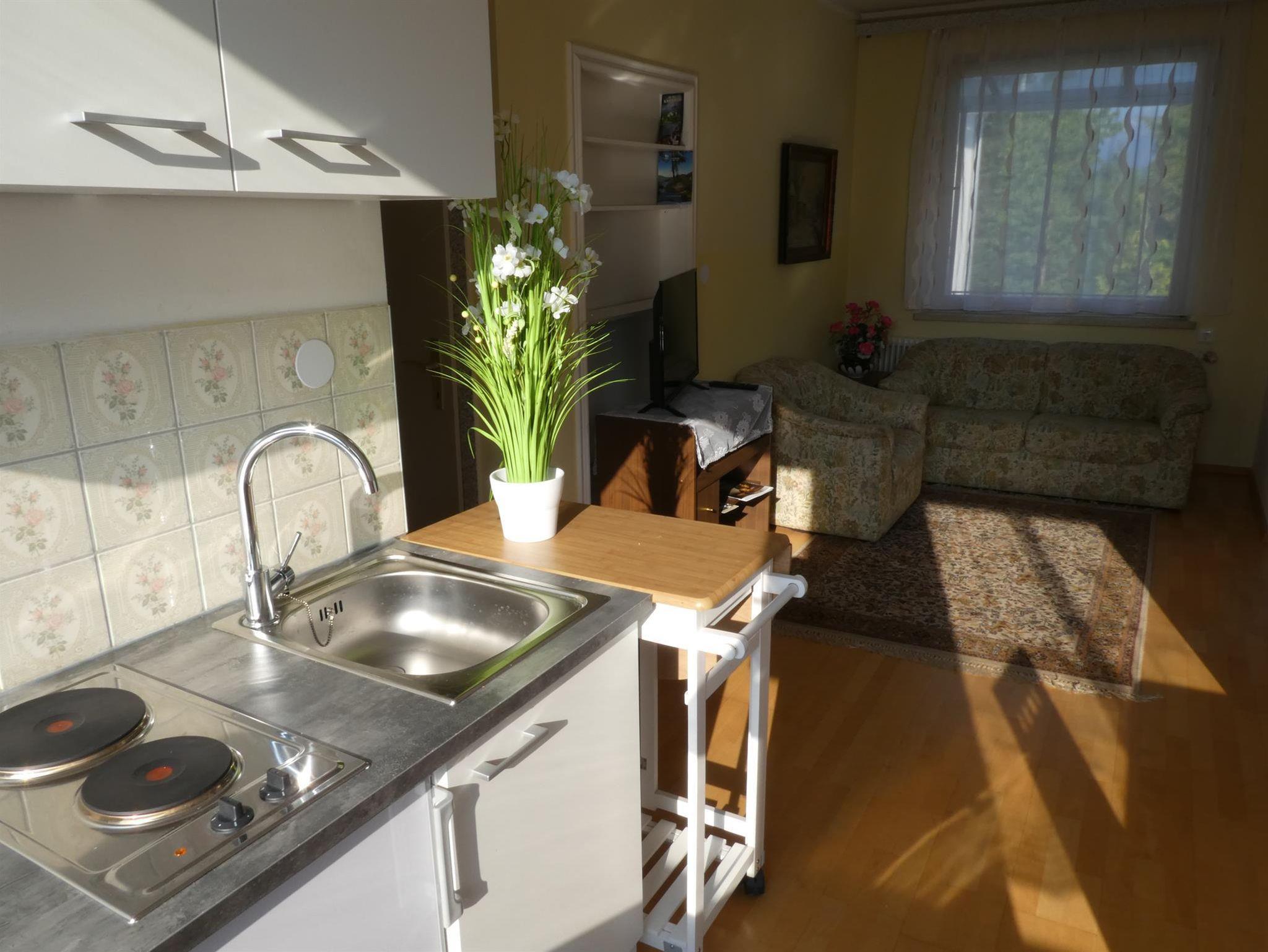 Gemütliche, helle Ferienwohnung, 60 m2, 2 seperat begehbare Schlafzimmer: 1 Doppelzimmer, 1 Zimmer mit 2 Einzelbetten (Kinderzimmer), kleiner Salon mit Flachbild-TV, W-Lan. 1 Küchenzeile mit 2 Herdplatten, Spüle, Kühlschrank, Geschirr, Wasserkocher, Kaffeemaschine. Heller Eßbereich mit Tisch und Eckbank. Ein Badezimmer mit Du/WC; 1 Abstellkammer. Ein großer Balkon ist nach Westen ausgerichtet und bietet einen schönen Blick auf die Berge, besonders zu Sonnenuntergang. Die Ferienwohnng ist im Landhaus-Stil eingerichtet, Möbel aus Buchen- und Fichtenholz, Parkettböden, frisch renoviert.