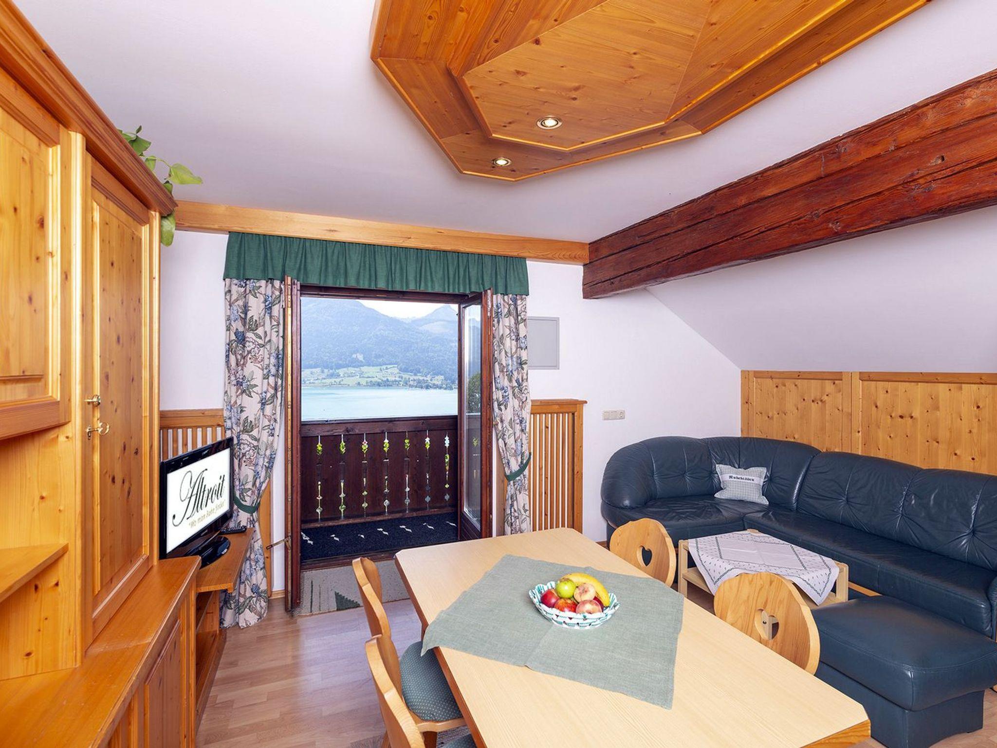 Unser Apartment ?Schwarzensee? bietet auf über 42 m² Platz für bis zu zwei Personen. Es liegt südseitig (viel Sonne) und hat einen sehr großen Balkon, der mit Rattan-Möbeln ausgestattet ist. Von hier aus können Sie den Panoramablick mit dem markanten Kirchturm, dem herrlichen blauen Wolfgangsee und den umliegenden Bergen genießen ? ein einzigartiger, einmaliger Blick!