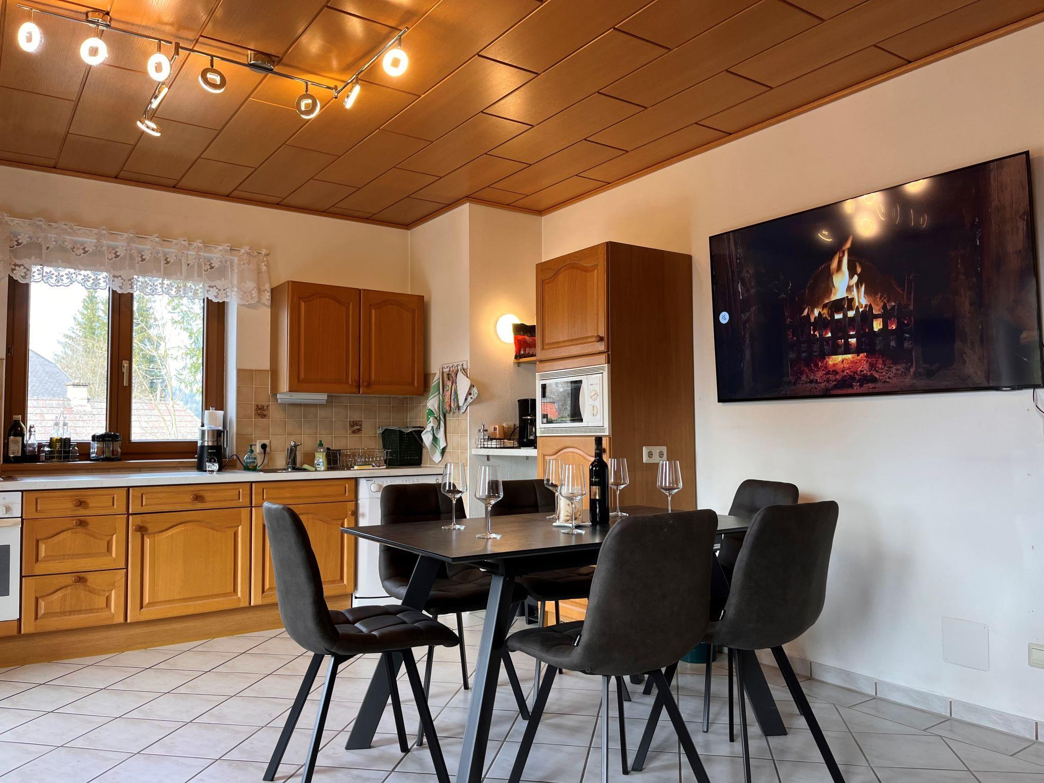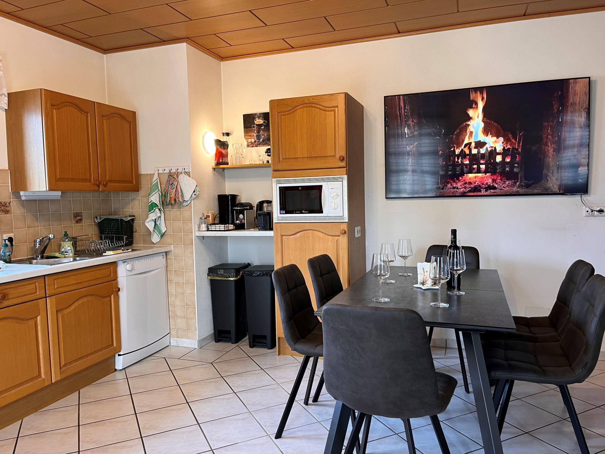 "The Red Apartment", 2-room apartment 70 m2, on the upper ground floor. Object suitable for 3 adults + 2 children. Comfortable and modern furnishings: living/sleeping room with 1 double sofabed, Scandinavian wood stove, dining table, satellite TV and digital TV (flat screen). Exit to the terrace. 1 room with 1 sofabed and 1 double bed. Open kitchen (4 hot plates, oven, dishwasher, toaster, kettle, microwave, electric coffee machine, Capsules for coffee machine (Nespresso) free). Shower/WC. Heating, underfloor heating. Terrace 55 m2, west facing position. Terrace furniture, barbecue (portable). Beautiful panoramic view of the mountains and the countryside. Facilities: washing machine, dryer, iron, hair dryer, logs (free). Internet (WiFi). E-charging station. Please note: non-smokers only. Fire extinguisher.