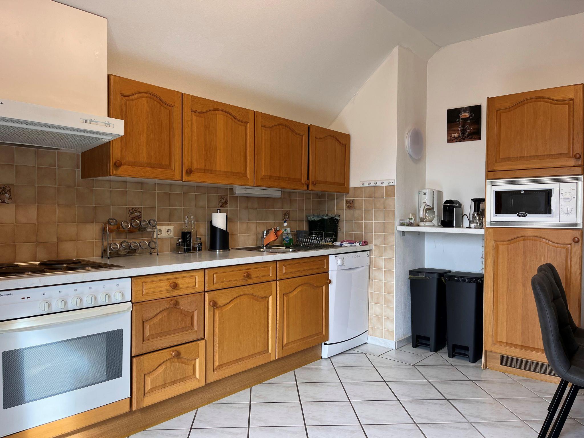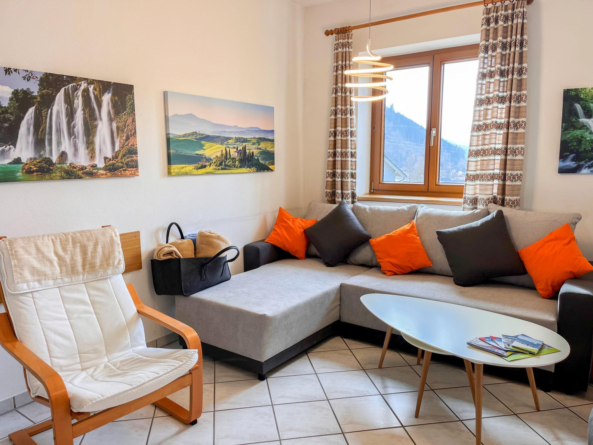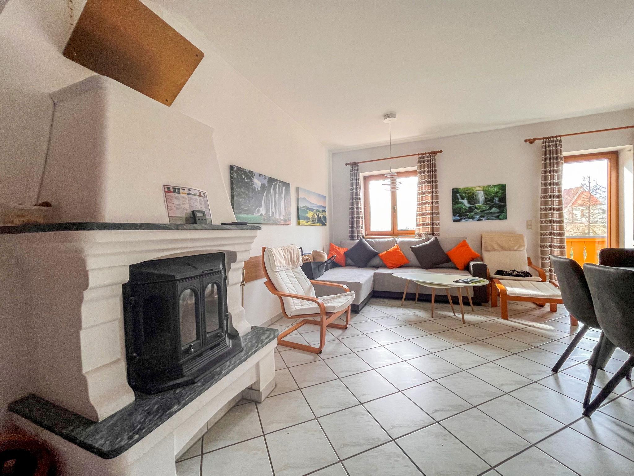 "The Blue Apartment", 3-room apartment 80 m2, on the top floor. Object suitable for 5 adults + 2 children. Comfortable and modern furnishings: living/sleeping room with 1 double sofabed, open-hearth fireplace, dining table, satellite TV and digital TV (flat screen), tiled stove. Exit to the balcony. 1 room with 1 sofabed and 1 double bed. 1 room with 2 beds. Open kitchen (4 hot plates, oven, dishwasher, toaster, kettle, microwave, electric coffee machine, Capsules for coffee machine (Nespresso) free). Shower, sep. WC. Heating, underfloor heating. Balcony 25 m2, west facing position. Balcony furniture. Beautiful panoramic view of the mountains and the countryside. Facilities: washing machine, dryer, logs (free). Internet (WiFi). E-charging station. Please note: non-smokers only.