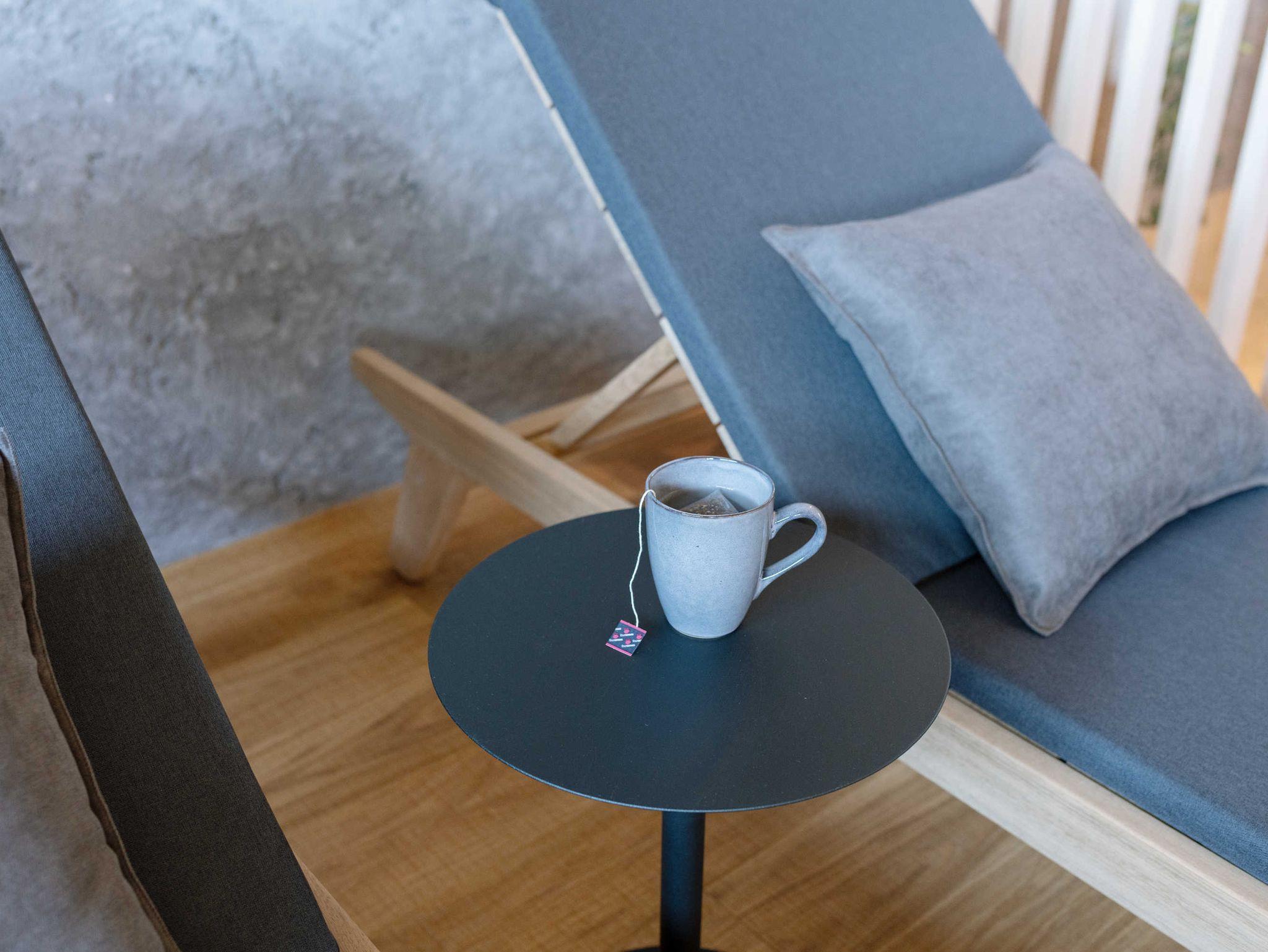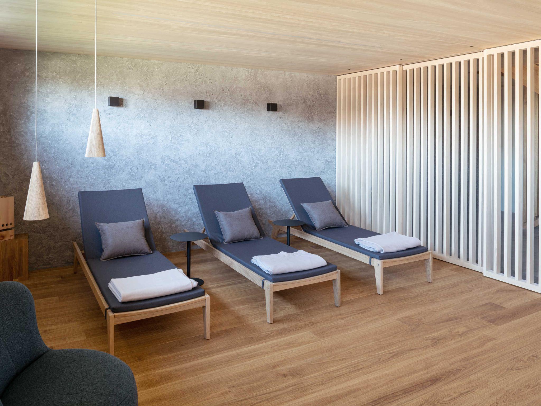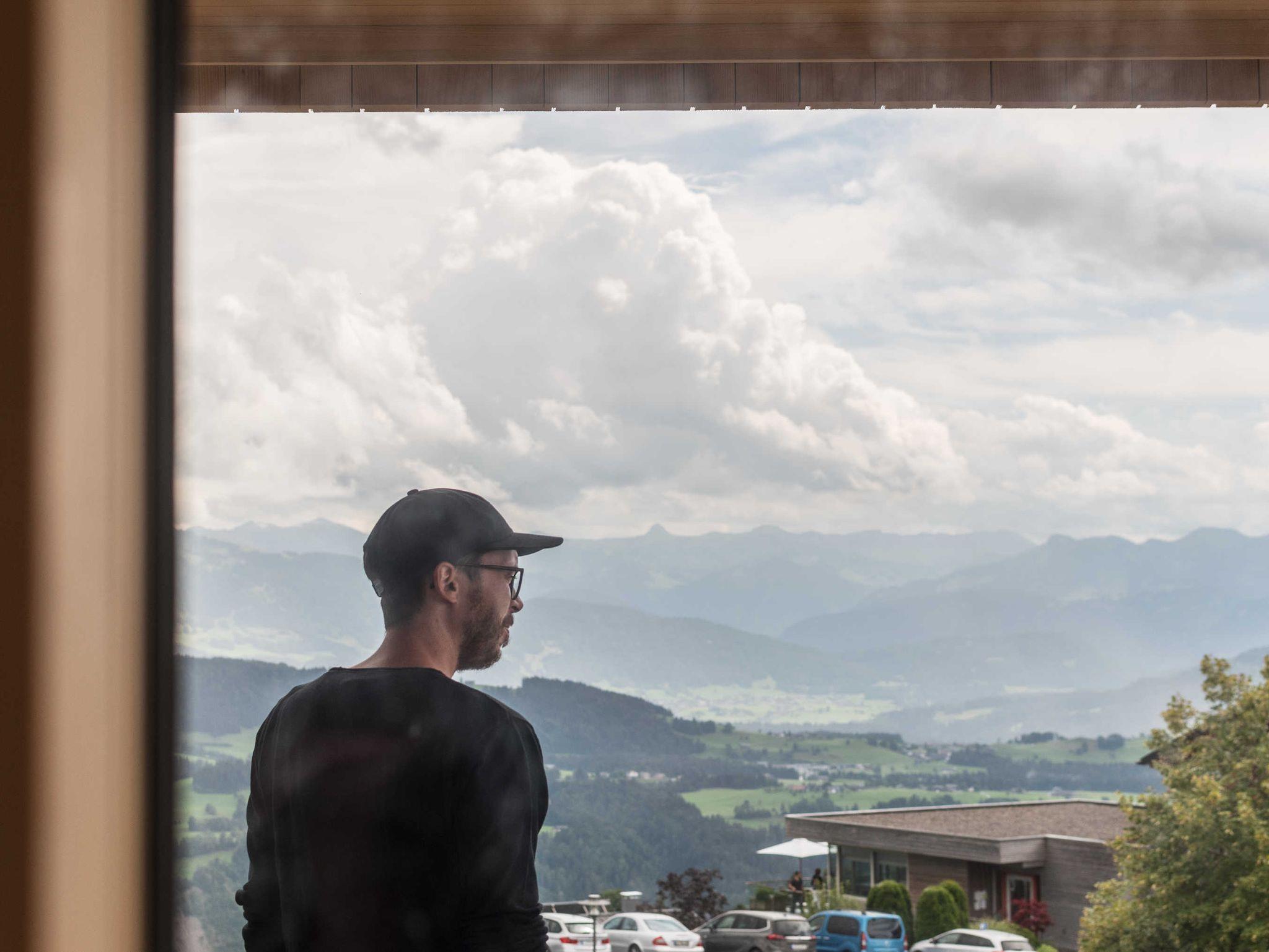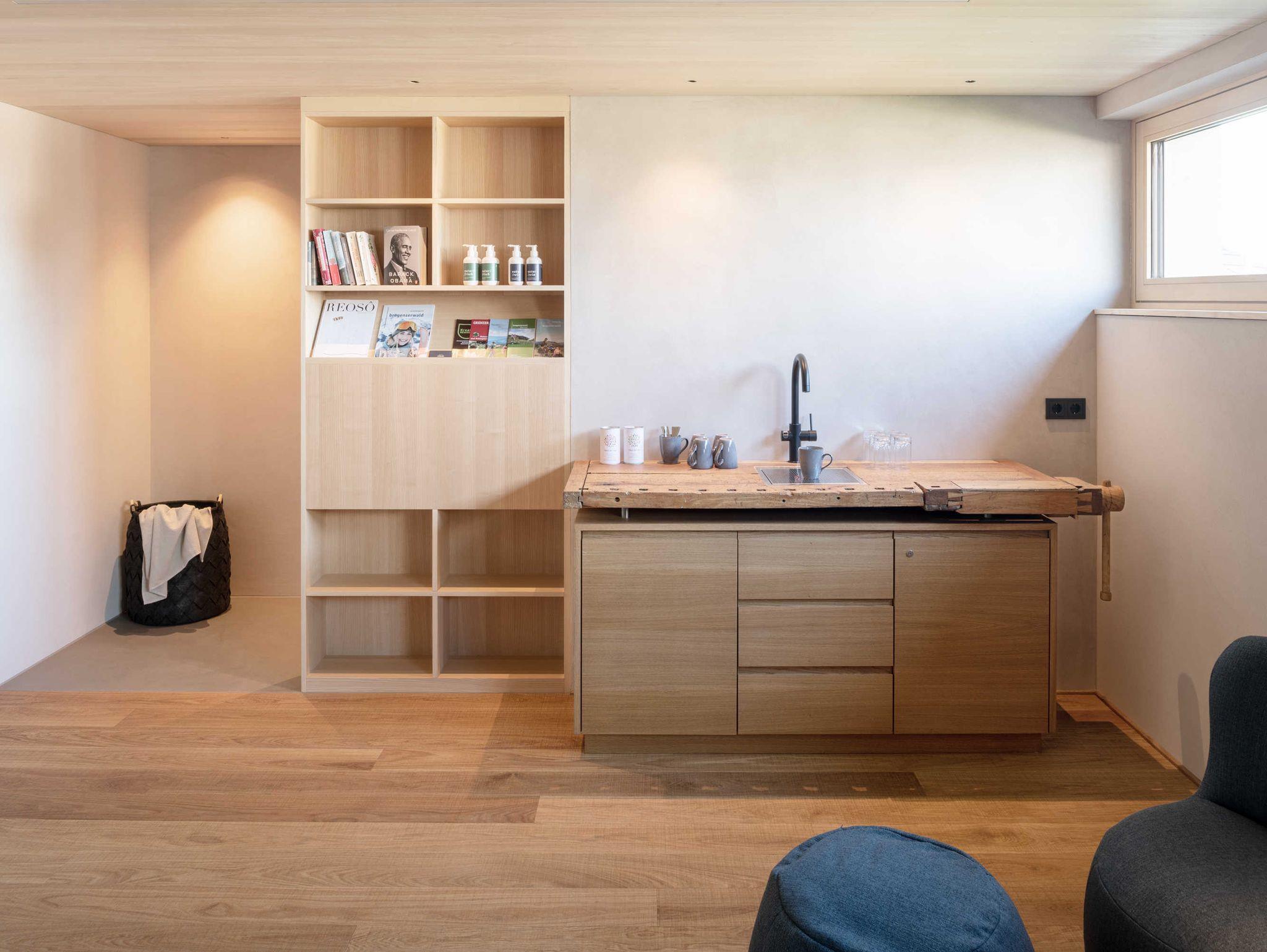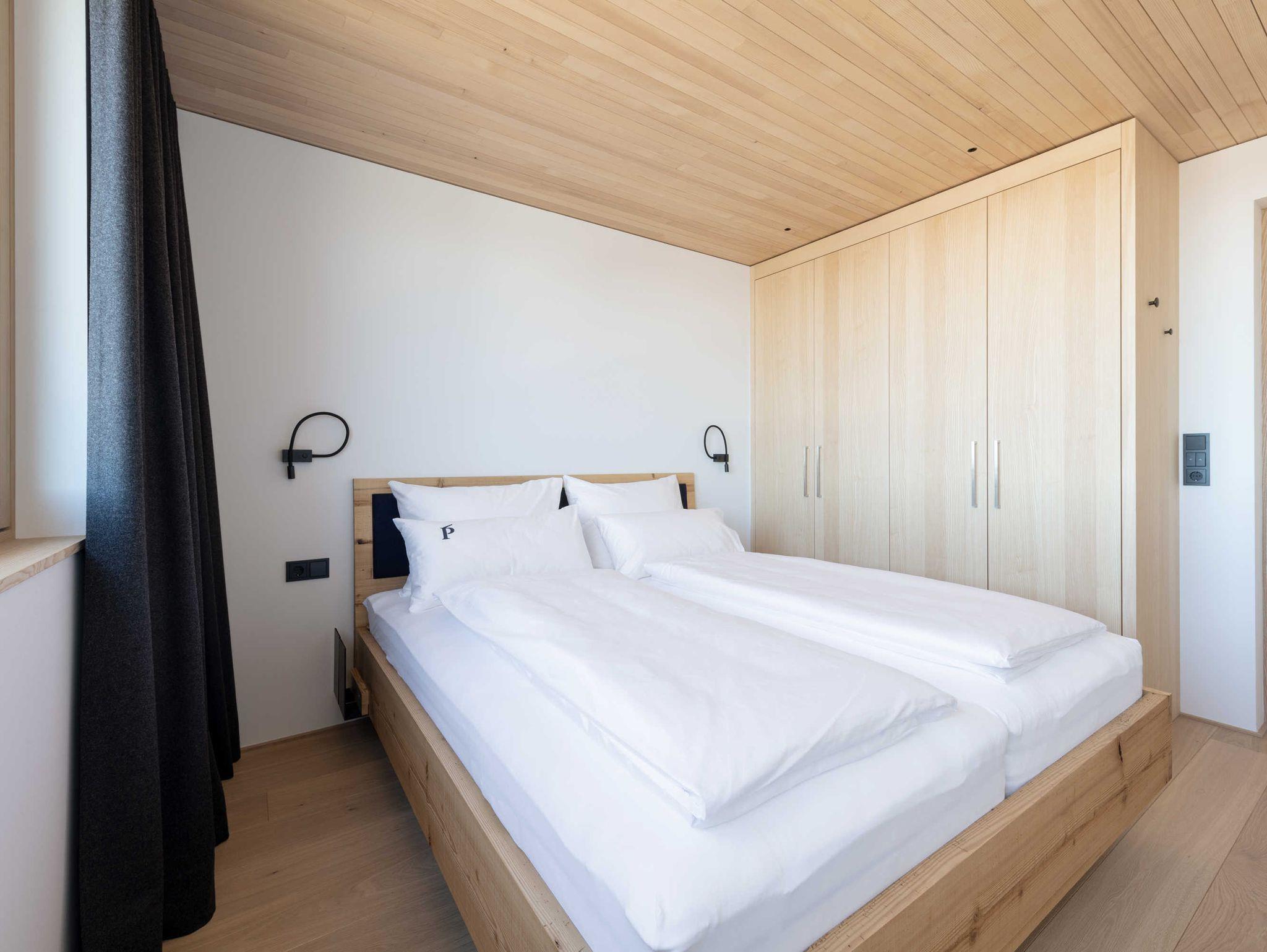 Bregenzerwälder Architektur und Handwerk gepaart mit modernen Designklassikern. Holzbalken von Poldi‘s altem Haus neuverarbeitet zu zeitlosen Betten. Besondere und warme Atmosphäre durch gebürsteten Eichenboden, heimische Weisstannenwände und spezielles Lichtdesign.