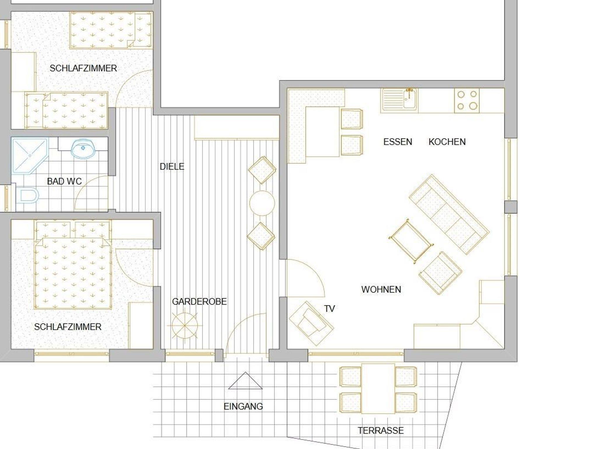 Komfortable Nichtraucherwohnung für 4 Personen, 70 m², Vorraum, ein Doppel- und ein Zweibettzimmer, großer Wohnraum mit Polstergarnitur, Kabel-TV, Esstisch und Eckbank, Küchenzeile mit Kühlschrank, Geschirrspüler, Kaffeemaschine, Wasserkocher, Geschirr, E-Herd mit Backrohr, Dusche/WC; Terrasse