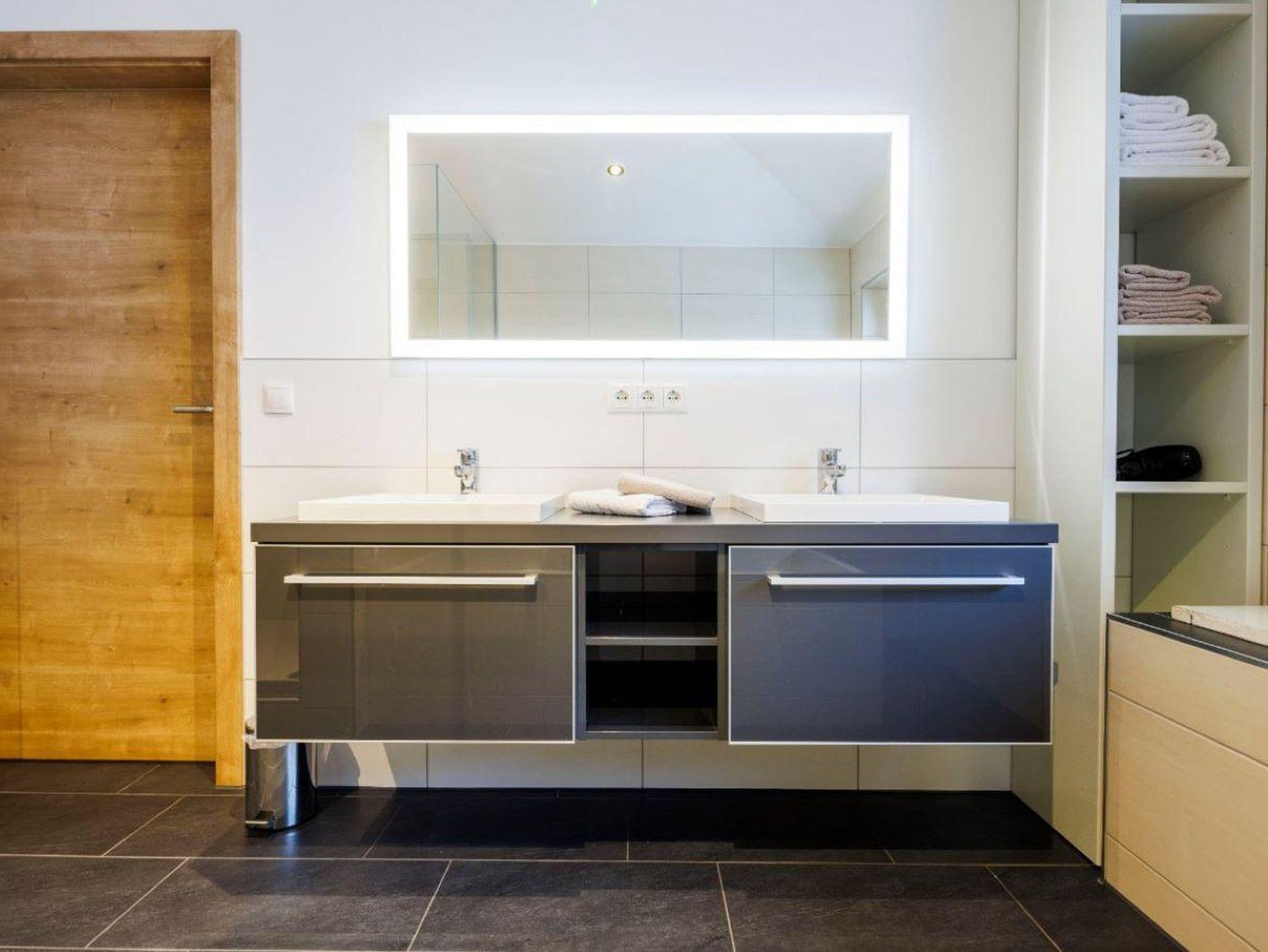 Das große Bad mit begehbarer Dusche lädt zum entspannen ein.