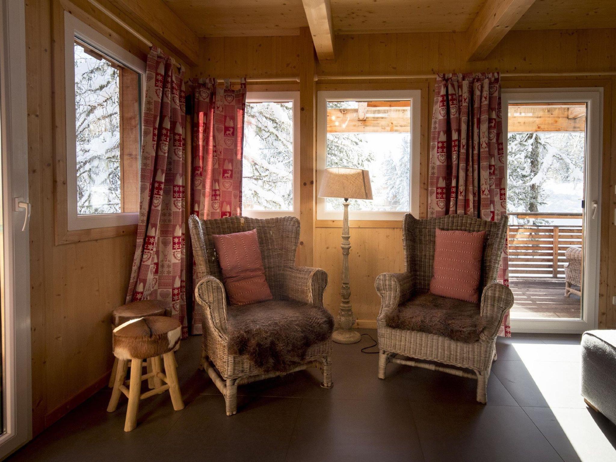 " 13 mit IR-Sauna & Sprudelwanne innen", 5-room chalet 120 m2 on 2 levels. Luxurious and tasteful furnishings: living/dining room with dining nook and satellite TV (flat screen). Open kitchen (oven, dishwasher, 4 ceramic glass hob hotplates, toaster, kettle, microwave, electric coffee machine). Shower/WC. Upper floor: 2 double bedrooms. 1 room with 2 beds. 1 room with 1 x 2 bunk beds, 1 double bed. Bath/WC, shower/WC, hydro massage bath, Sauna. Balcony. Balcony furniture. Beautiful view of the mountains. Facilities: Internet (WiFi, extra). Please note: non-smokers only. The sauna in the wellness pool is an infrared sauna.