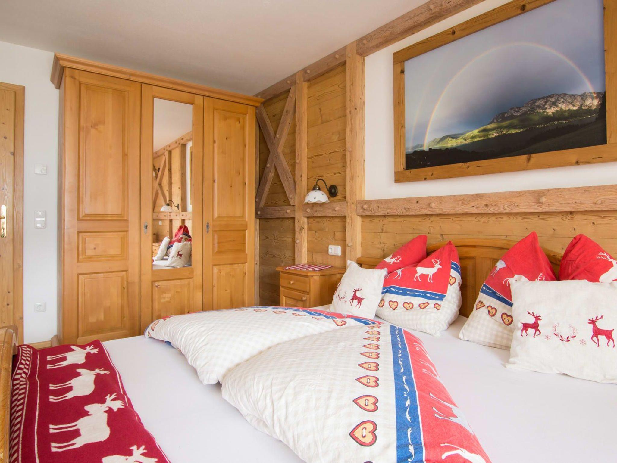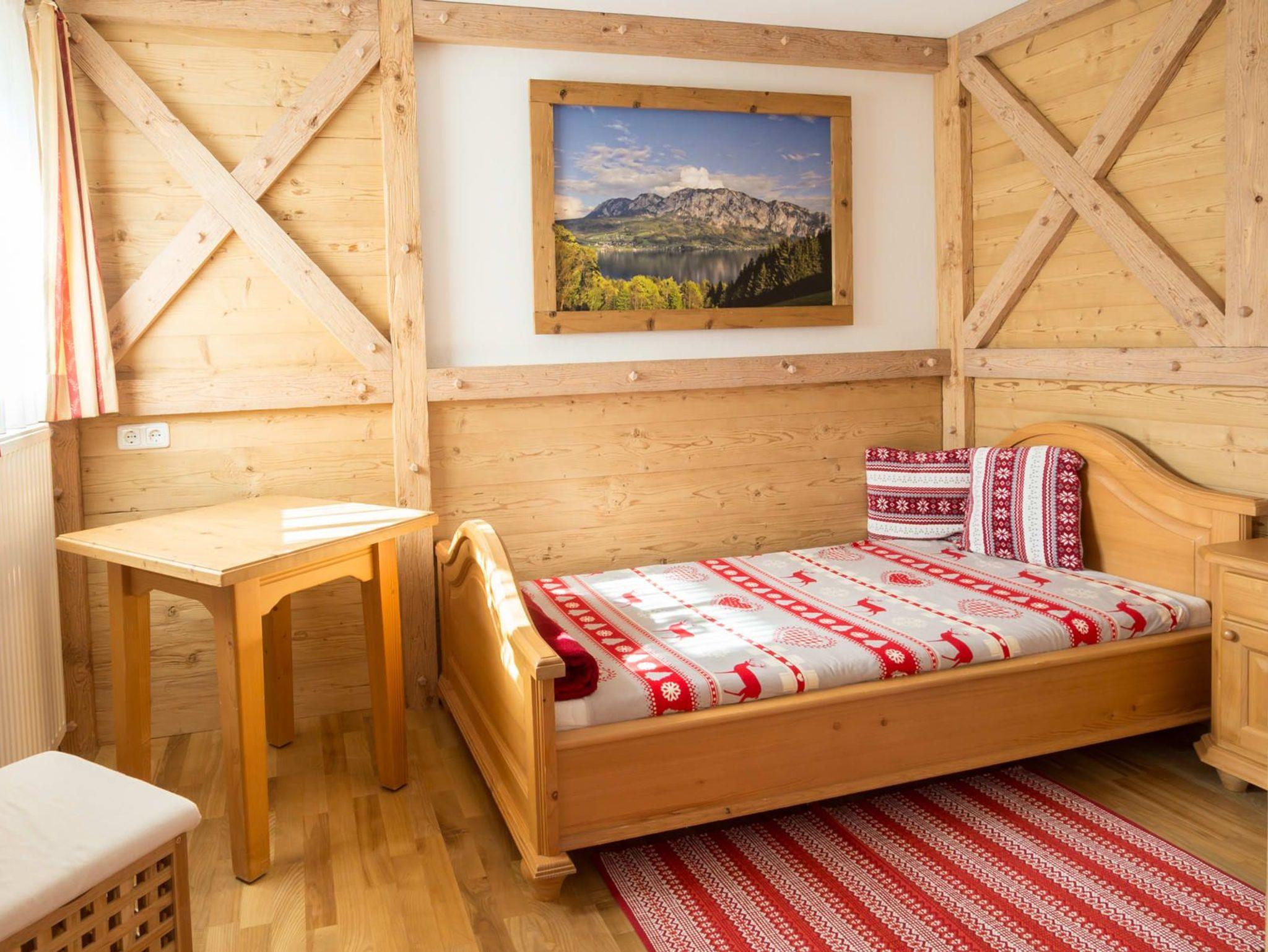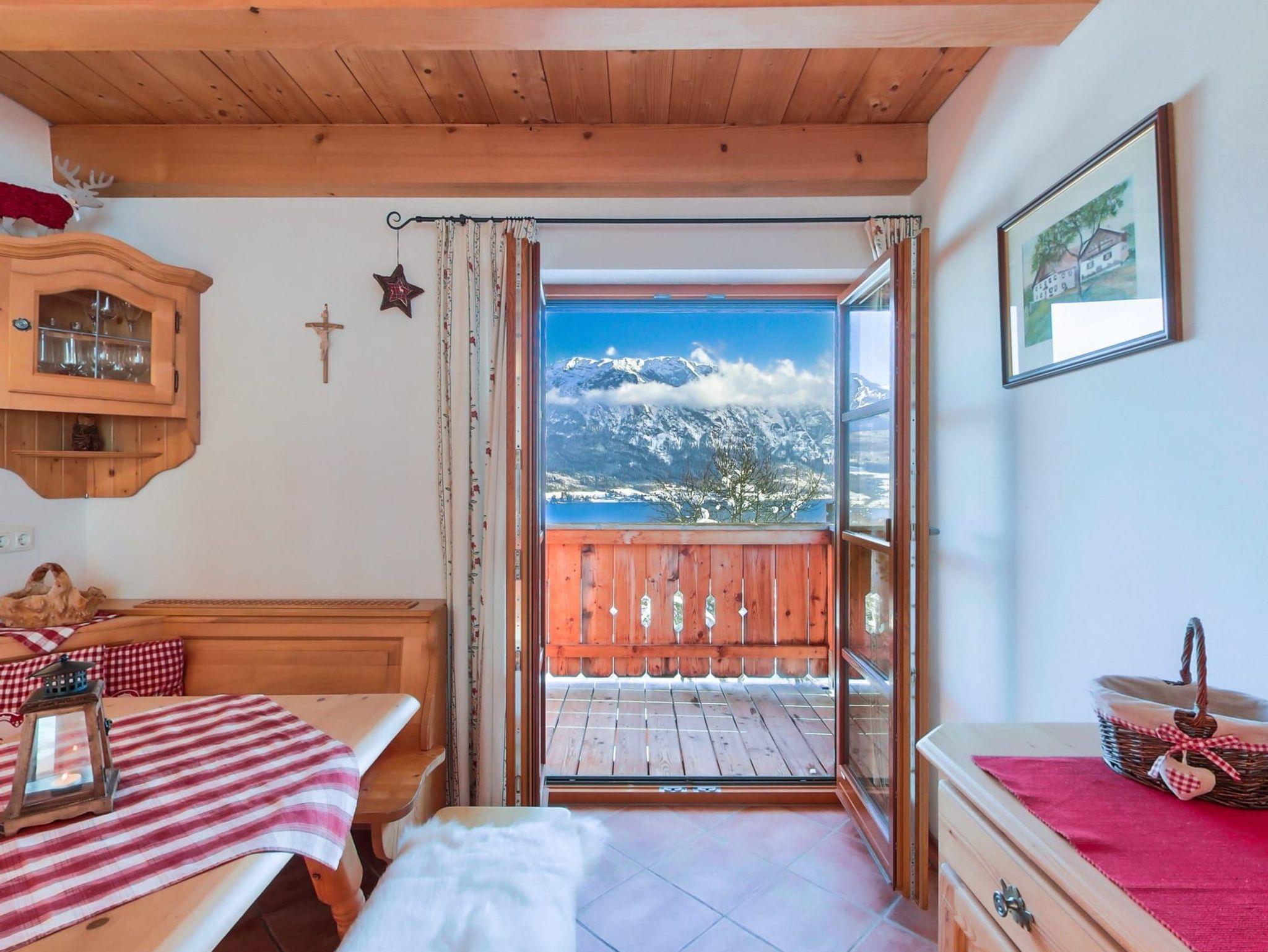 Exklusive urgemütliche in Massivholz eingerichtet Ferienwohnung Schafberg mit Blick zum Attersee für 2 - 3 Personen mit Terrasse, komplett eingerichtete Küche mit Geschirrspüler, Gratis Internet über Wireless LAN oder Kabel, Sat-TV, Flatscreen, WC und Bad und mit 1. Schlafzimmer