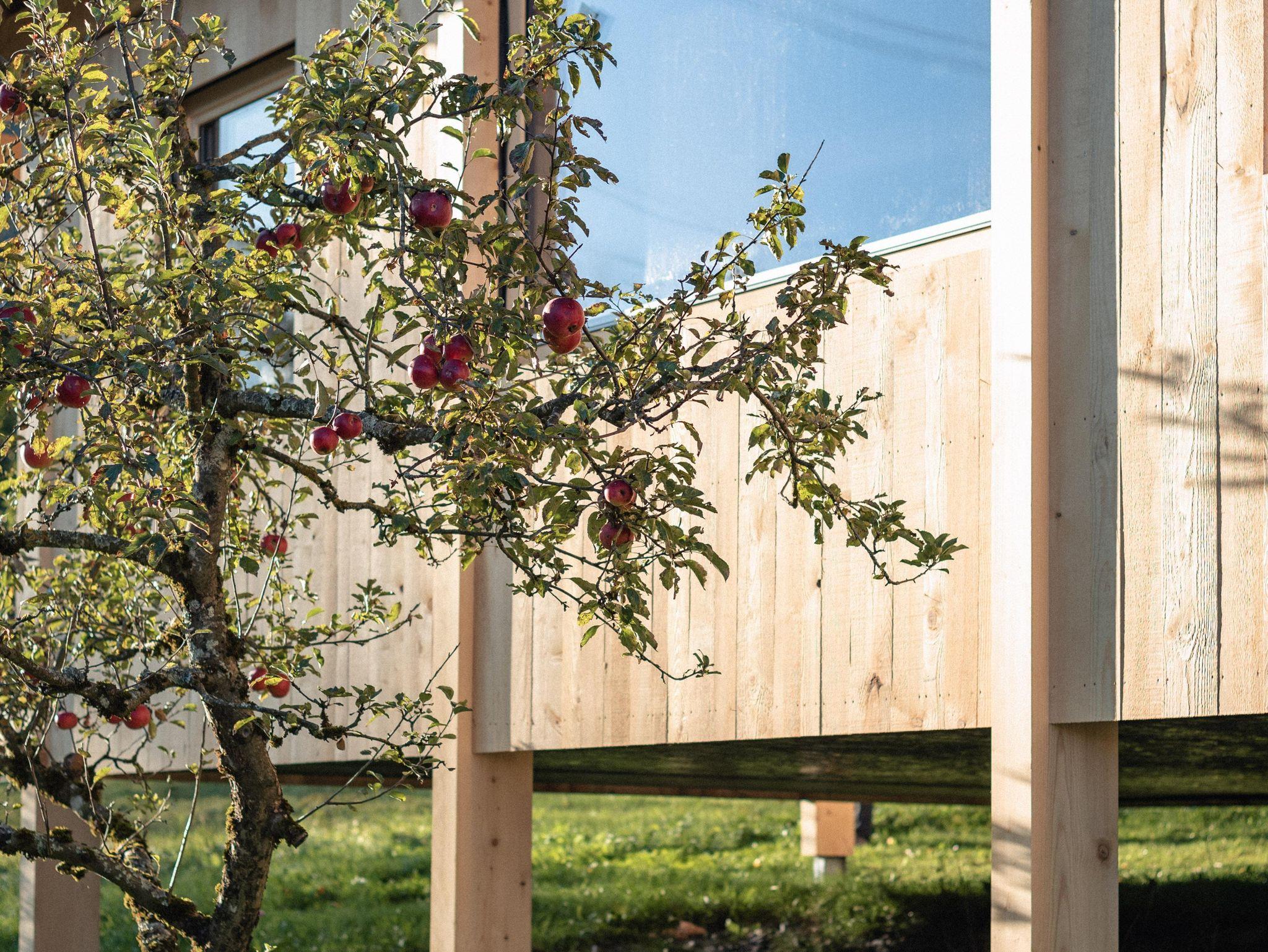 Chalets inmitten unserer alten Obstbäume. In jedem Chalet fließen Nachhaltigkeit, Regionalität und Ferienkomfort stimmig ineinander. Das Bauholz stammt aus unserem eigenen Wald. Strom produzieren wir umweltfreundlich mit unserem Kleinwasserkraftwerk.