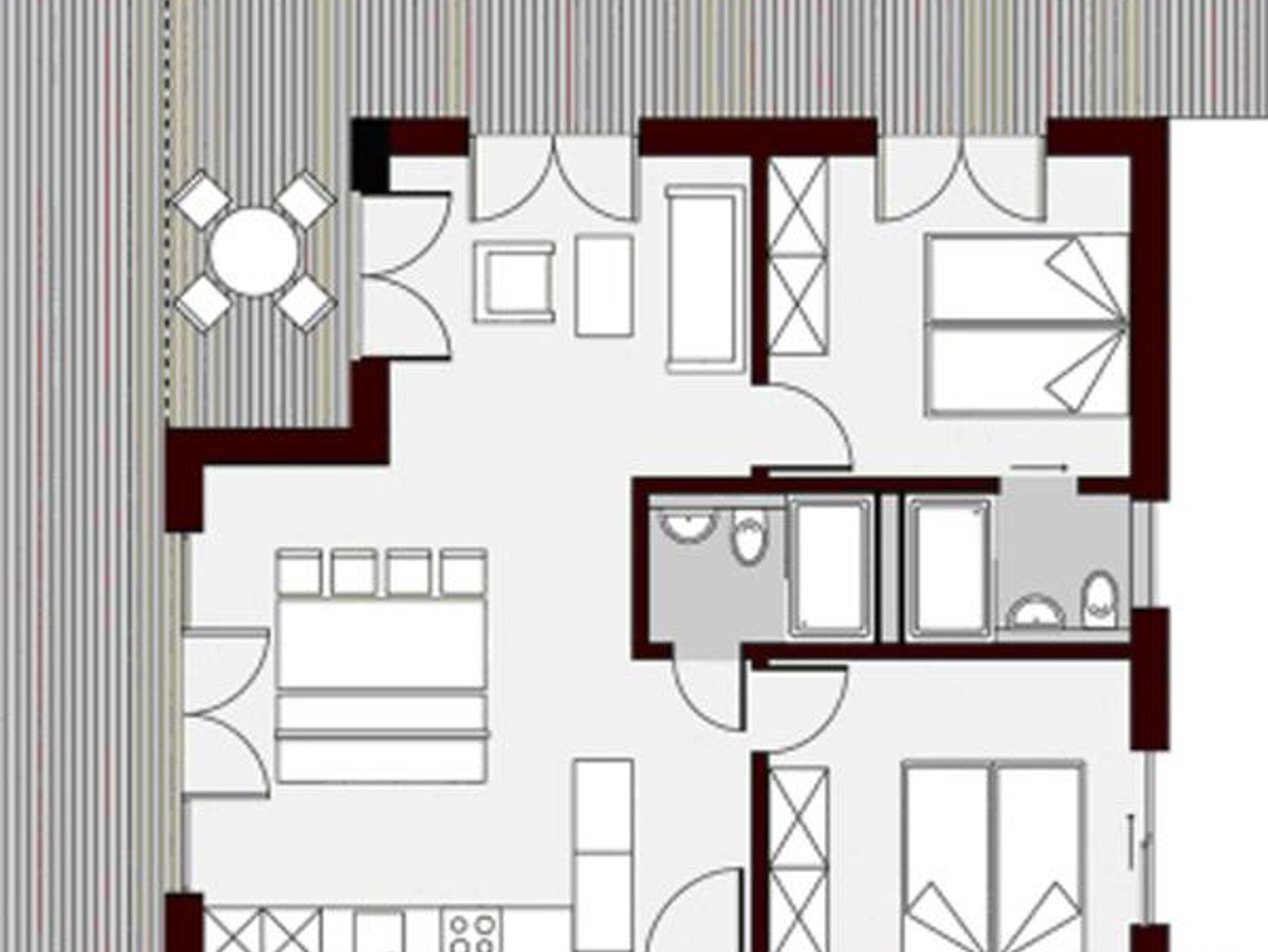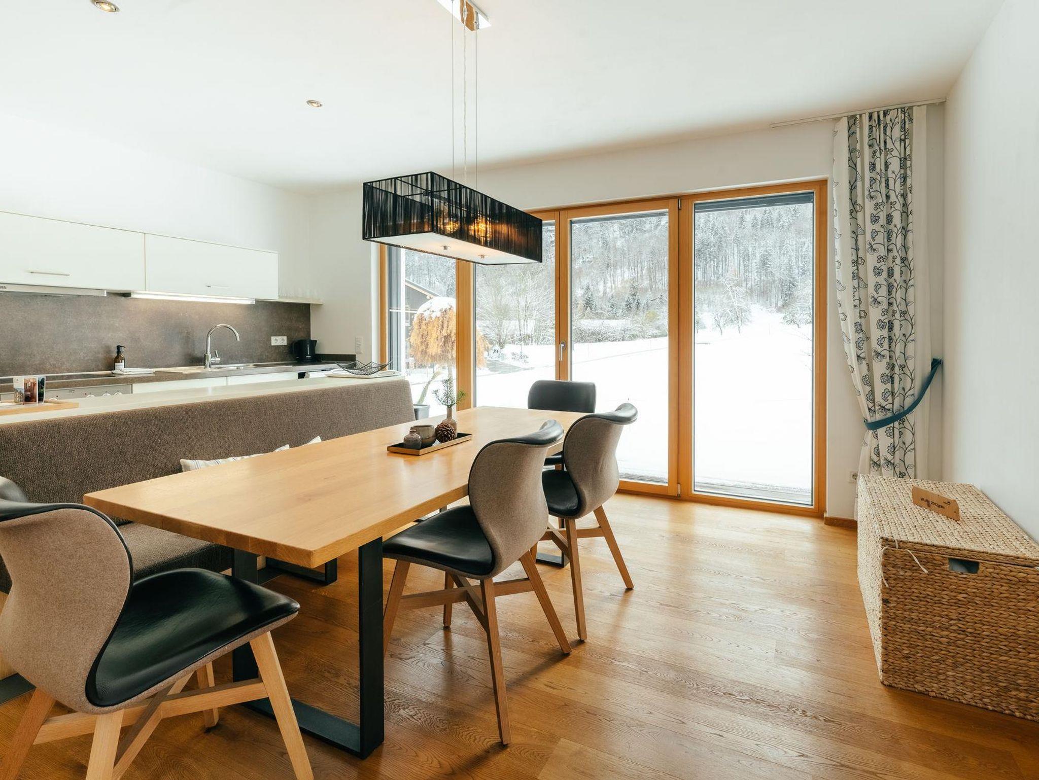 Eine optimale Raumeinteilung mit ineinanderfließenden Räumen und zwei Bädern ermöglichen entspanntes Wohnen für 4-6 Personen. Gegen Westen gelegene Schlafzimmer garantieren Ihnen einen ruhigen, gesunden Schlaf. Genügend Platz zum Entspannen und Verweilen bietet auch die Gartenterrasse mit 41 m². Hier sitzen Sie in erster Reihe zur Bergkulisse.