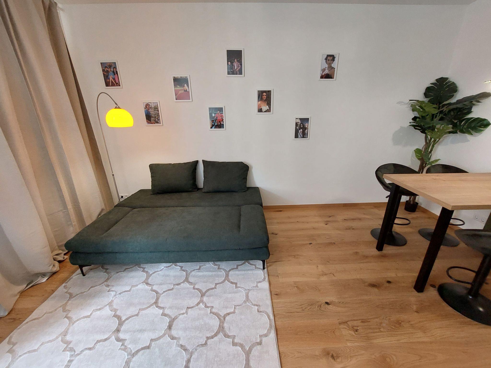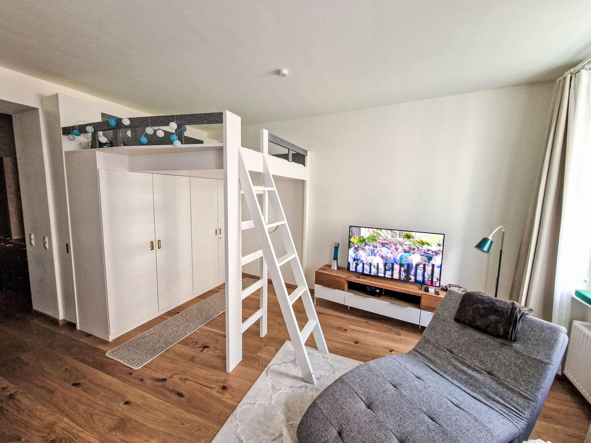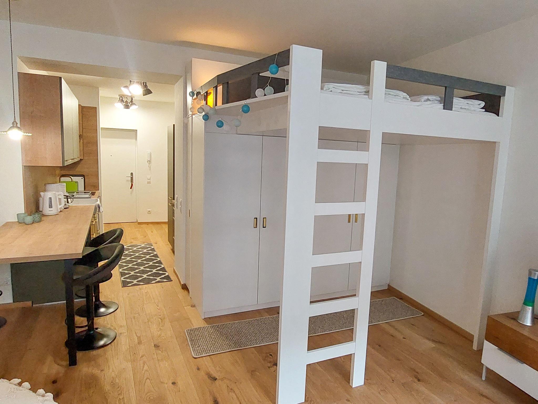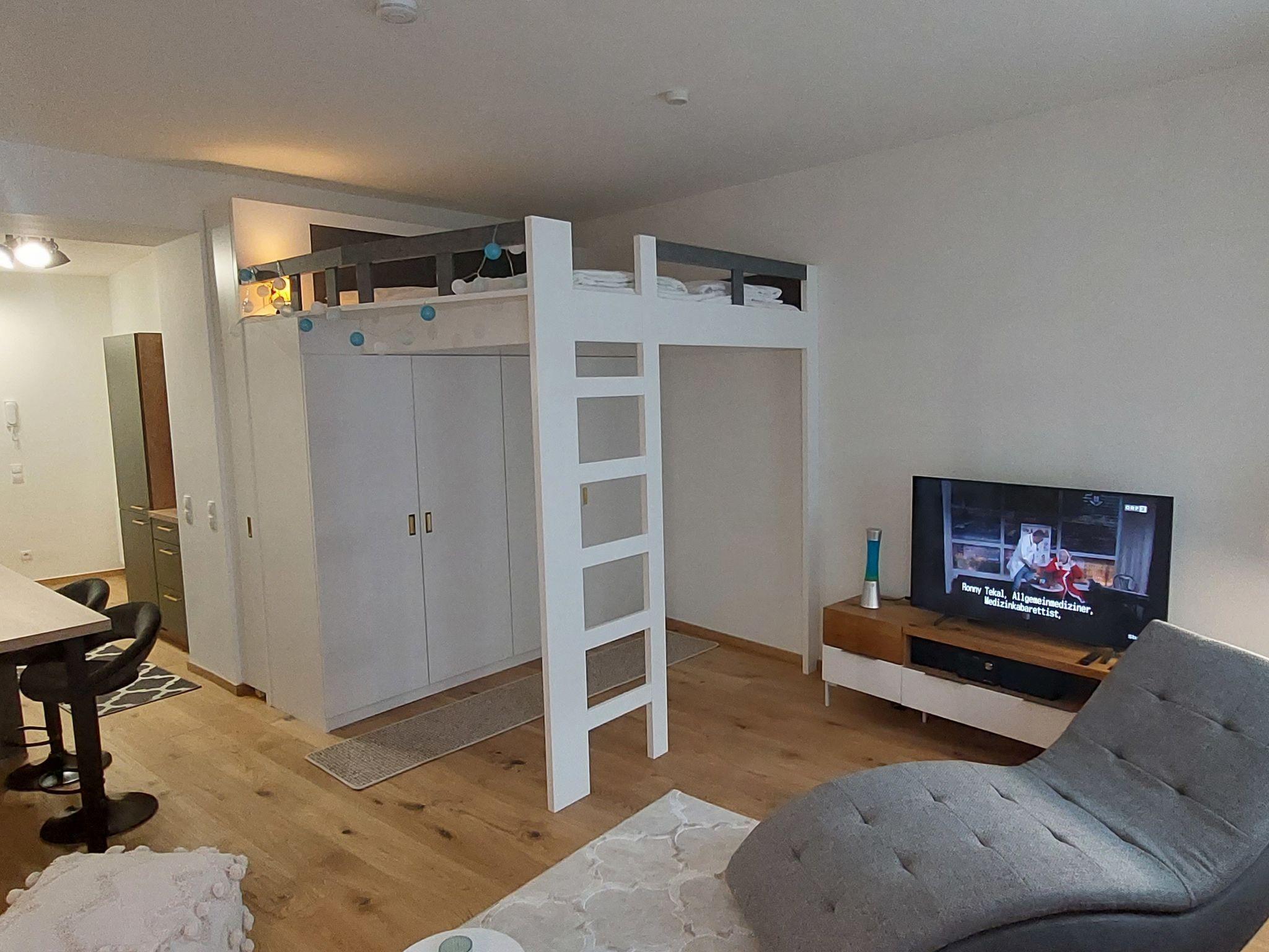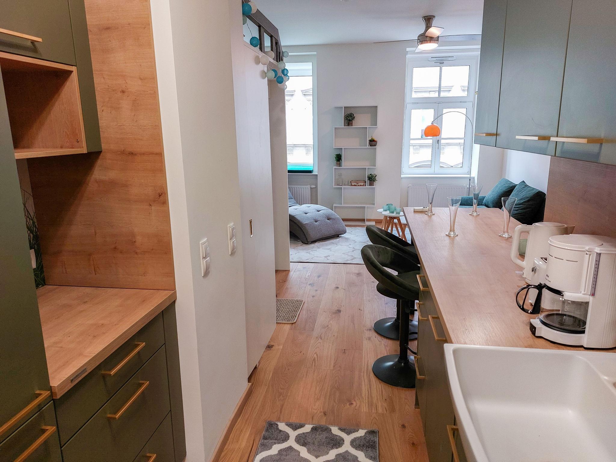 "Premium Apartment MariaHilf 1", 1-room apartment 42 m2 on 2nd floor. Object suitable for 4 adults. Spacious and bright, fully renovated in 2023, very comfortable and modern furnishings: entrance hall. Open living/sleeping room with 1 x 1 bunk beds (180 cm, length 190 cm), 1 pull-out bed (2 pers.), cable TV, flat screen, radio, CD-player and DVD. Open kitchen in the entrance (4 hot plates, dishwasher, toaster, kettle, electric coffee machine). Bath/WC. Heating. Wooden floors. Facilities: washing machine, iron, baby cot. Internet (WiFi, free). Please note: non-smokers only. Bunk beds (180cm wide) is a loft bed. Highspeed-Internet.
