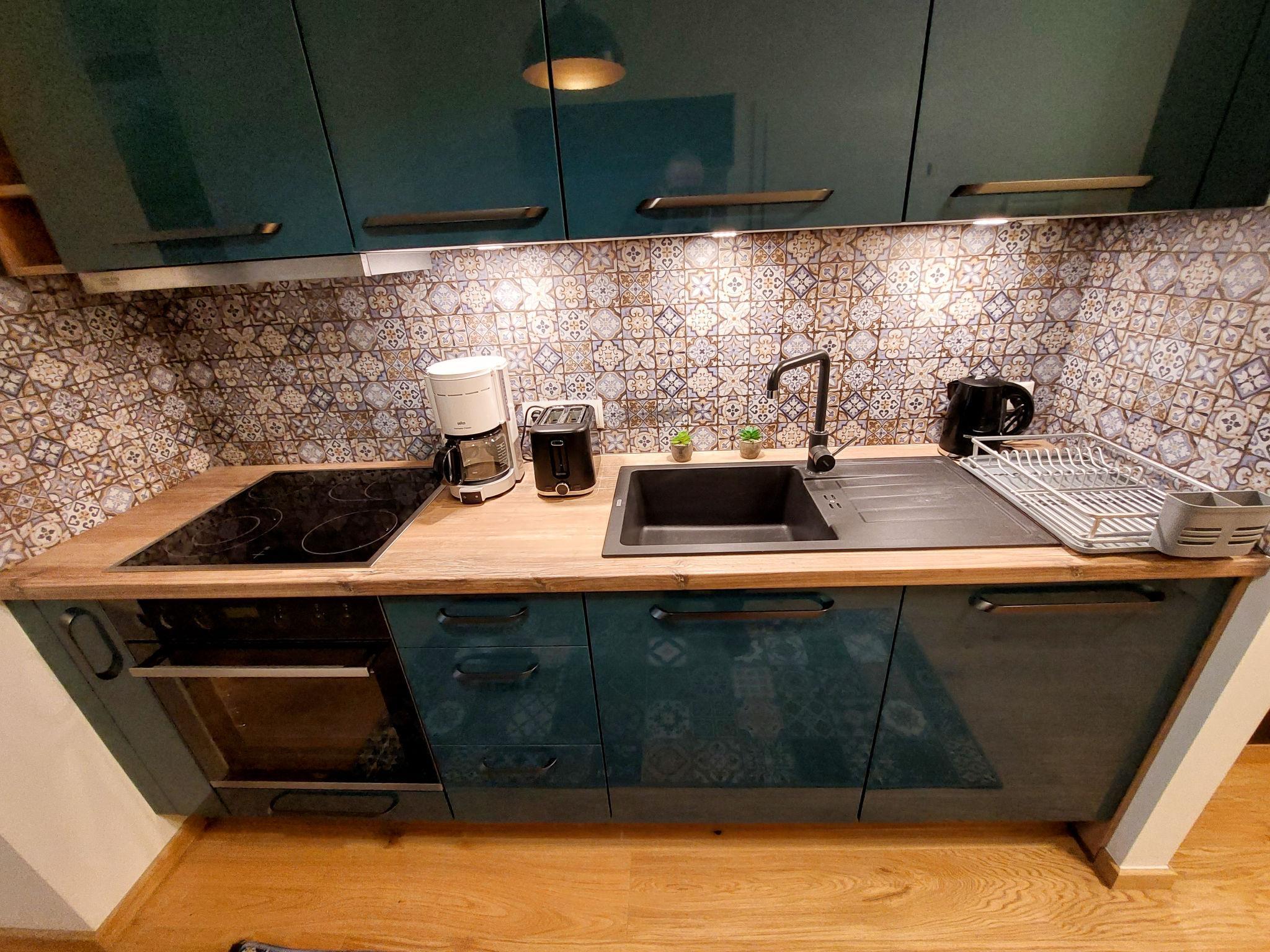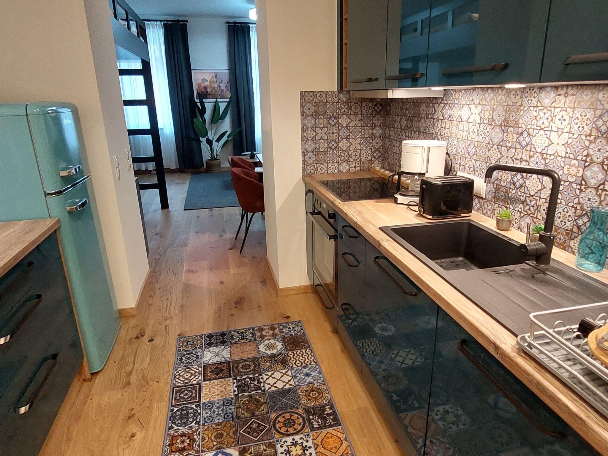 "Premium Apartment MariaHilf 2", 1-room apartment 42 m2 on 2nd floor. Object suitable for 4 adults. Bright, fully renovated in 2023, modern and tasteful furnishings: entrance hall. Open living/sleeping room with 1 x 1 bunk beds (150 cm, length 200 cm), 1 pull-out bed (2 pers.), cable TV, flat screen, radio, CD-player and fan. Kitchen in the entrance (4 hot plates, oven, dishwasher, toaster, kettle, electric coffee machine). Bath/WC. Heating. Wooden floors. Side view. Facilities: washing machine, iron, baby cot, hair dryer. Internet (WiFi, free). Please note: apartment street side. Non-smokers only. Double bed (150cm wide) is a loft bed. Highspeed-Internet.