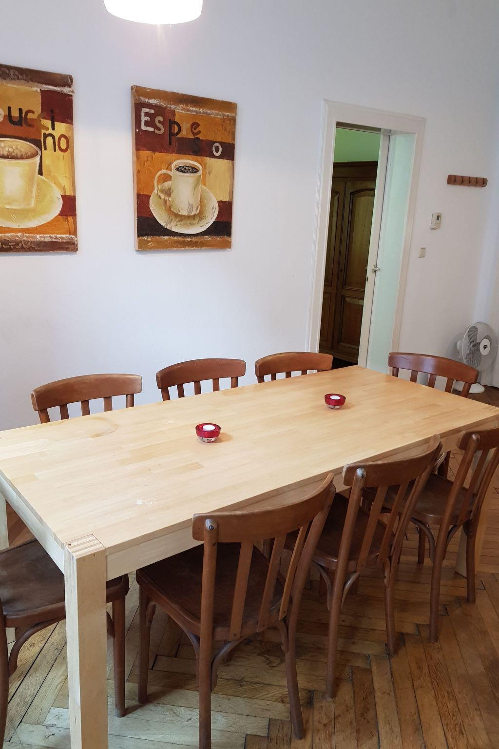 The living room is furnished with a large dining table and a seating area consisting of two single sofa beds. The windows face a large, wide street, so it is very bright, but you can also hear the traffic noise.