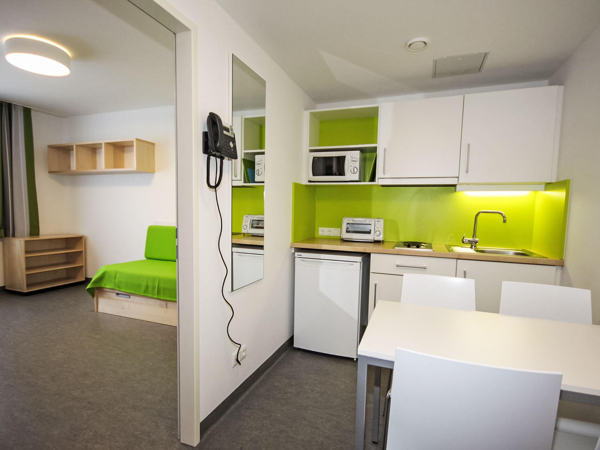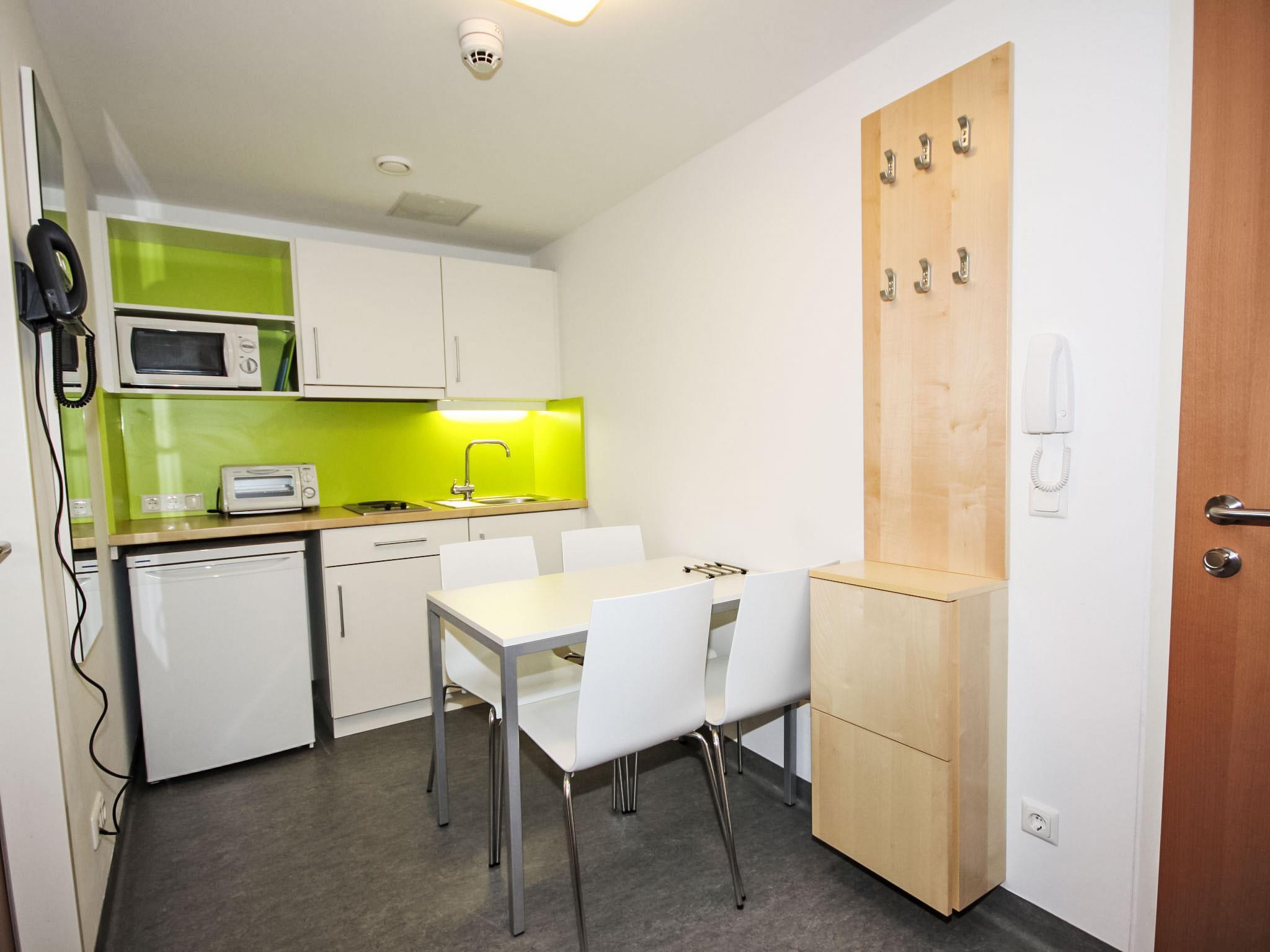 The modern student residence STUWO Villach is located in a sunny and quiet location with good connections to the public transport and cycle path network (lockable cycle room available on request). The city center is 4.5 km away. The surrounding lakes (Silbersee, Magdalenensee, Grünsee), the Drau and countless leisure activities can be reached in a few minutes. Modern apartment block "Techno-Park Villach". In the district of Villach-St. Magdalen, 4.5 km from the centre, in a quiet, sunny position, 2 km from the lake, directly by the river. In the house: internet access, sauna, fitness room (all included), central heating system, washing machine, tumble dryer (extra). Parking at the house. Supermarket 3 km, restaurant 500 m, bus stop "Villach-Campus" 100 m, thermal baths "Therme Warmbad-Villach" 5.5 km, bathing lake "Silbersee" 2.1 km, lake Faaker See 8.1 km. Golf course (18 hole) 6.8 km, surf school 8.9 km, sailing school 8.9 km, cycle lane 10 m. Nearby attractions: Burg Landskron 6 km, Terra Mystica, Terra Montana 27 km, Minimundus 33 km. Well-known lakes can easily be reached: Ossiacher See 7 km, Wörther See 15 km, Silbersee 3 km. Hiking paths: Naturpark Dobratsch 12 km. Please note: Additional accommodations can be booked.