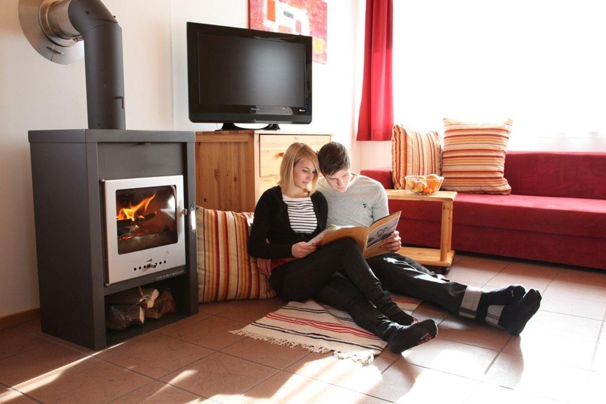 Wohnraum mit gemütlicher Couch, SAT-TV & Schwedenofen