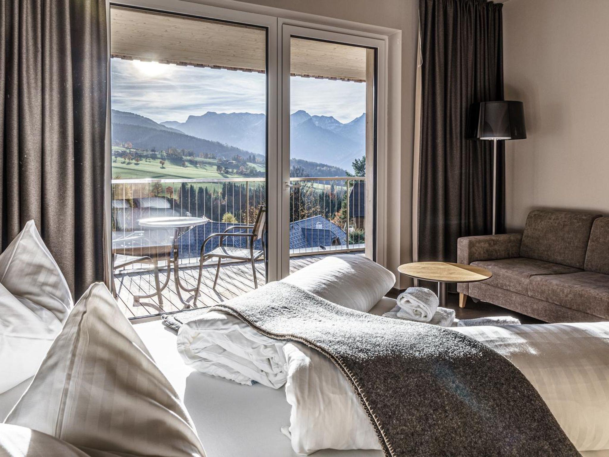 Die im Neuzubau gelegenen wunderschönen Juniorsuiten im modernen, rustikalen Stil verfügen über Dusche, extra WC, Flat-TV, Minibar, Zimmersafe, Fön, Telefon, Balkon und gemütlicher Couch und sind ca. 41 m² groß.