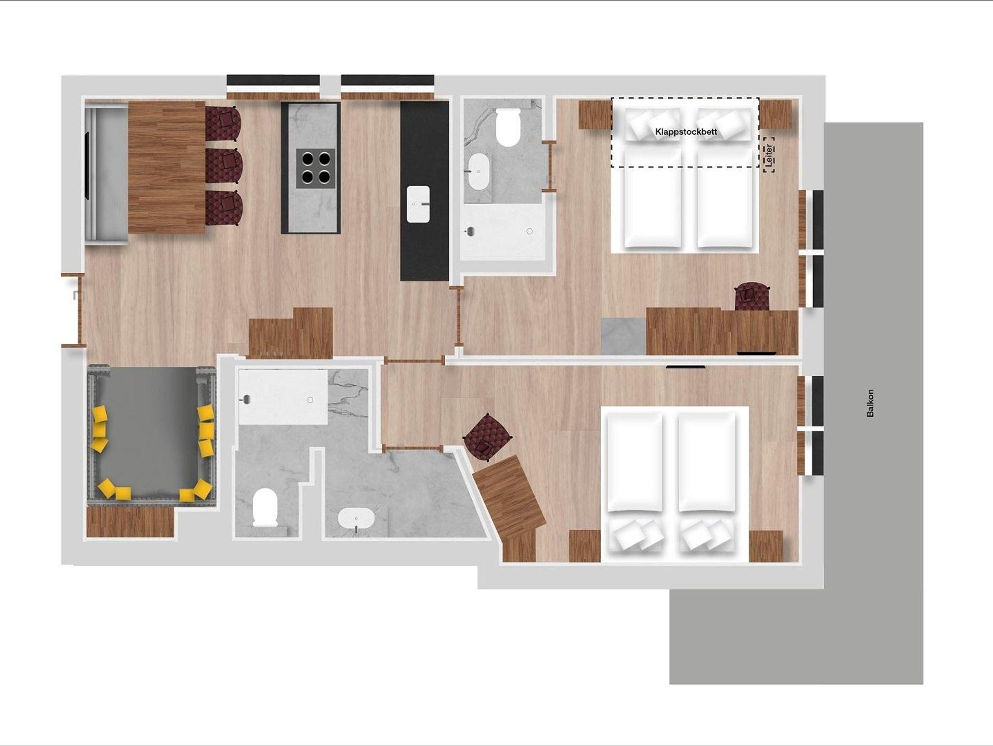 Dieses Suite Apartment bietet Ihnen 2 Schlafräume mit Boxspringbetten, eine Wohnküche zum Kochen und Relaxen sowie einen Balkon. Lage: 2. OG, Süd/Anlage, Balkon südseitig;