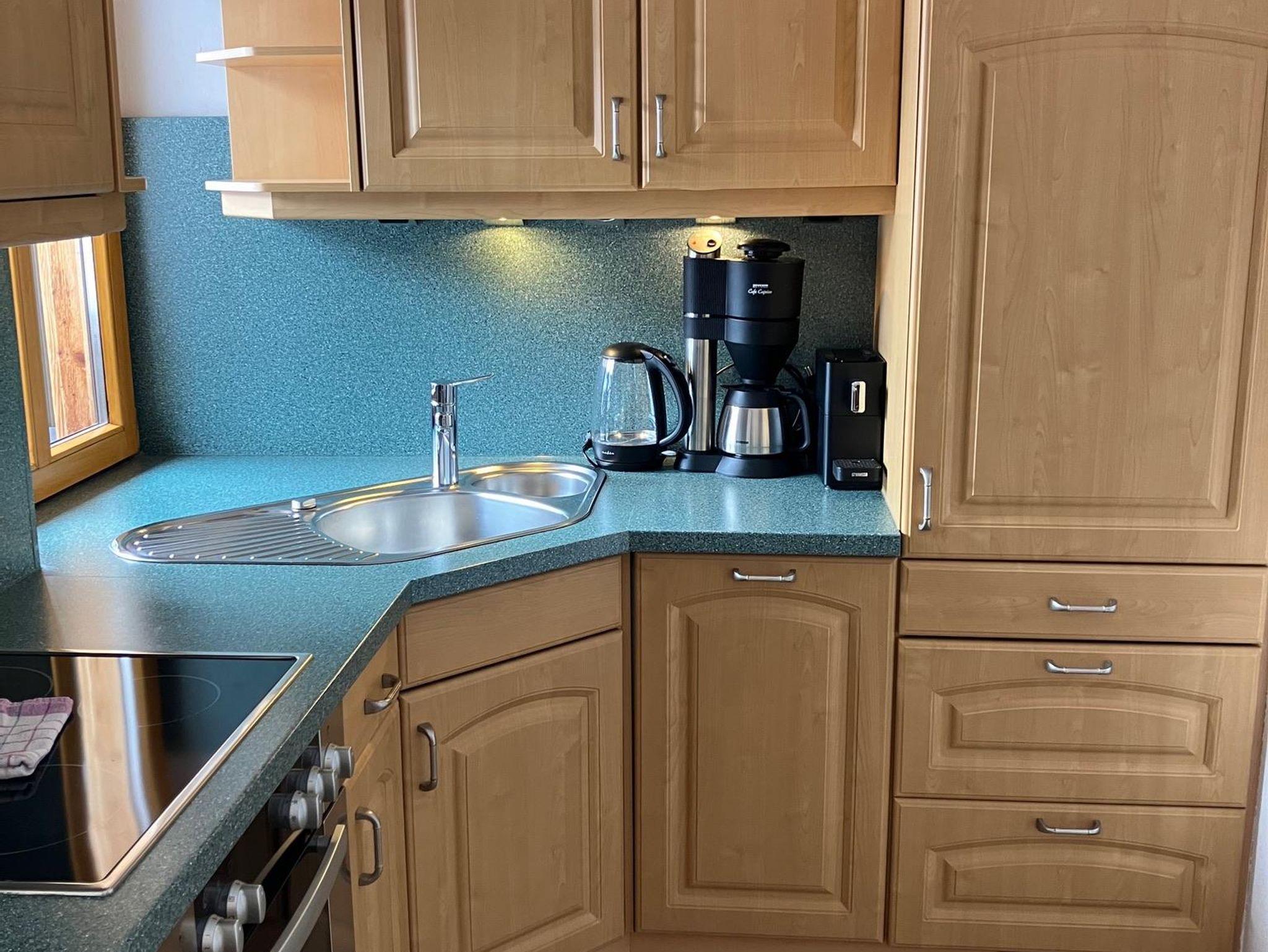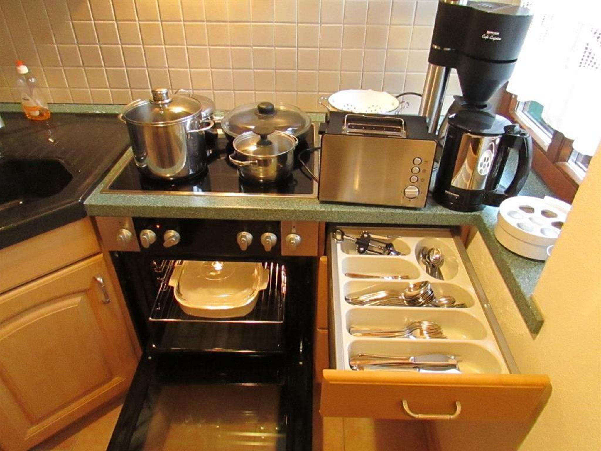 1 separater Schlafraum Doppelbett (1,80x2,00m), Wohnraum (Sofabett für 2 Personen) mit Esstisch, Küche: Ceran-Kochfeld, Backofen, Mikrowelle, Spülmaschine, Kühl-/Gefrierschrank, Kaffeemaschine, Eier-/Wasserkocher, Toaster