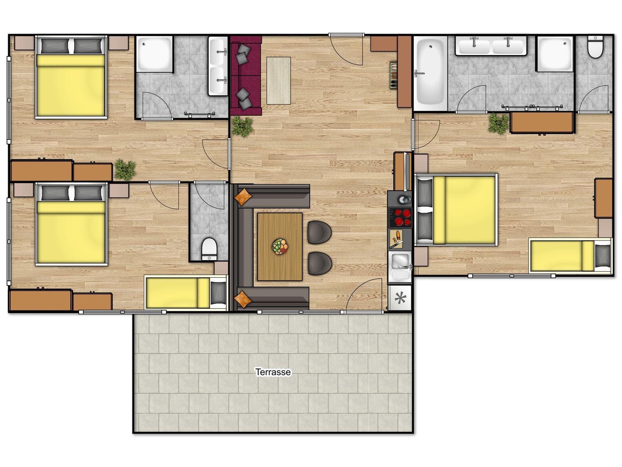 Ausgestattet mit Küchen-Wohnbereich mit Ausziehcouch, 3 Schlafzimmer, 2x Bad mit Badewanne und Dusche, 2x WC, Flat-TV, Wifi Internet und südseitiger Terrase.