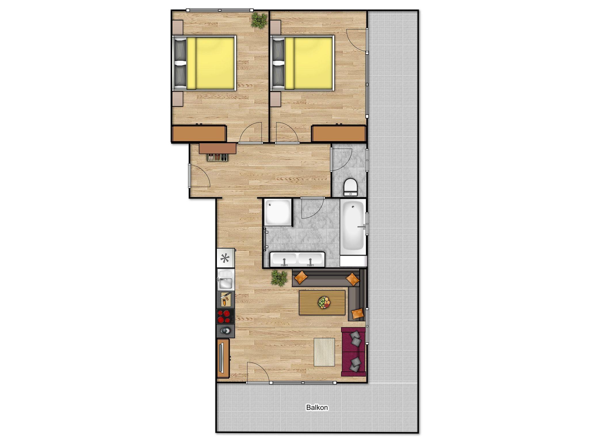 Sonniges Apartement (69 m²) im 1. oder 2. Obergeschoss für 4 - 5 Personen. Ausgestattet mit Küchen-Wohnbereich mit Ausziehcouch, 2 Schlafzimmern, 1x Bad mit Badewanne und Dusche, getrenntem WC, Flat-TV, Wifi Internet und südseitigem Panoramabalkon.