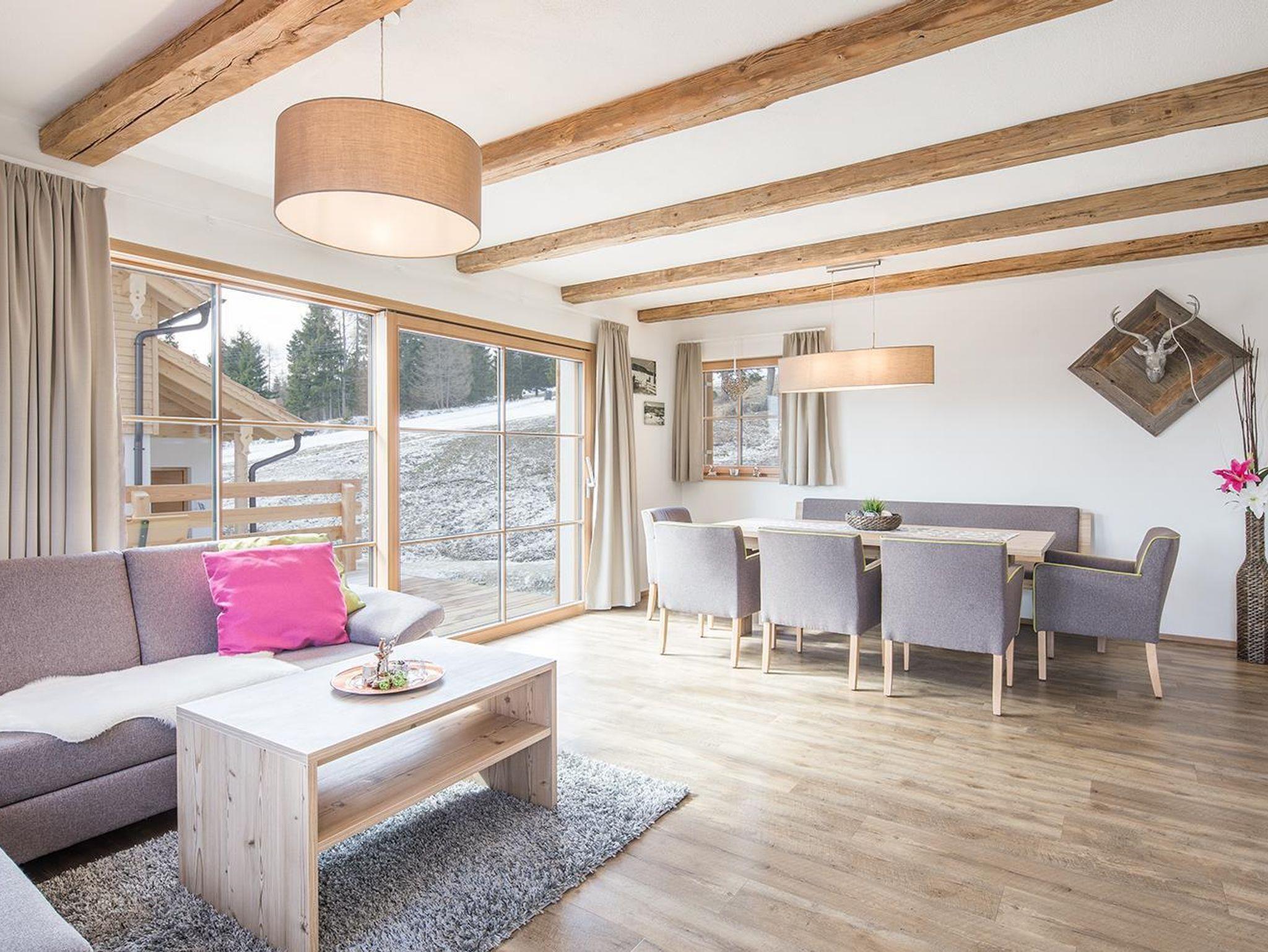 Zwei Stile sind kombiniert: Der Bauerntisch und die Holzsessel identifizieren Küchen- und Essbereich zu typischer Ländlichkeit, der Wohnbereich ist im angesagten New-Country-Stil gehalten. Dem Gast stehen 3 Schlafzimmer, 3 Badezimmer, eine eigene Hüttensauna und eine schöne Sonnenterrasse zur Verfügung.