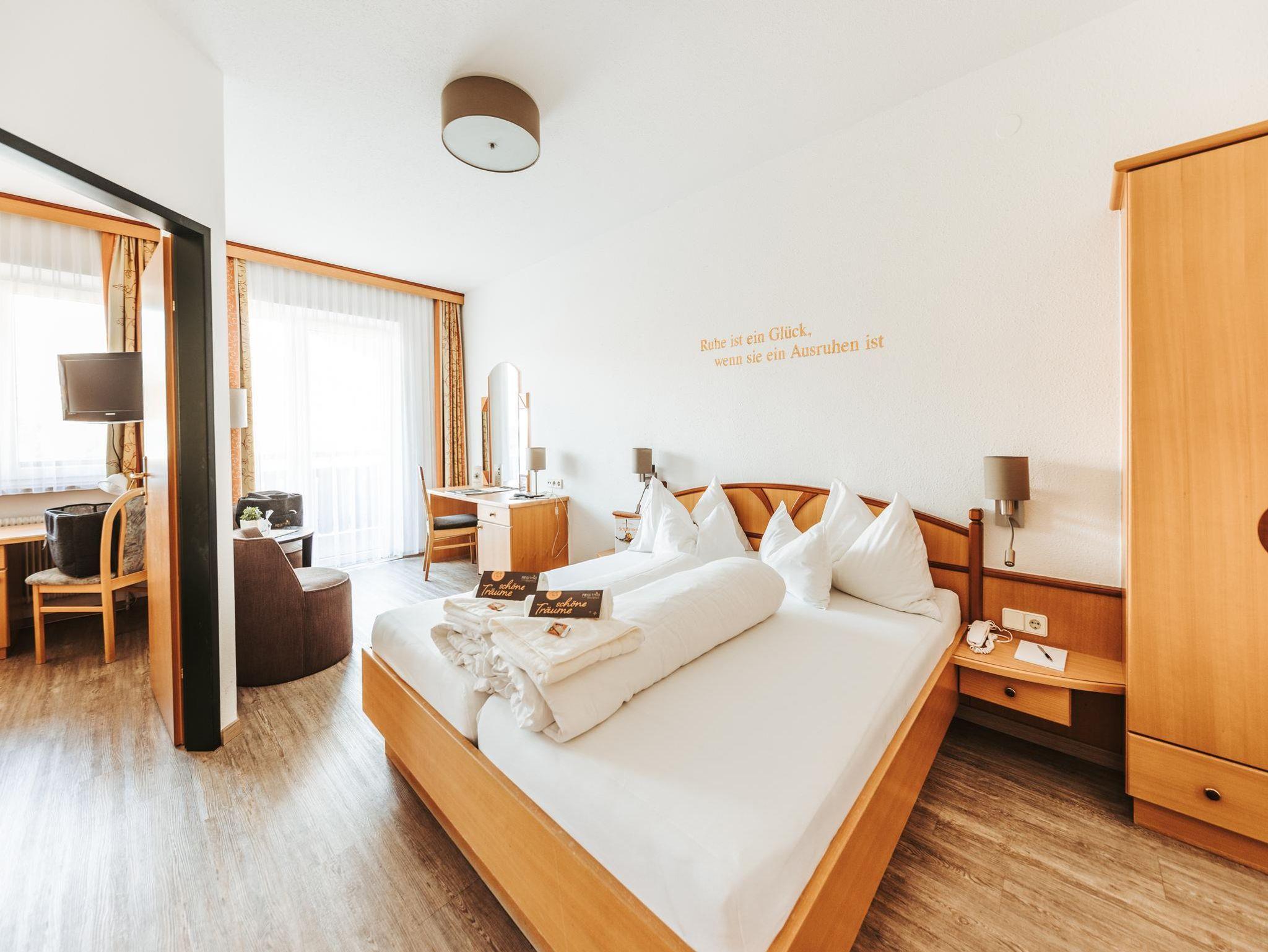 Zur absoluten Familienzeit werden Ihre Urlaubstage in unserem Familienzimmer. Das Zimmer bietet separate Eltern- und Kinderschlafzimmer und somit ausreichend Platz für alle. Vom Elternschlafzimmer geht es auf den sonnigen Westbalkon, wo beim Sonnenuntergang bei einem Glas Wein der Tag Revue passiert werden lassen kann.