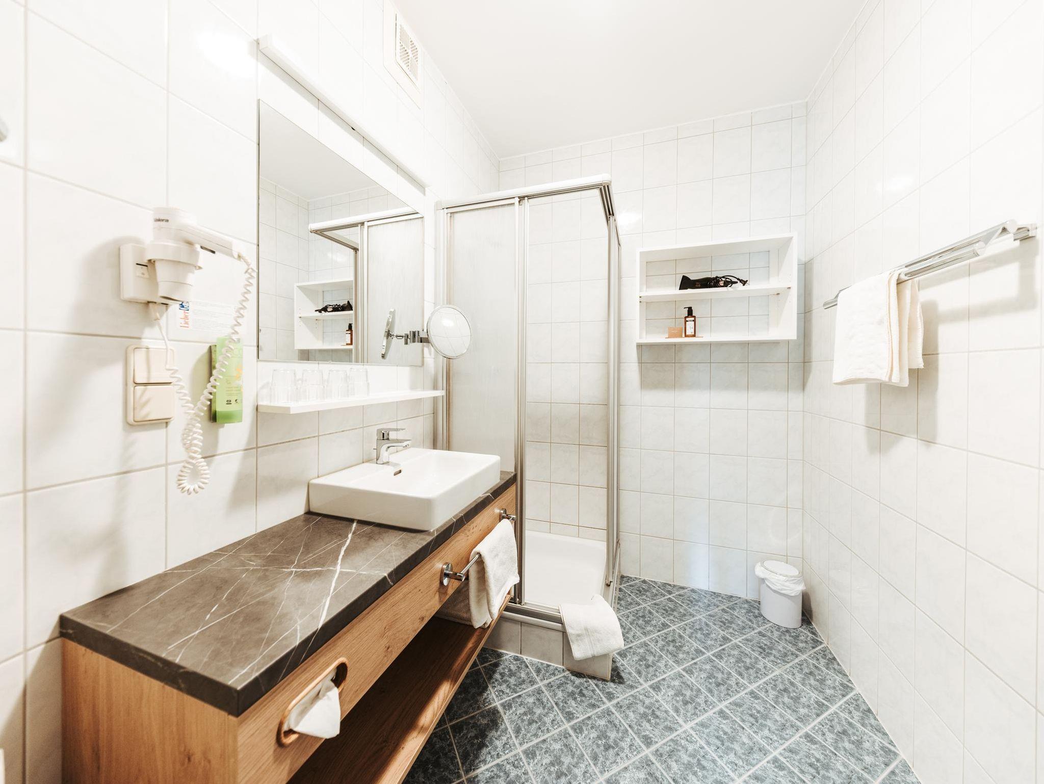• Badezimmer mit Dusche, separatem WC, Fön