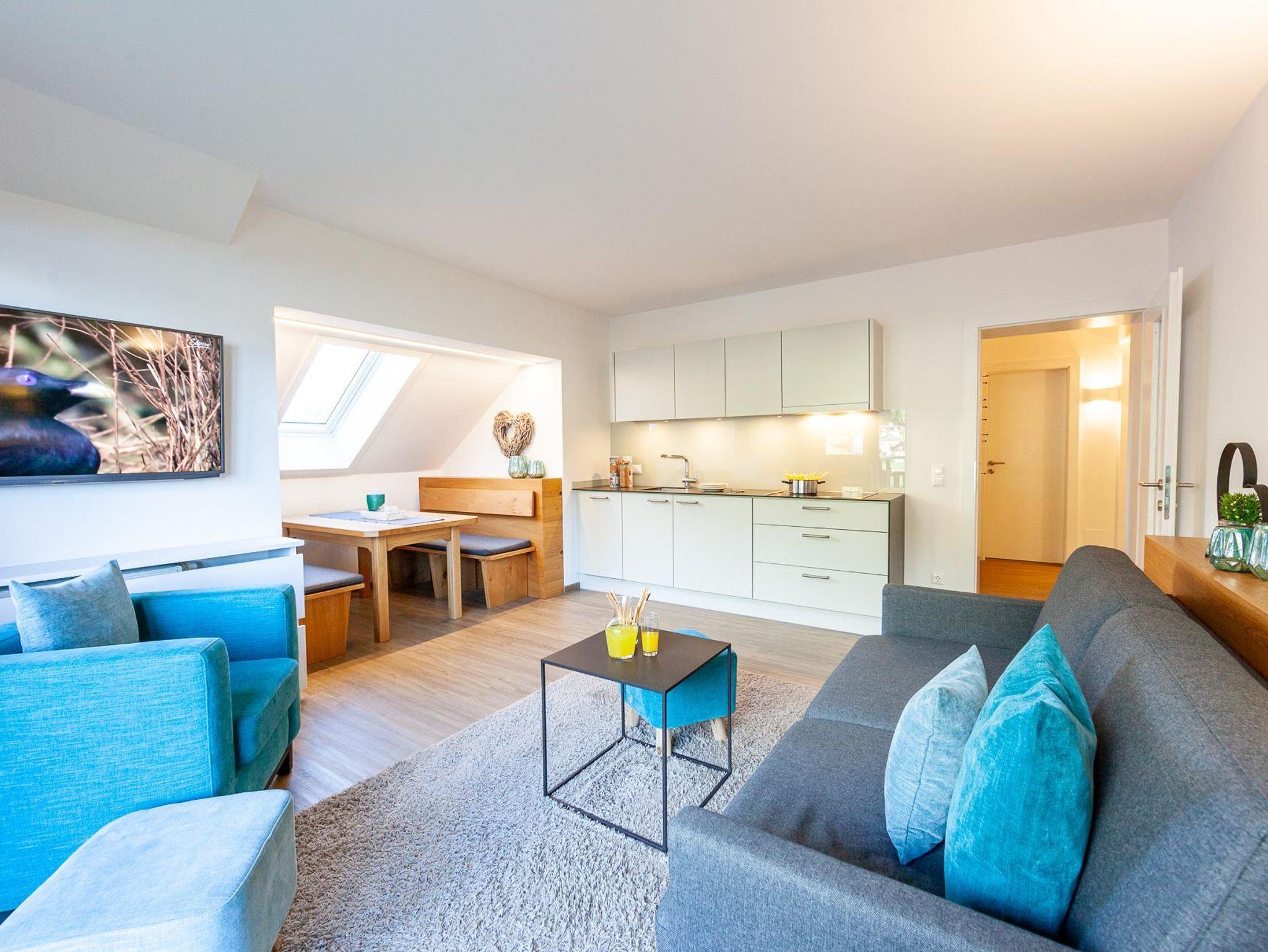 Zwei Schlafzimmer - einmal mit Doppelbett, einmal mit zwei höhenversetzten Einzelbetten - und eine gemütliche Schlafcouch im Wohnzimmer versprechen flexible, erholsame Schlafmöglichkeiten. Das Bad mit Dusche ist vom WC getrennt.