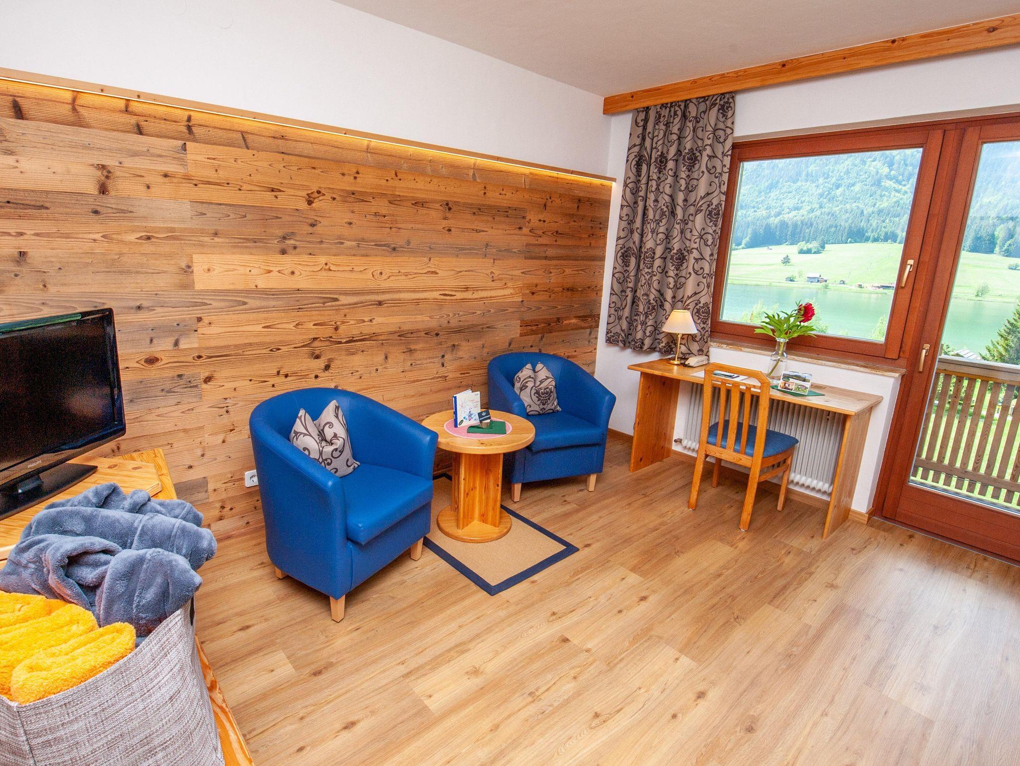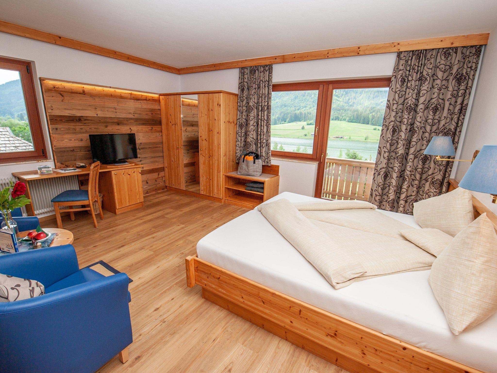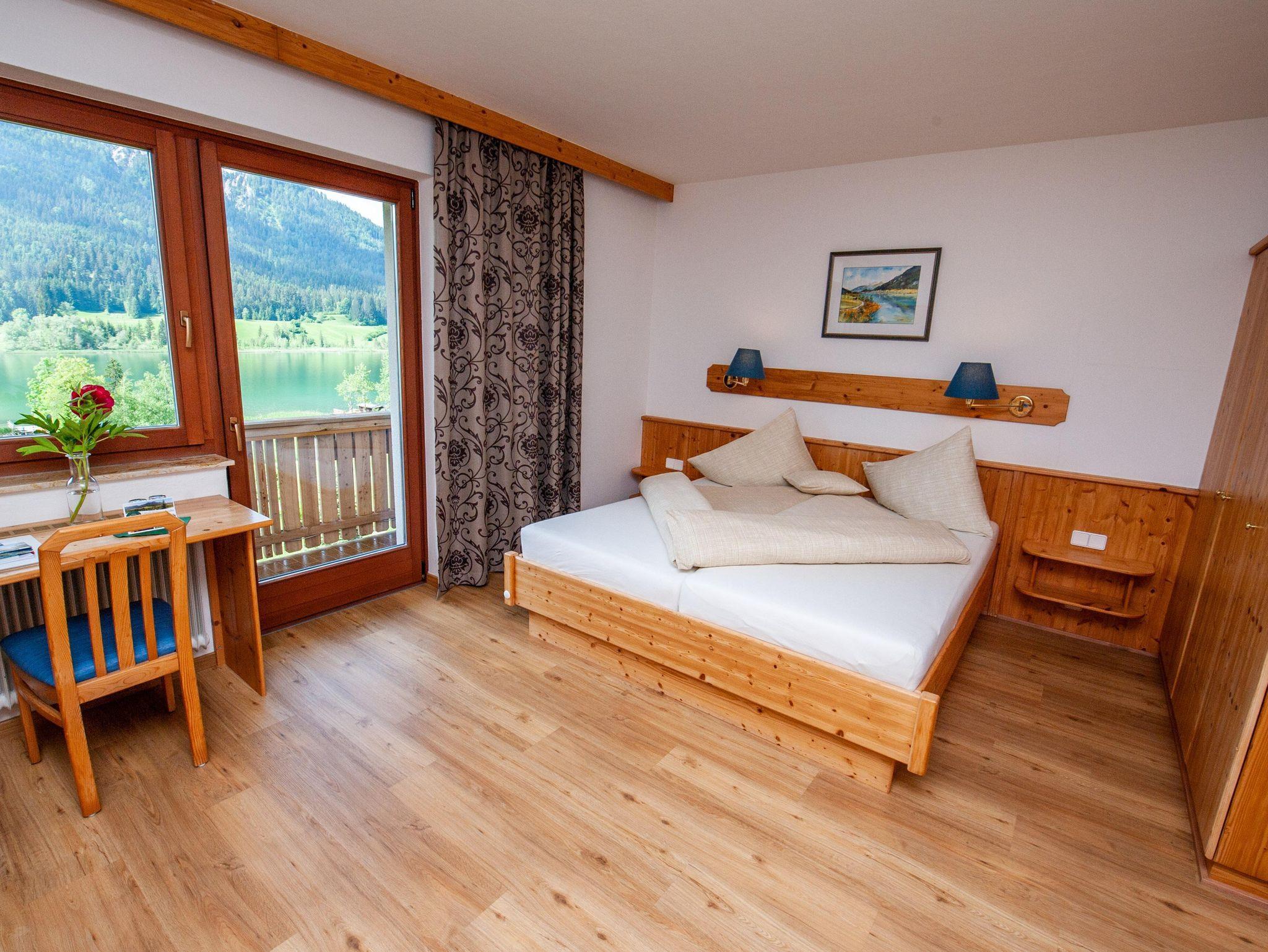 Unsere Doppelzimmer Südseite, sind alle hell und freundlich eingerichtet - Naturholzmöbel - großer Balkon mit Seeblick, haben zw. 27 und 32m² , Sitzecke, TV, Schreibtisch.