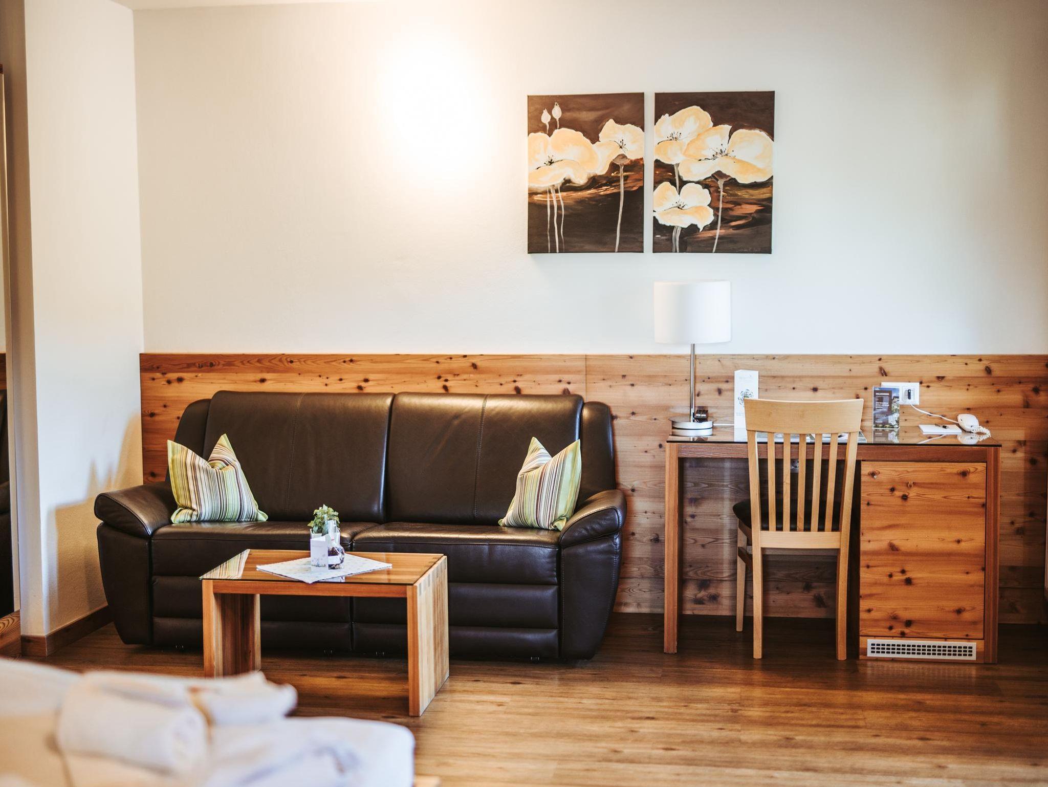 • Sitzecke mit Couch und Schreibtisch mit Sessel