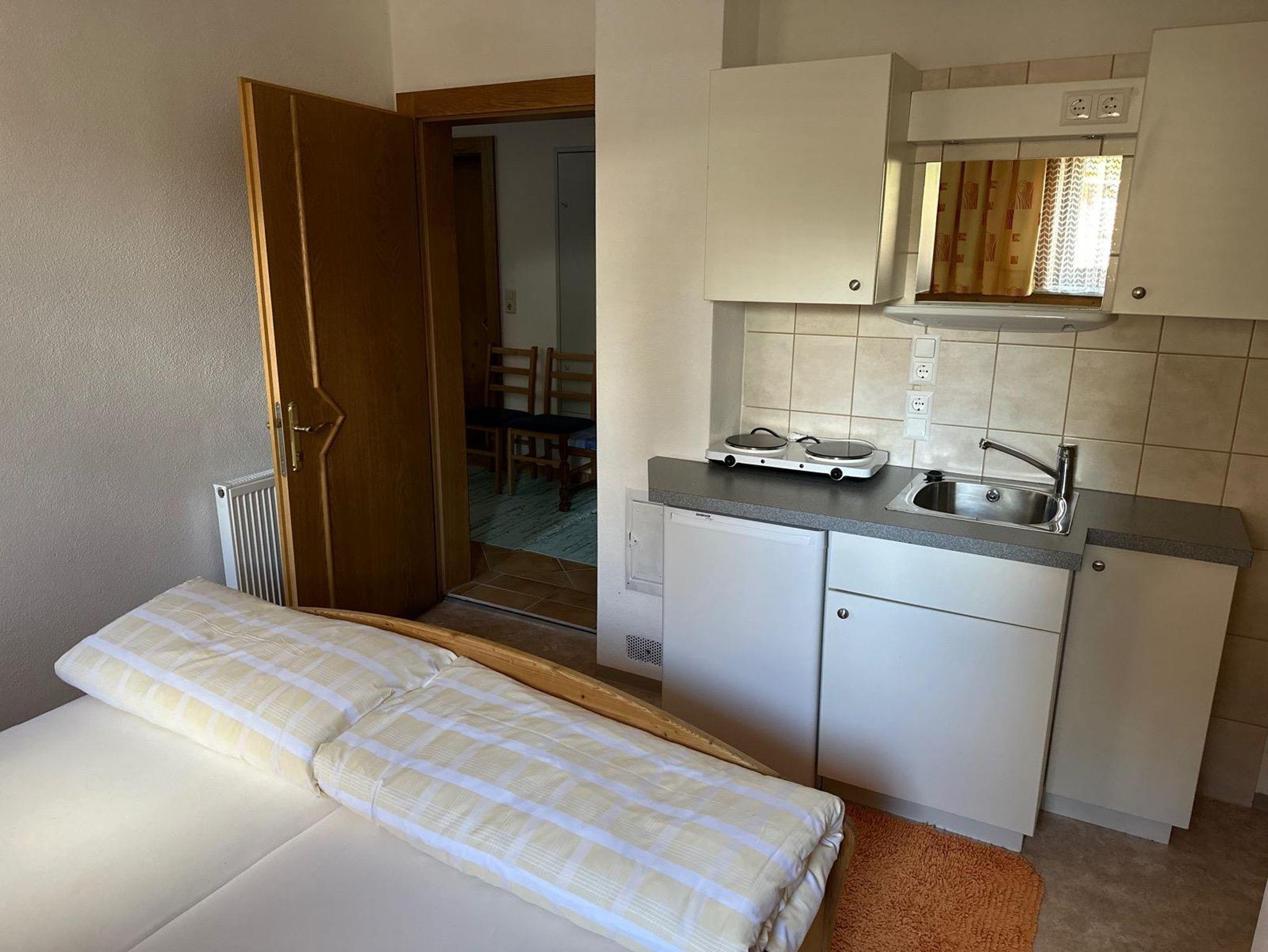 Studioappartement mit kleiner Küchenzeile. (2 Herdplatten, Kühlschrank, Kaffeemaschine)