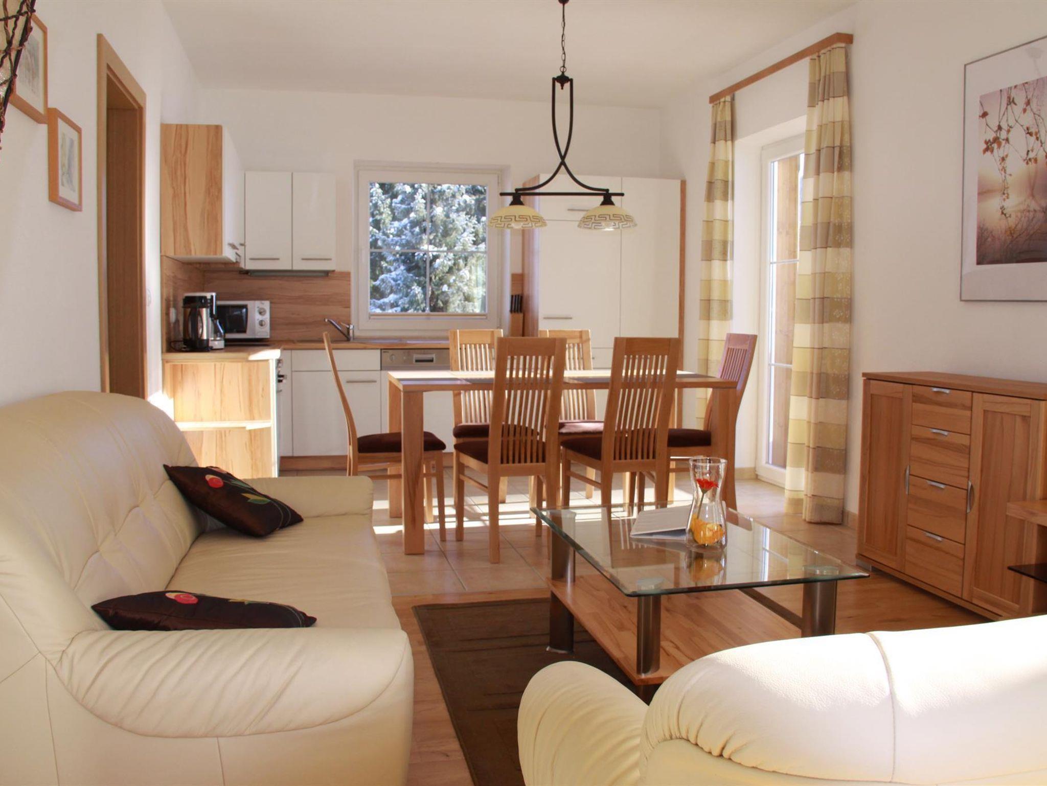 3 Schlafzimmer, 2–3 Bädern (Dusche/WC, Badewanne/WC), Physioterm-Wellnesskabine, privatem Balkon mit herrlicher Aussicht großzügiger Wohnraum mit Sitzecke, Flachbildschirm, DVD-Player, Stereoanlage, kostenloses WLAN komplett ausgestattete Küche mit Geschirrspüler, Kühlschrank mit Gefrierfach, Elektroherd mit Backofen, Mikrowelle, Kaffeemaschine, Wasserkocher, Toaster zusätzliches SAT-TV in einem Schlafzimmer Waschmaschine, Bügelbrett, Bügeleisen, Staubsauger in jedem Apartment Eichenparkettboden für angenehmes Wohnklima wöchentlicher Wechsel von Bettwäsche und Handtüchern Lift in alle Apartments