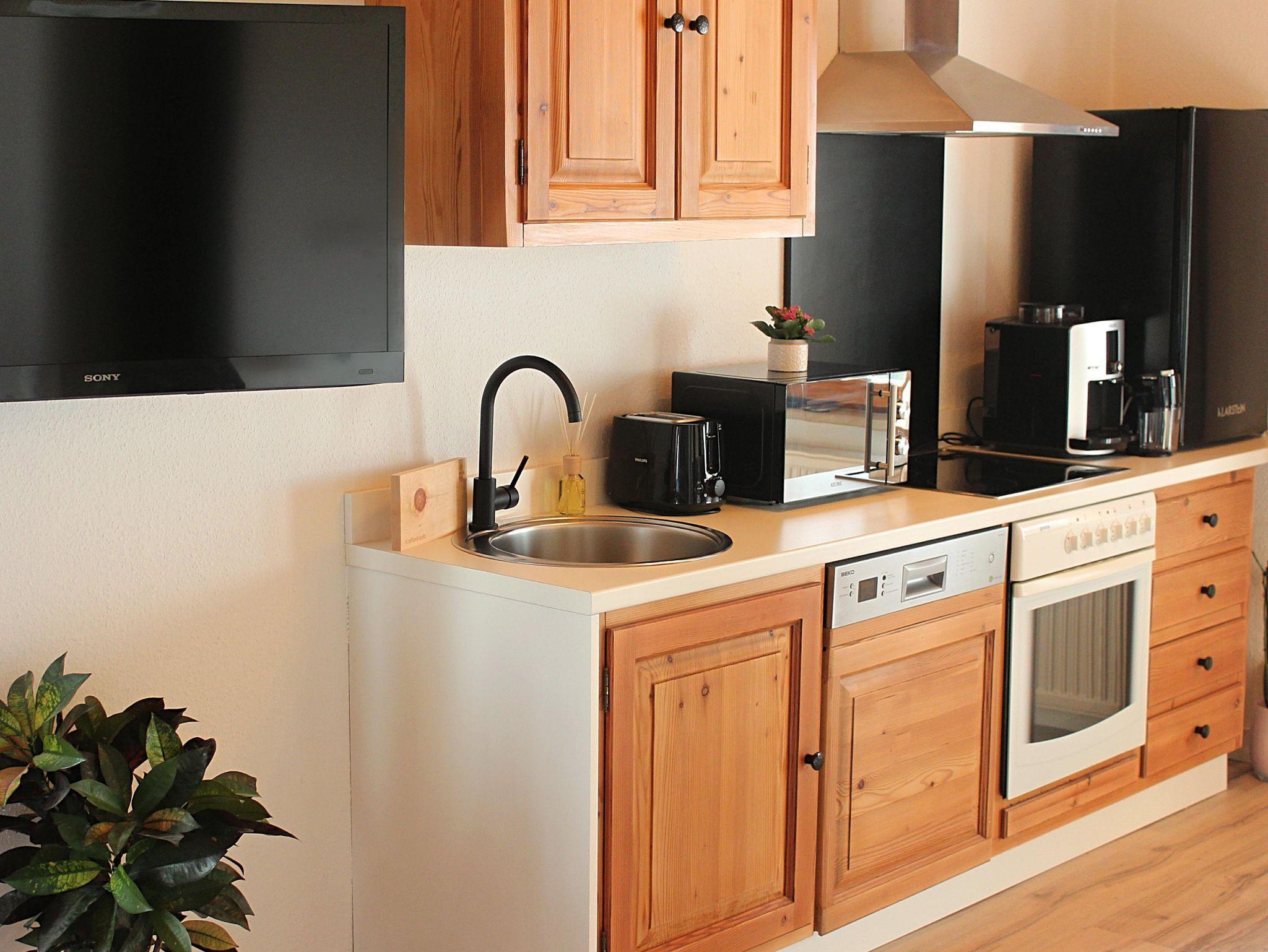 • Voll ausgestattete Holzküche mit Küchenutensilien, Kaffeevollautomat, Kühlschrank, Geschirrspüler, Toaster