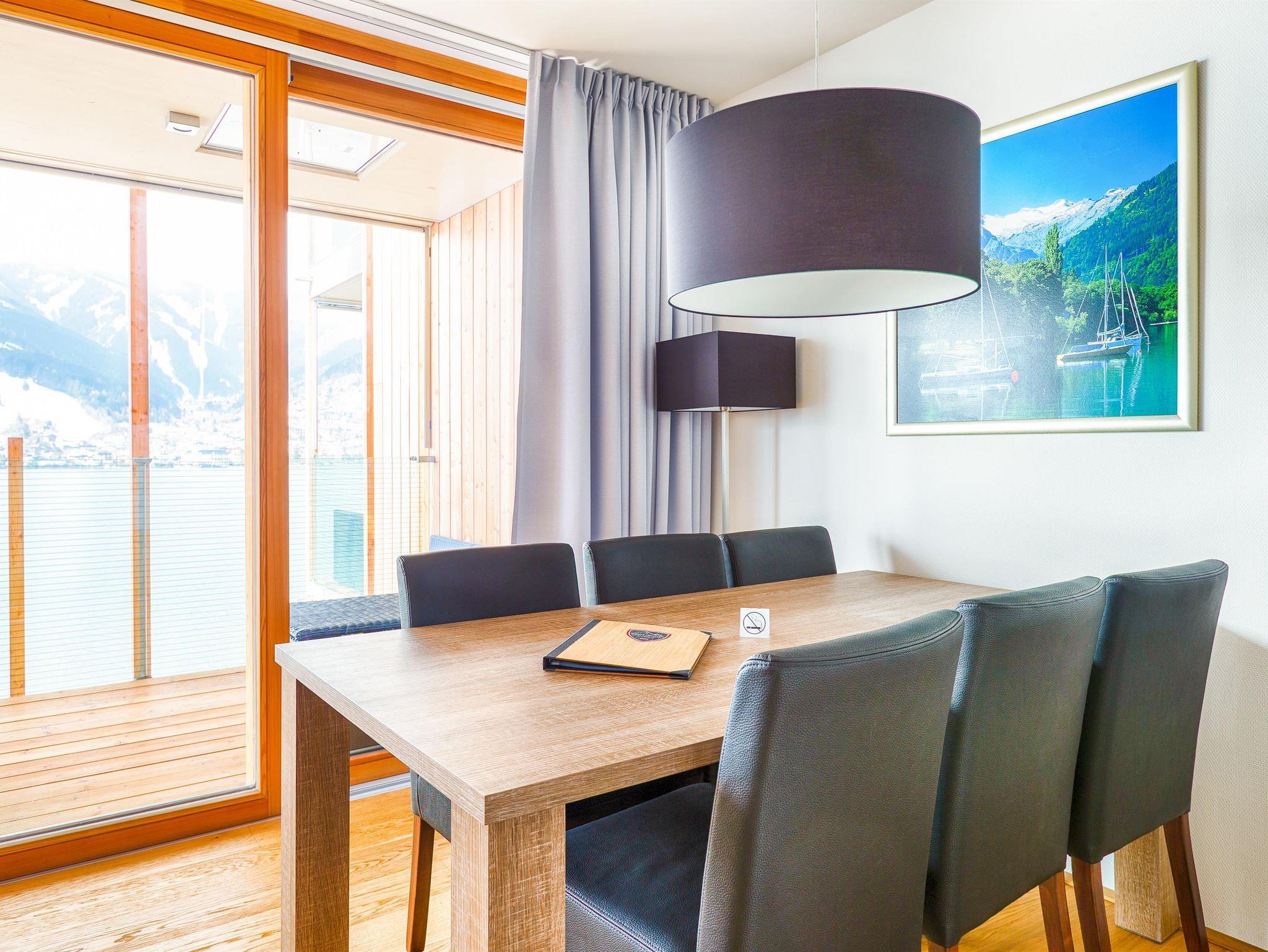 Das neu renovierte Deluxe Apartment mit 85 m2 verfügt über zwei Schlafzimmer, mit jeweils einem Doppelbett, sowie zwei Badezimmer mit Badewanne und Dusche und einem getrennten WC. Das geräumige und großzügige Wohnzimmer im alpenländischen Stil hat einen großen Esstisch und eine offene Designerküche. In der gemütlichen und großzügigen Sitzecke erschließt sich ein wundervoller Blick auf den See und die umliegenden Berge. Von den beiden Balkonen aus genießt man ebenfalls einen herrlichen Blick auf den Zeller See, die Schmittenhöhe und das Kitzsteinhorn.