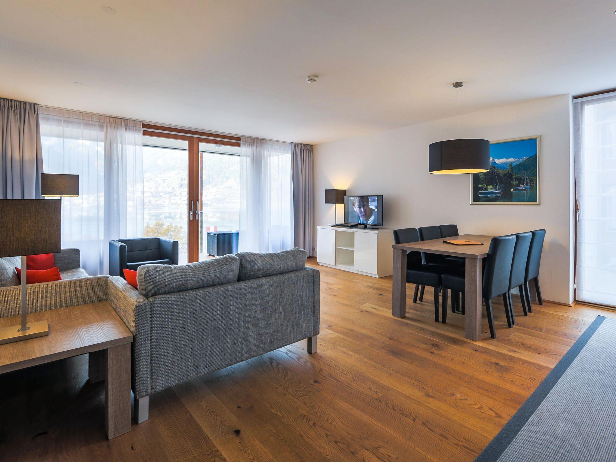 Das Apartment mit drei Schlafzimmern befindet sich auf der zweiten Etage der Residence Bellevue. Die Schlafzimmer sind jeweils mit einem Doppelbett ausgestattet. Zusätzlich gibt es ein Badezimmer mit Badewanne / Dusche und WC. Das geräumige Wohnzimmer verfügt über einen großen Esstisch und eine offene Designerküche. Am Balkon eröffnet sich ein atemberaubender Blick auf die Berge und den See.