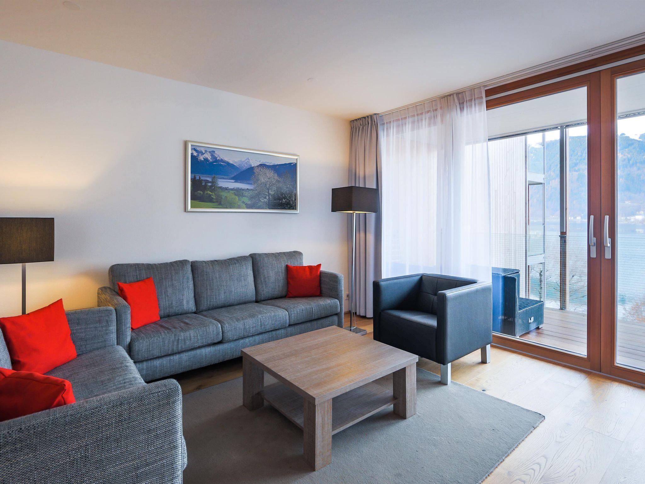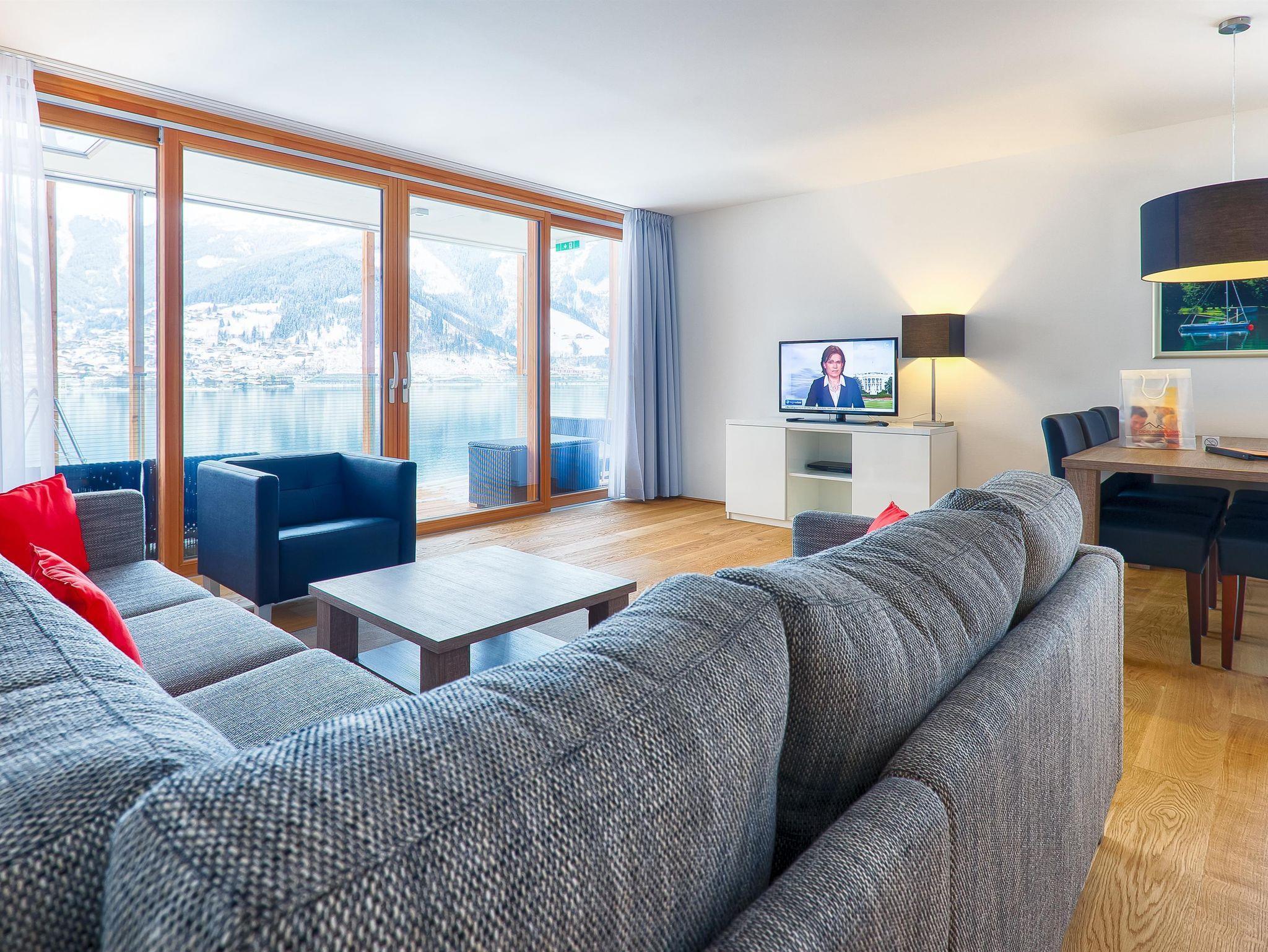 Erleben Sie das Bellevue-Gefühl: Die majestätische Schmittenhöhe umrahmt den klaren Zeller See direkt vor der Residenz. Entspannen Sie auf der eleganten Sonnenterrasse und genießen Sie den atemberaubenden Blick auf das Wasser und die umliegenden Berge.