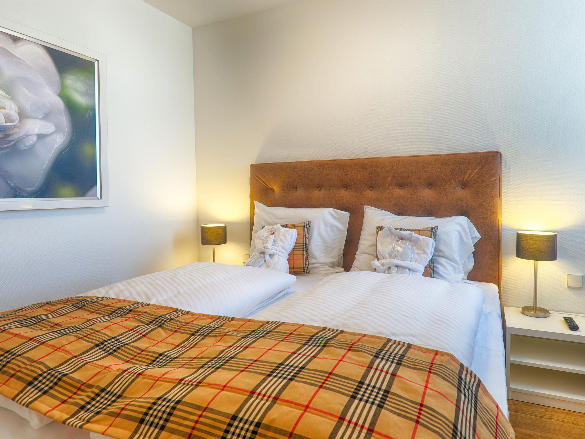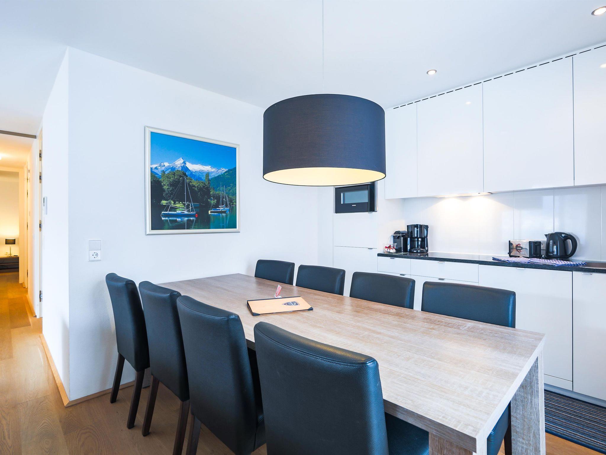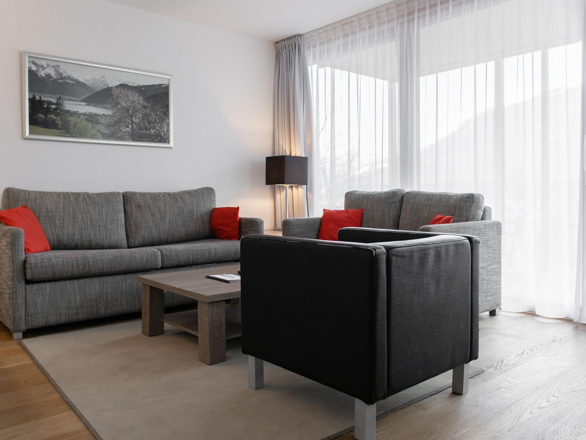 Das Apartment verfügt über zwei Schlafzimmer, mit jeweils einem Doppelbett, sowie zwei Badezimmer mit Badewanne oder Dusche und WC. Das geräumige Wohnzimmer verfügt über einen großen Esstisch und eine offene Designerküche. Vom Balkon aus genießt man einen herrlichen Blick auf den Zeller See.