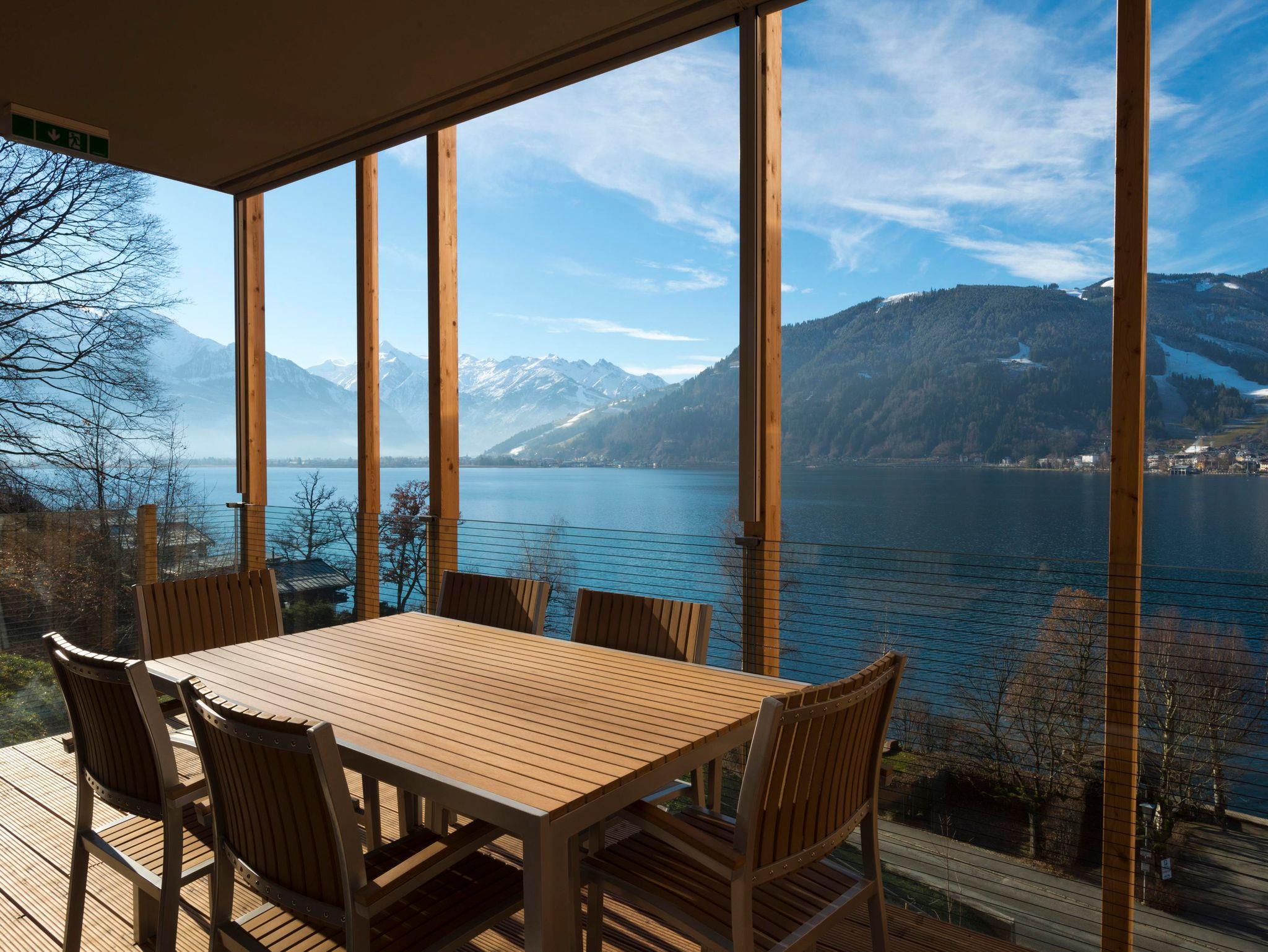 Erleben Sie das Bellevue-Gefühl: Die majestätische Schmittenhöhe umrahmt den klaren Zeller See direkt vor der Residenz. Entspannen Sie auf der eleganten Sonnenterrasse und genießen Sie den atemberaubenden Blick auf das Wasser und die umliegenden Berge.