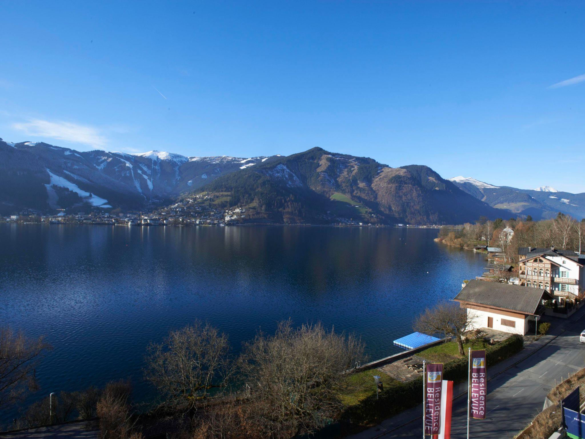 Erleben Sie das Bellevue-Gefühl: Die majestätische Schmittenhöhe umrahmt den klaren Zeller See direkt vor der Residenz. Entspannen Sie auf der eleganten Sonnenterrasse und genießen Sie den atemberaubenden Blick auf das Wasser und die umliegenden Berge.