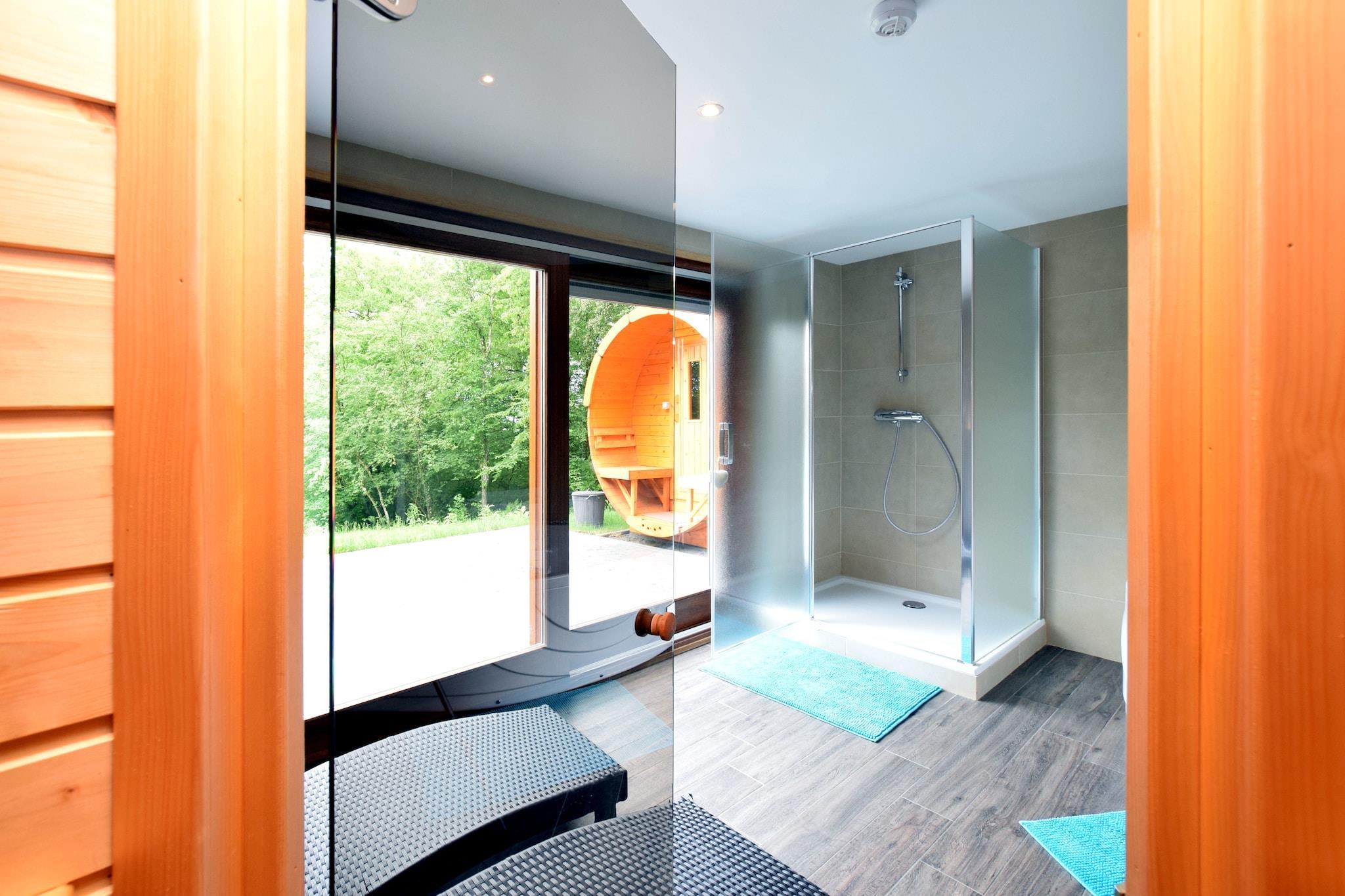 En ferie i stil, velegnet til store grupper. Det er det, du kan forvente af denne luksuriøse store hytte. Da huset blev bygget, betalte ejeren meget opmærksomhed på detaljer og kvalitet, og du kan se dette i alle aspekter. Og det er ikke alt Når det kommer til faciliteter, finder du alt hvad du kunne ønske dig: alle værelser er udstyret med en-suite badeværelser og der er et indendørs wellnessområde med infrarød sauna og jacuzzi. Der er også en traditionel sauna udendørs.Dette betyder, at du kan få et meget behageligt ophold her om vinteren. Og i varmere vejr kan du udvide din bolig ved at åbne dørene til din balkon / terrasse og haven, hvor alle kan have morgenmad, frokost eller middag sammen eller bare slappe af med et glas vin eller en belgisk øl. Har vi nævnt alle de gode ting om dette hus? Ikke helt - der er stadig den storslåede udsigt over de sydlige Ardennernes bakker ! Du vil indse, hvor langt syd du er her, når vi siger, at den franske grænse er kun 100 meter væk. En perfekt beliggenhed for at udforske området!