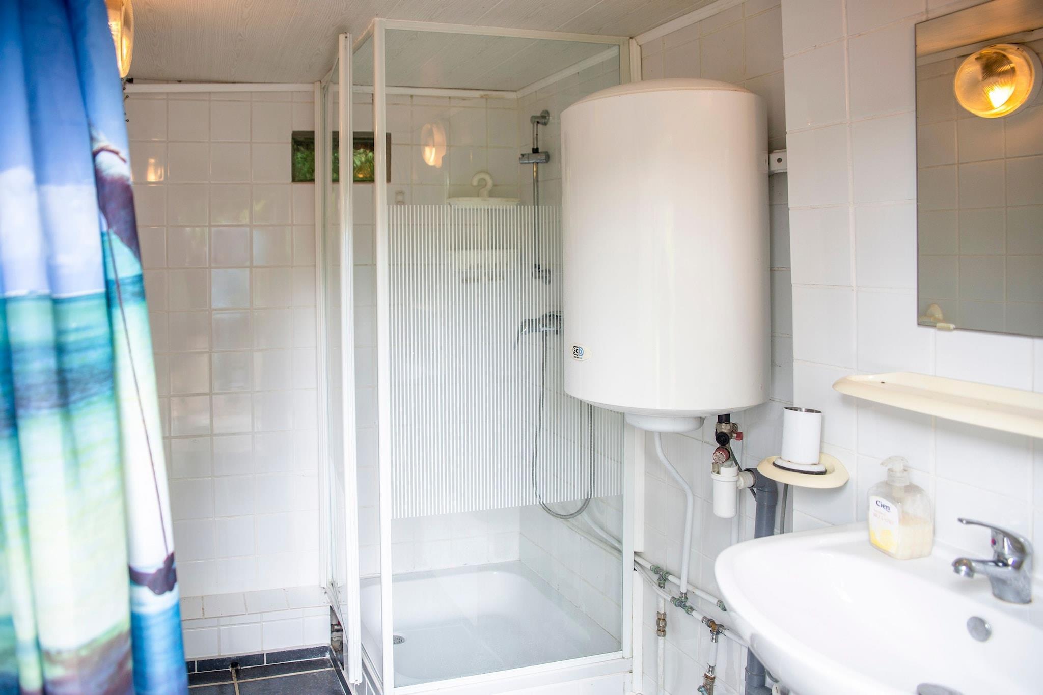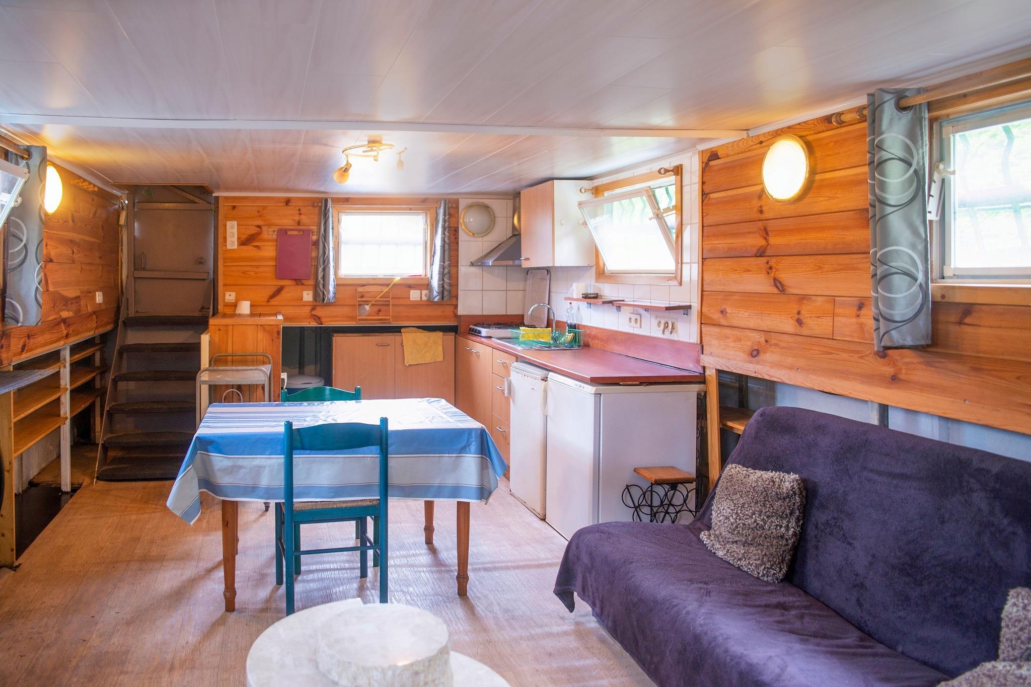 Båd: (tekøkken(kogeplade(Komfur med fire kogeplader, gas), elkedel, emhætte, kaffemaskine, køleskab, fryser), Stue/soveværelse(dobbeltsovesofa, dobbelthøjseng(dobbelt dynebetræk, dobbeltlagen, 140 x 200 cm), Fjernsyn(fladskærm, parabol, digital), spisebord(4 personer), kakkelovn(træ)), terrasse, tagterrasse) Blokhytte: (badeværelse(bruser, håndvask, varme(elektrisk)), sanitært rum(toilet)) fortøjningsbro, patio, terrasse(privat), have, havemøbler, dam, Solcreme, Haveskur