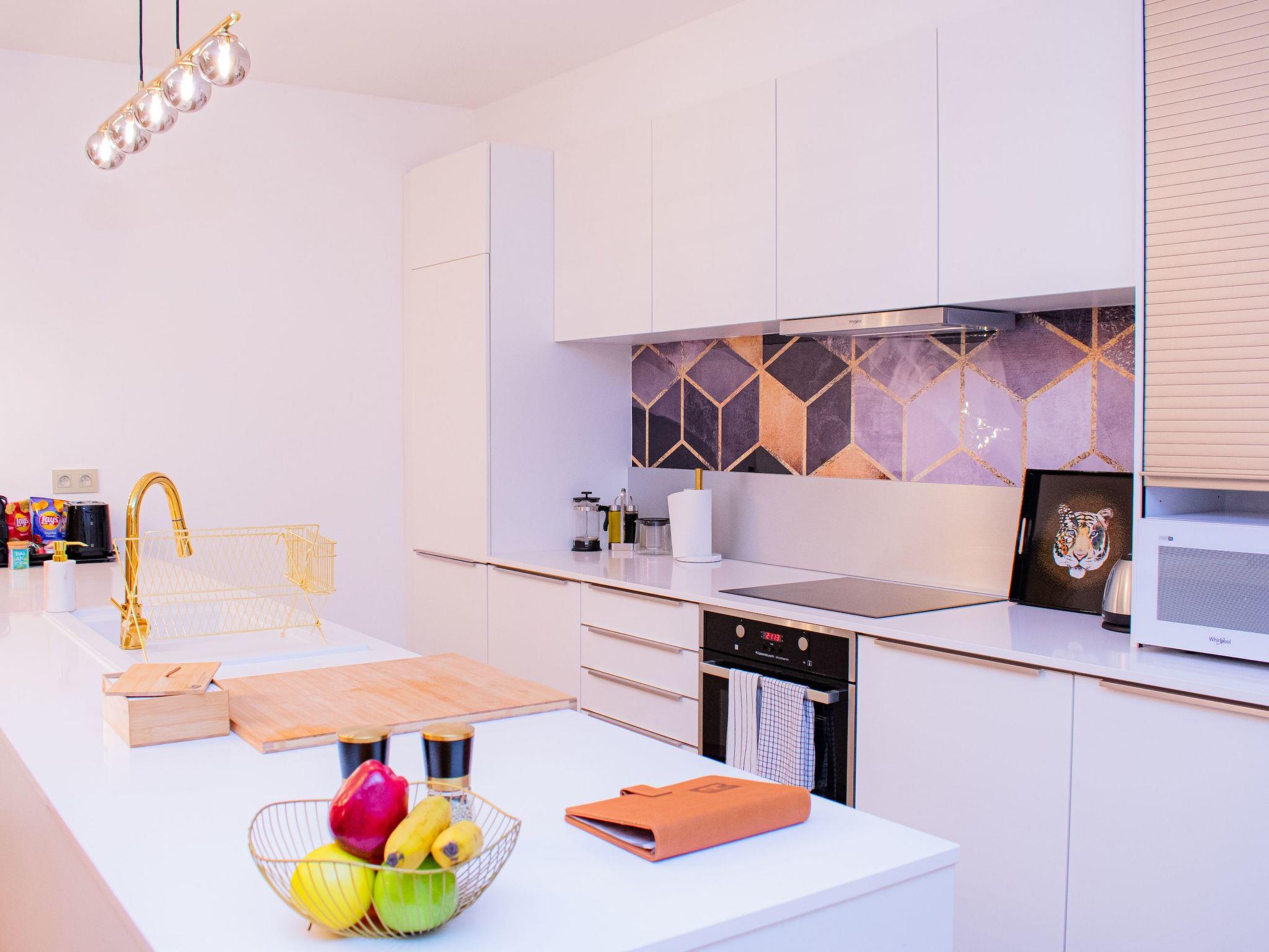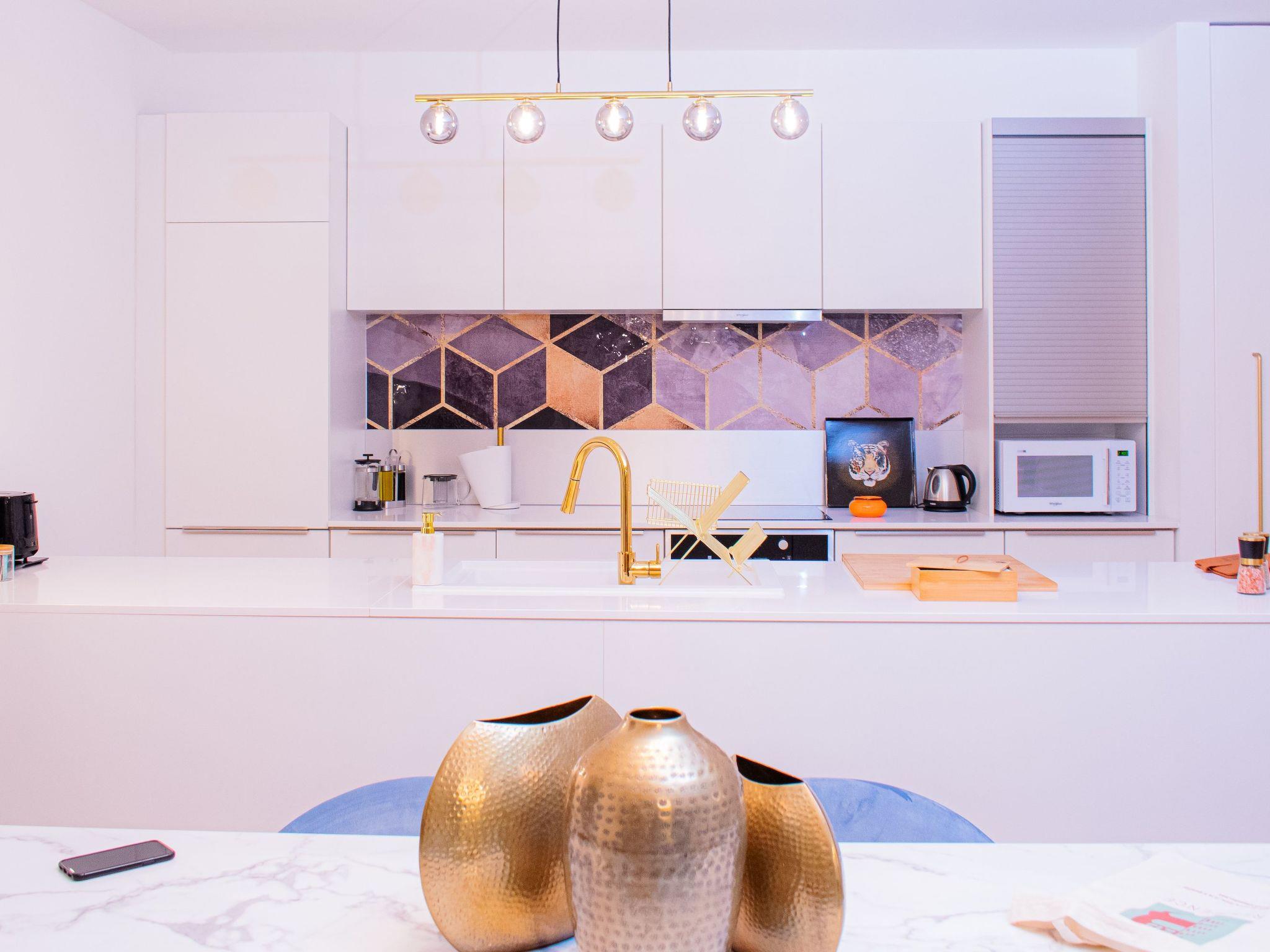 Inside, the residence boasts an exquisitely balanced interior that caters to both aesthetics and functionality. The open-concept kitchen, living, and dining areas are meticulously arranged to foster communal interactions, making every moment a chance to create memories together. Expect to be indulged with high-end amenities; the kitchen shines with an induction hob, coffee machine, dishwasher, and electric kettle. Comfort is further enhanced by the inclusion of a washing machine and clothes dryer for your exclusive use. The two regally appointed bedrooms each feature a King-size bed, promising restful slumbers. The bathroom is a luxurious haven equipped with a double vanity, a sumptuous walk-in shower, and a bathtub with a shower, ensuring your rituals are nothing short of opulent.