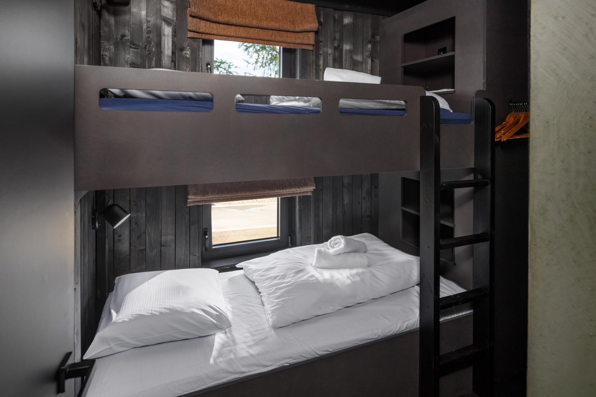 Stueetage: (entre(toilet), Stue(Fjernsyn(Smart-TV)), åbent køkken(elkedel, kaffemaskine(kopper), ovn, mikrobølgeovn, opvaskemaskine , køle-fryseskab), soveværelse(køjeseng), Soveværelse med badeværelse(dobbeltseng eller 2 enkeltsenge Senge, bruser(Walk-in-bruser), håndvask, toilet), Soveværelse med badeværelse(dobbeltseng eller 2 enkeltsenge Senge, bruser(Walk-in-bruser), infrarød sauna, håndvask)) havedøre, klimaanlæg, terrasse(overdækket), have, havemøbler, havepejs