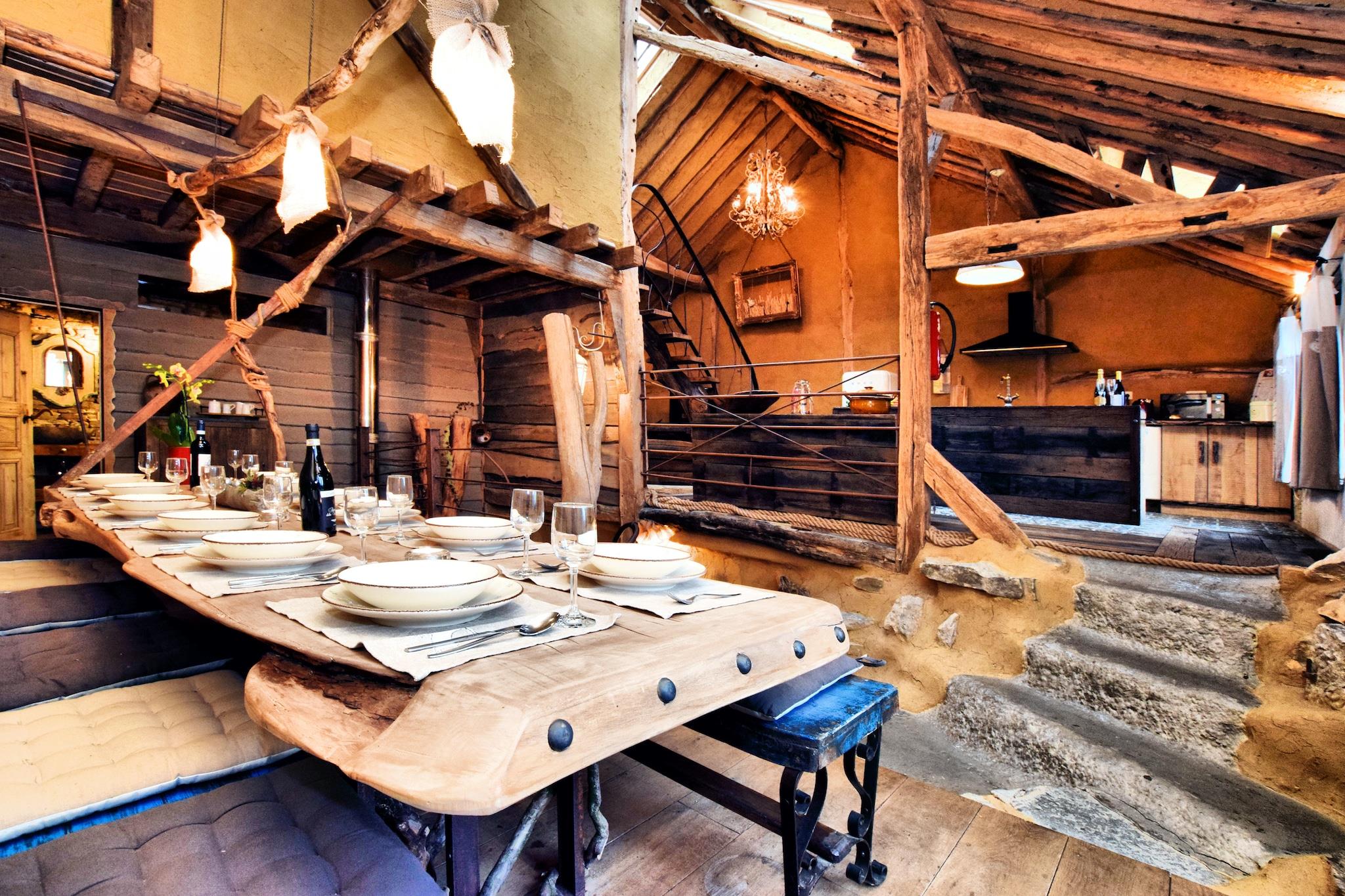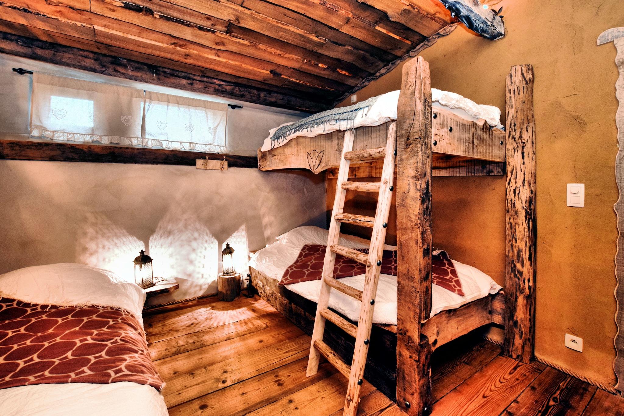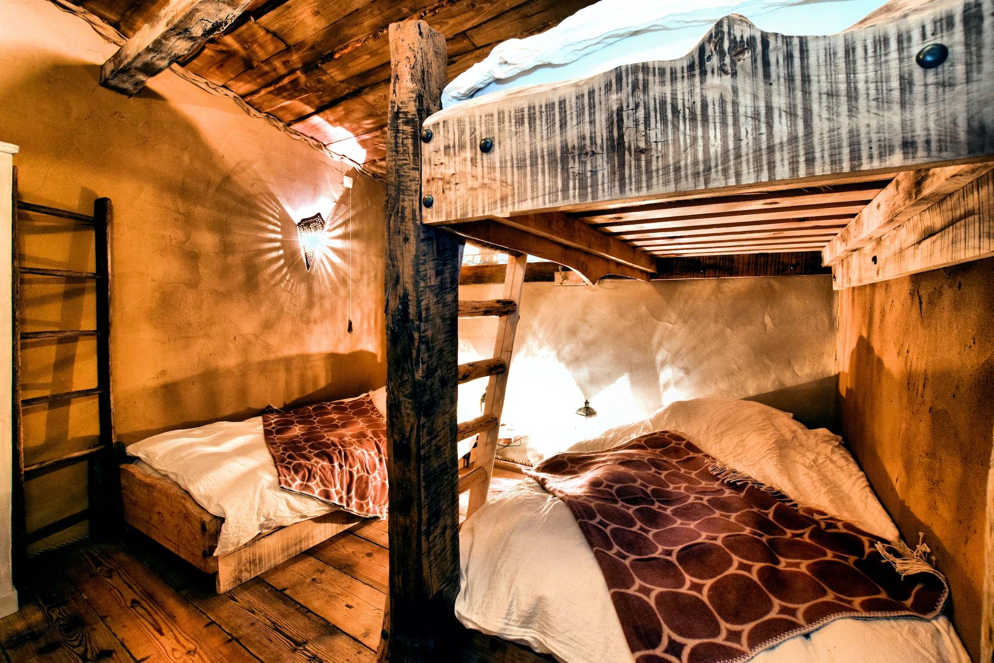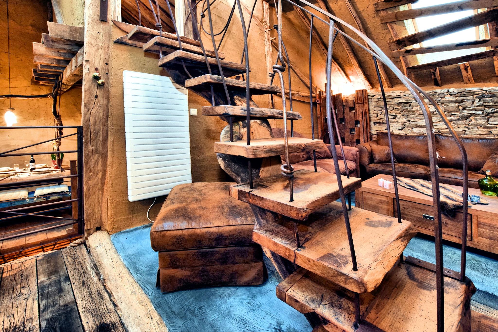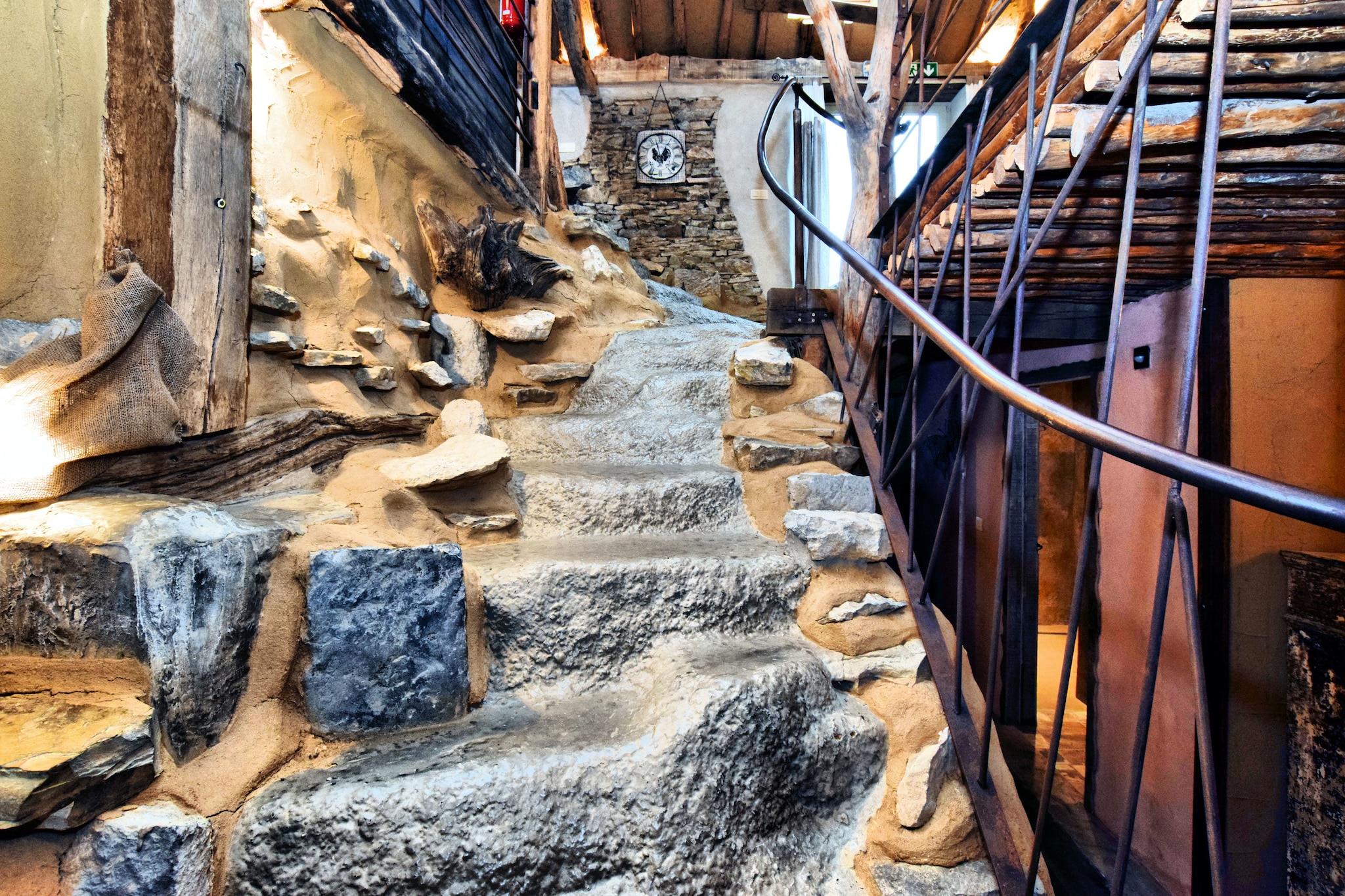 Et ophold i dette helt unikke hjem kan ikke engang kaldes en smuk oplevelse; det "sker". Fordi det du finder her, vil du næppe finde andre steder. Det starter, når du træder ind i den rummelige gang, hvor du kan se en brændeovn formet som en motorblok og pladsen omkring det er skåret ud som om du kommer ind i en hul. Dette tema fortsætter op ad trappen, der løber opad som stenrige trin. Men det er ikke alt. Det lange spisebord er lige placeret på gulvet, nej, kun den ene side er den anden side suspenderet! I stuen er der en trappe lavet af en træstamme, der fører op til det øverste soveværelse. Og her er også så mange detaljer, at du kan tilbringe hele dit ophold og kigge på dem. Køkkenet, badeværelserne og saunaen er lavet i den samme stil, men selvfølgelig har alle de nødvendige moderne faciliteter. Den store have er delt med BE-6997-57, men du har din egen tagterrasse. Der er kun en fare i forbindelse med dette hus: alt andet bagefter vil virke middelmådigt.