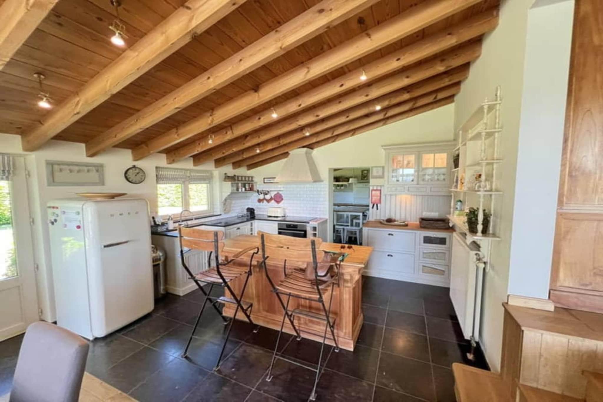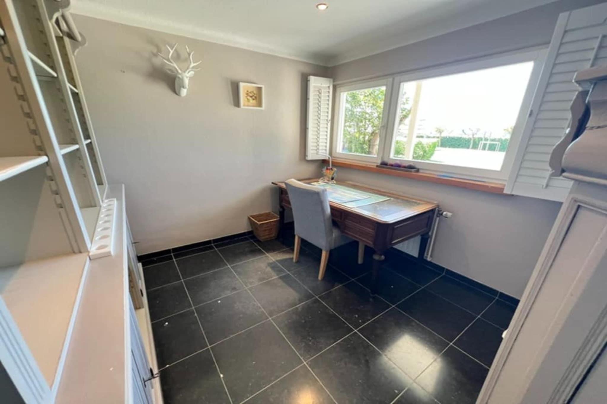 Forestil dig at slå dig ned i denne charmerende, fritliggende villa, et perfekt fristed for op til otte gæster, der søger en fredelig afslapning. Selvom villaen er kompakt på 36 m², er den omhyggeligt designet til at maksimere komfort og faciliteter, så alle har plads til at slappe af. Det primære opholdsområde inviterer dig til at slappe af med et hyggeligt siddeområde og underholdning via både kabel- og satellit-tv. Det fuldt udstyrede køkken er klar til enhver kulinarisk udfoldelse med en keramisk kogeplade med fire ringe, en kombineret mikrobølgeovn, et køleskab og en fryser. Kaffeelskere vil sætte pris på at have både en filterkaffemaskine og en espressomaskine samt en elkedel og brødrister. Med fire separate soveværelser er privatliv sikret for alle gæster. Soveværelserne omfatter tre værelser møbleret med dobbeltsenge og et fjerde værelse med to enkeltsenge, der komfortabelt rummer hele gruppen. For ultimativ afslapning har villaen også en privat sauna. Praktiske faciliteter er rigelige, hvilket forbedrer dit ophold. Villaen opvarmes af centralvarme, og badeværelset har et forfriskende brusebad, suppleret med et separat toilet. Ved længere ophold er der vaskemaskine og tørretumbler til rådighed. Udenfor kan du gå ud på terrassen og nyde den friske luft fra havemøblerne. Bekvemmelighed er nøglen her; du finder lokale restauranter og offentlig transport kun en kort køretur væk, og hovedbanegården er let tilgængelig. Selv hvis du flyver, ligger de store lufthavne inden for en rimelig rejseafstand, hvilket gør denne villa til en dejlig og tilgængelig base for din gruppes næste mindeværdige ferie.
