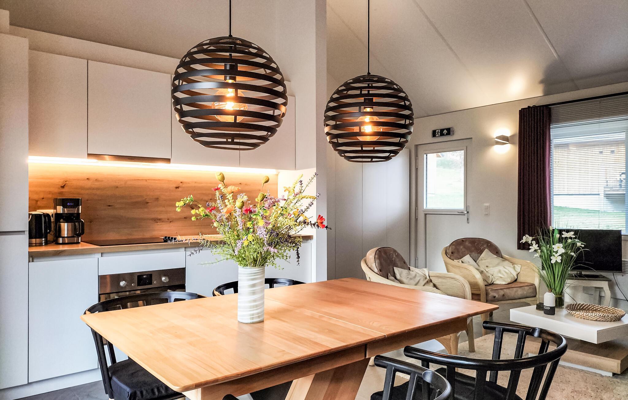 Dette stilfulde feriehus byder på den ideelle kombination af komfort og ro. De lyse værelser med deres store vinduespartier skaber en indbydende atmosfære og tilbyder jer en malerisk udsigt over de omkringliggende enge og skove. Her kan I slukke og lægge hverdagen bag jer. Begynd dagen med morgenmad på terrassen og indånd den friske skovluft. Det store grønne område foran huset er ideelt til at slappe af eller tilbringe ubekymrede timer med familien. Mens børnene leger, kan I nyde naturens fred og ro.