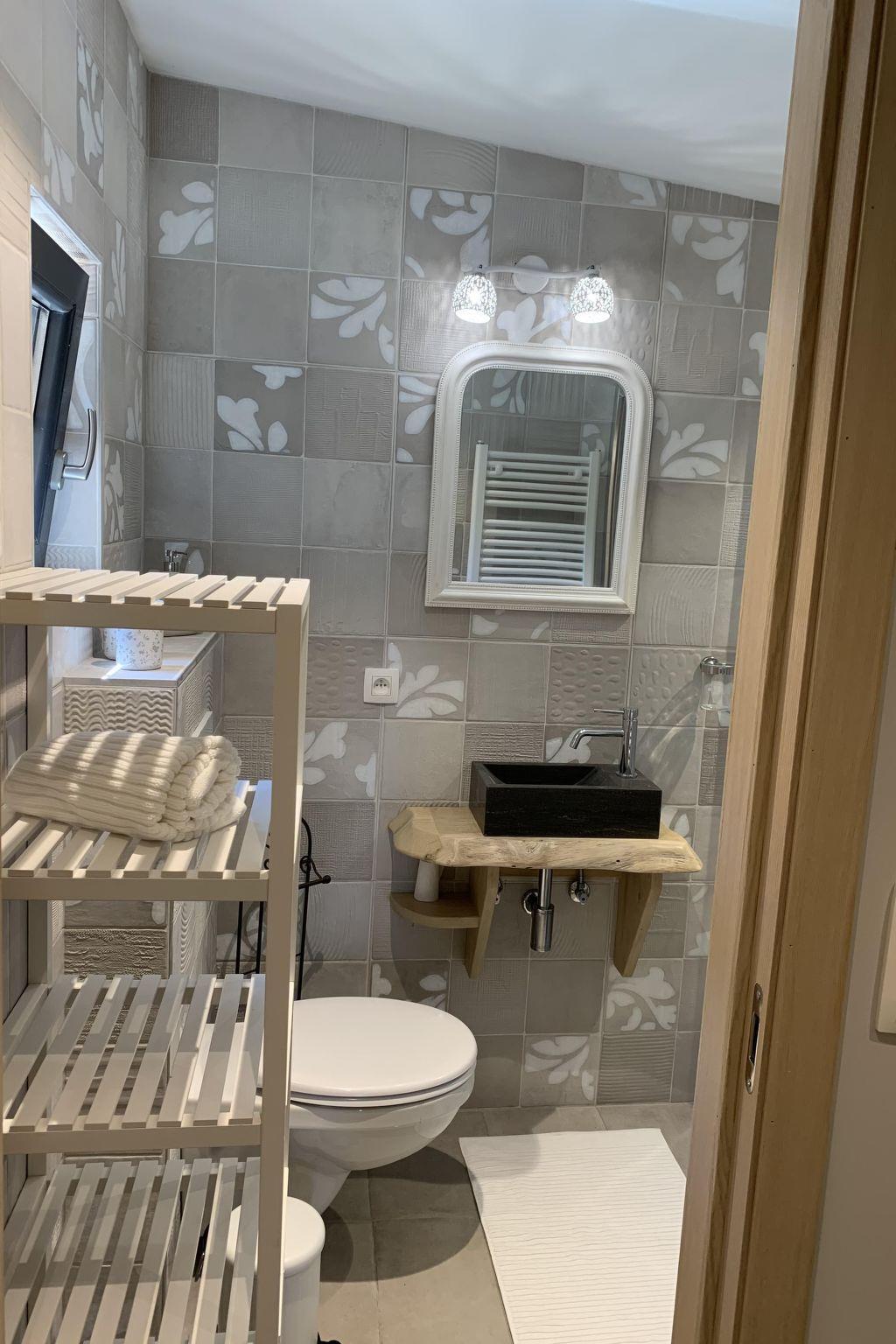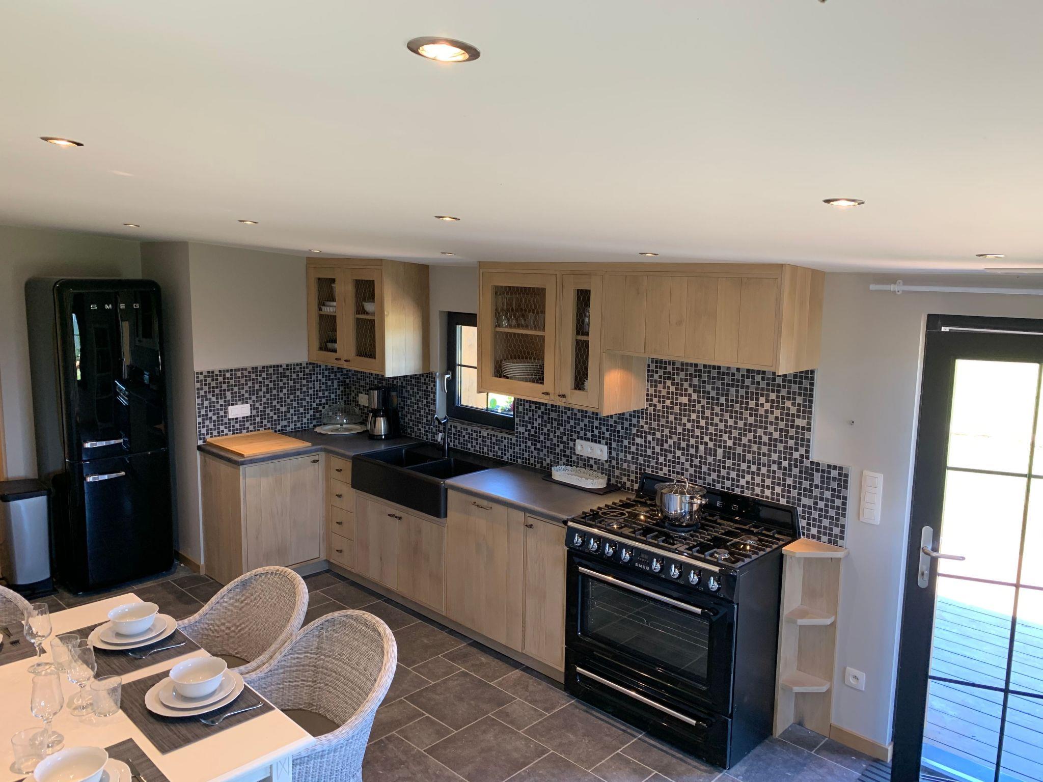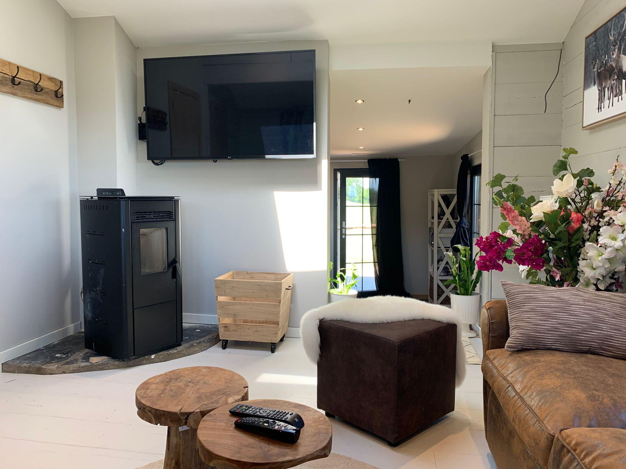 The house is on one level with only 2 steps separating the kitchen and bathroom from the living room and bedrooms. The chalet is surrounded by a terrace from which you enter the house. Entrance into the kitchen - dining room (5-burner piano and gas oven, fridge + freezer, microwave, small electrics, senseo, etc.). On one side, the living room with pellet stove, TV and internet. On the other side, the bathroom (Italian shower, washbasin, wc). Finally, the 2 bedrooms. Small utility room with washing machine.
