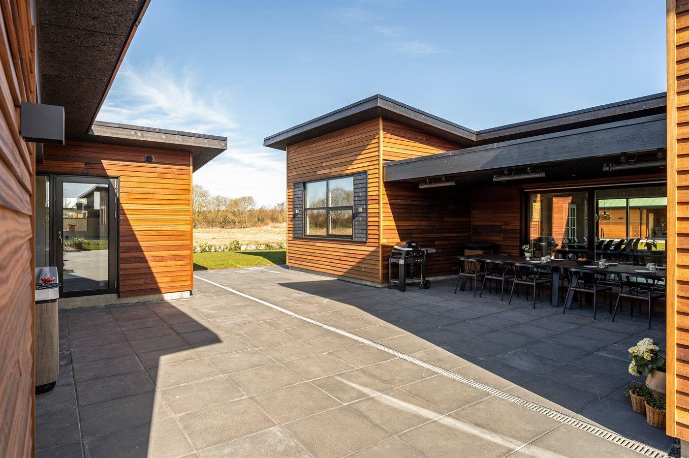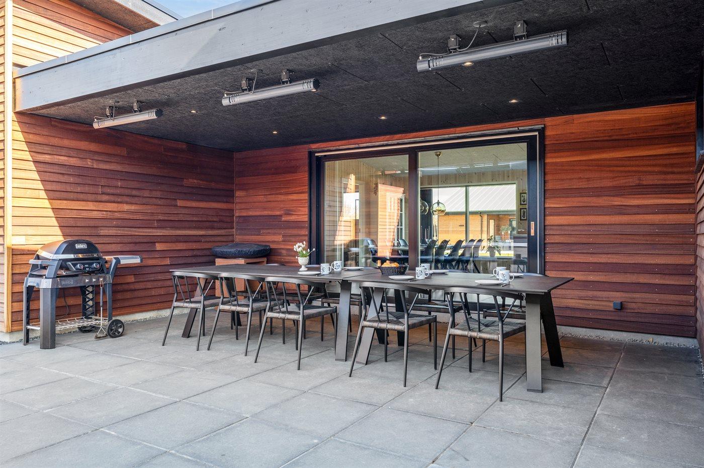 Store, overdækkede terrasser med el-grill.