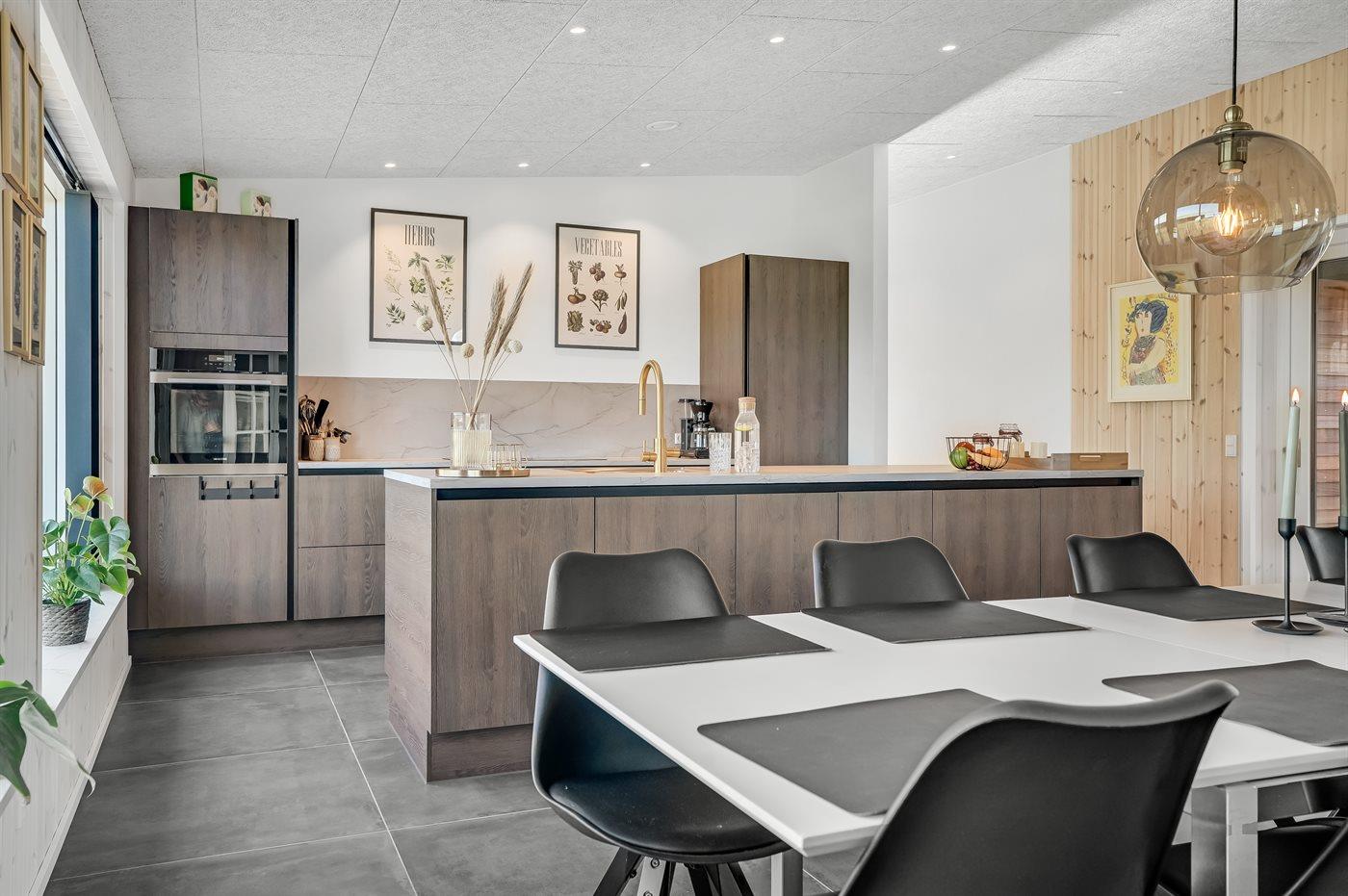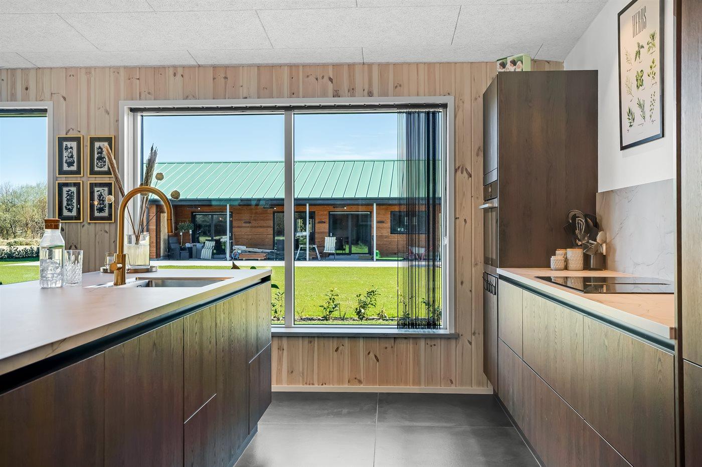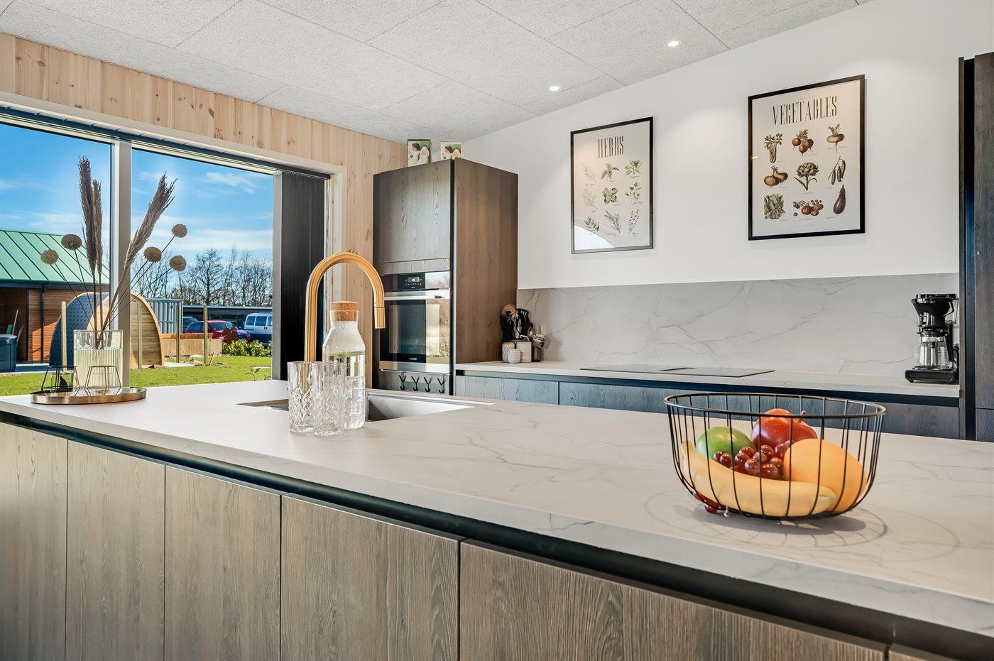Køkkenet er udstyret med 1 køleskab. Der er 4 induktionskogeplader, varmluftovn, mikrobølgeovn samt opvaskemaskine.