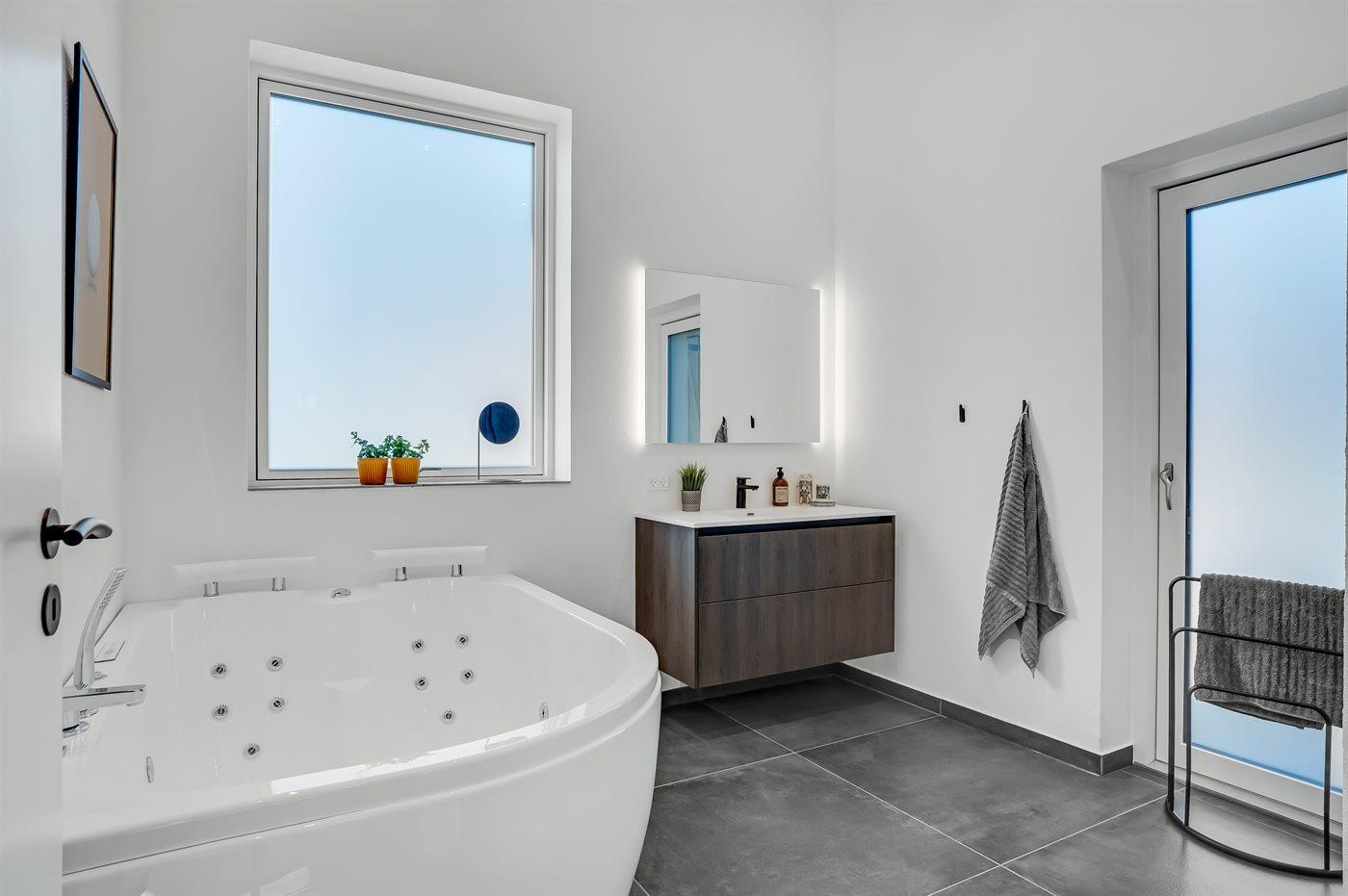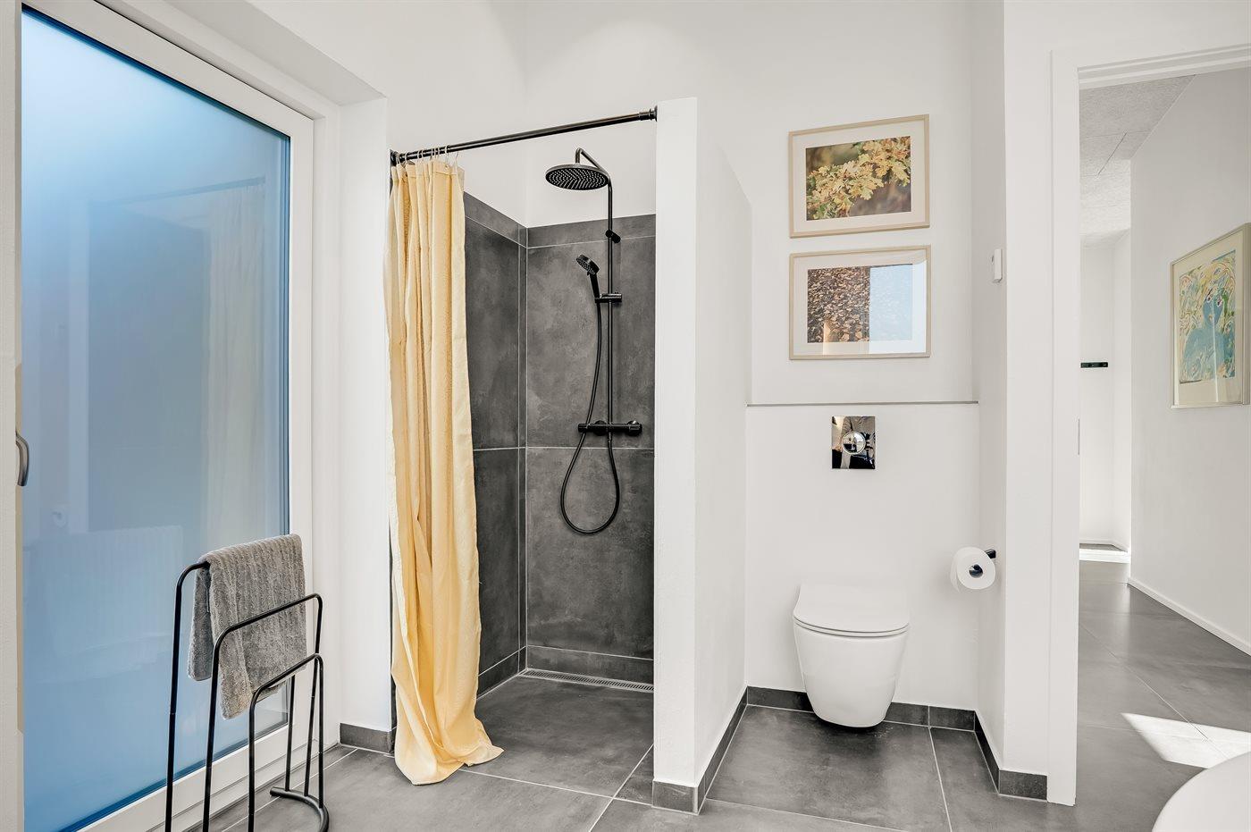 Der er 3 badeværelser med bruseniche og 3 toiletter. Der er gulvvarme på 3 badeværelser. I saunaen er der mulighed for afslapning.