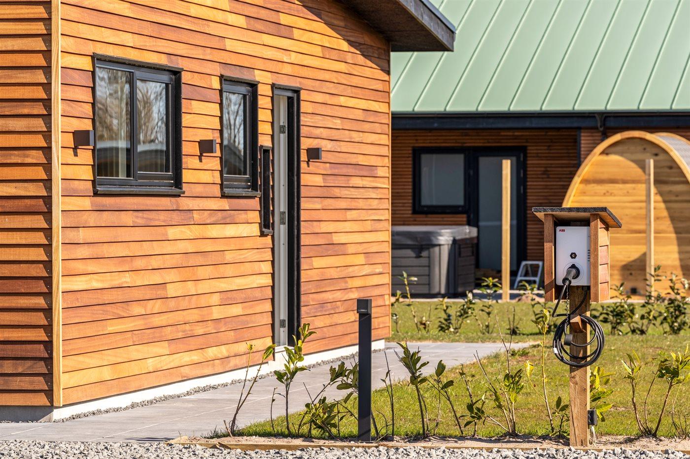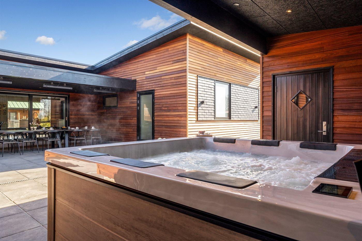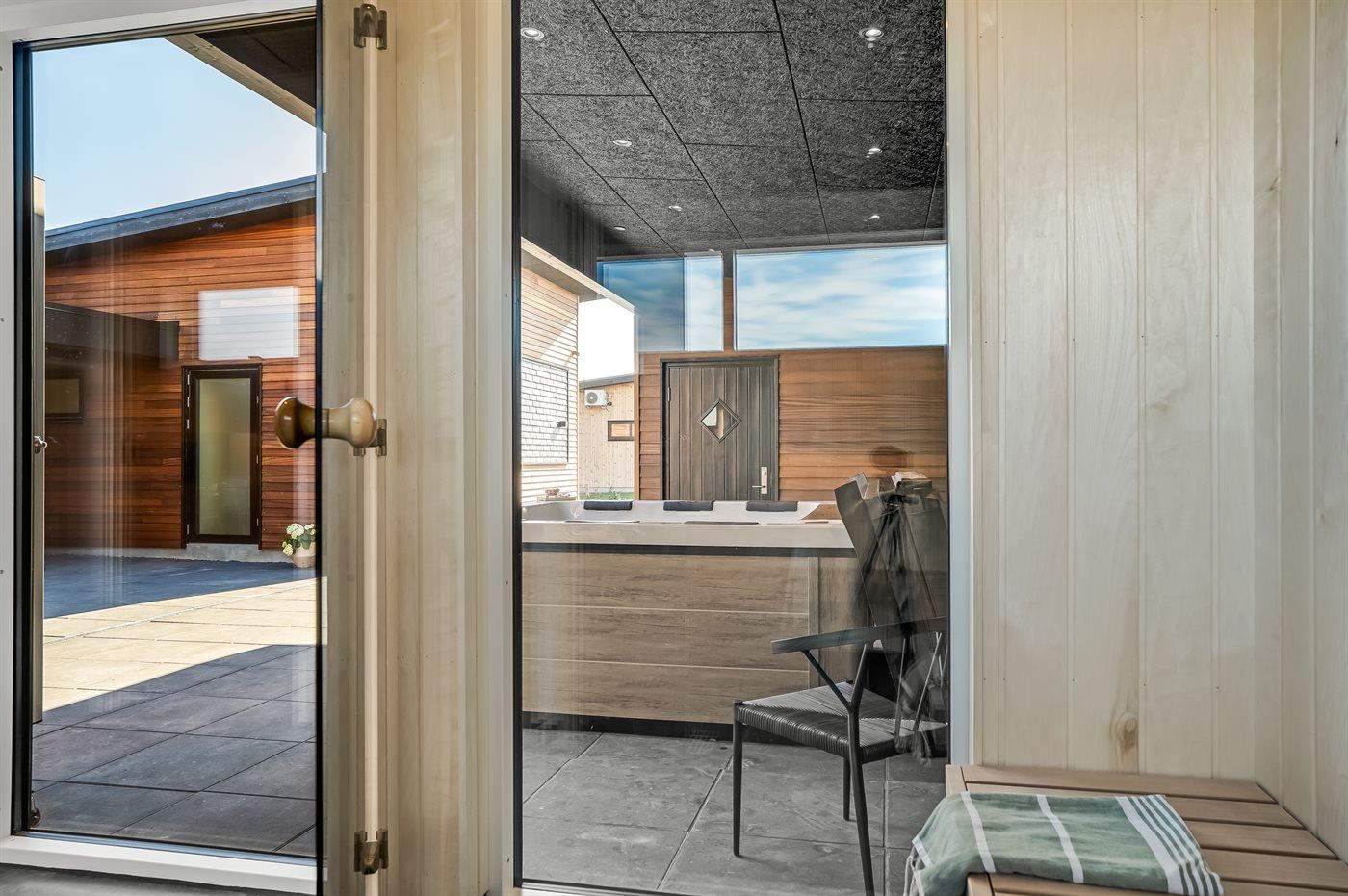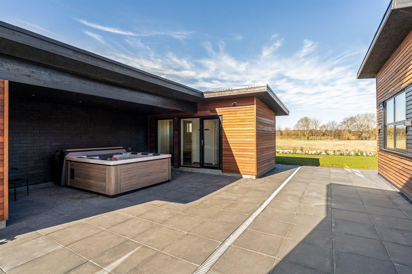 Ekstra bygning med badeværelse, sauna og standspa på terrassen.